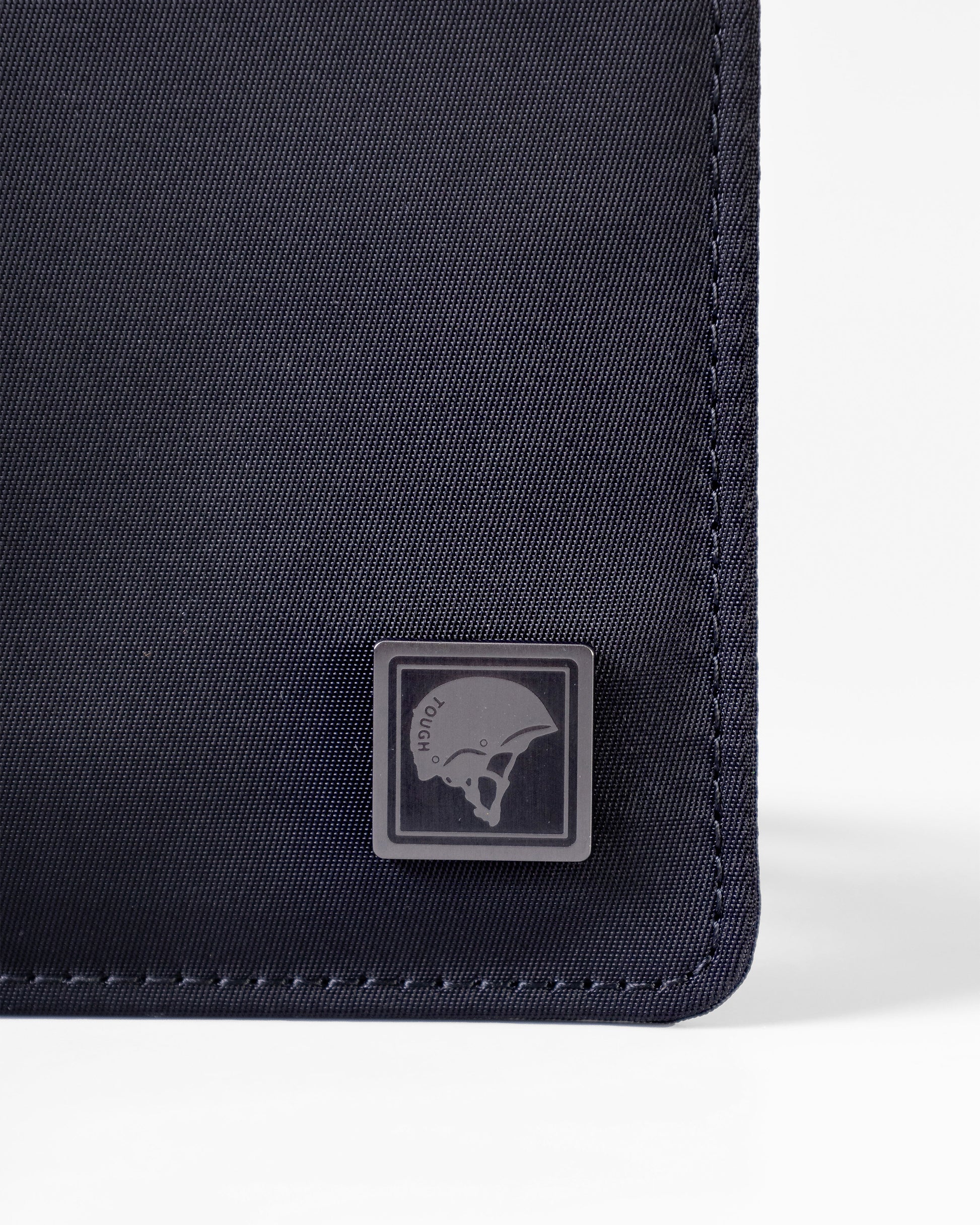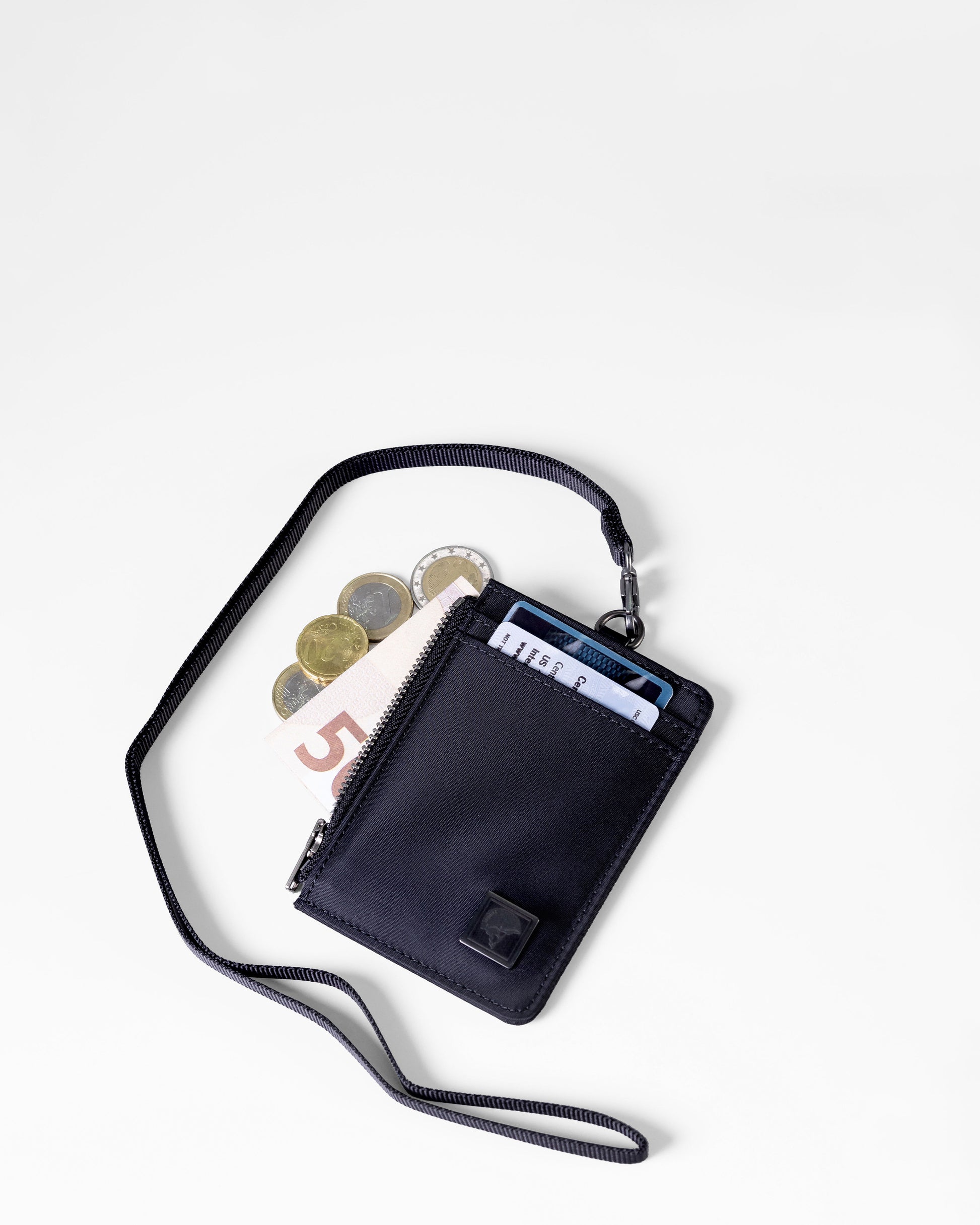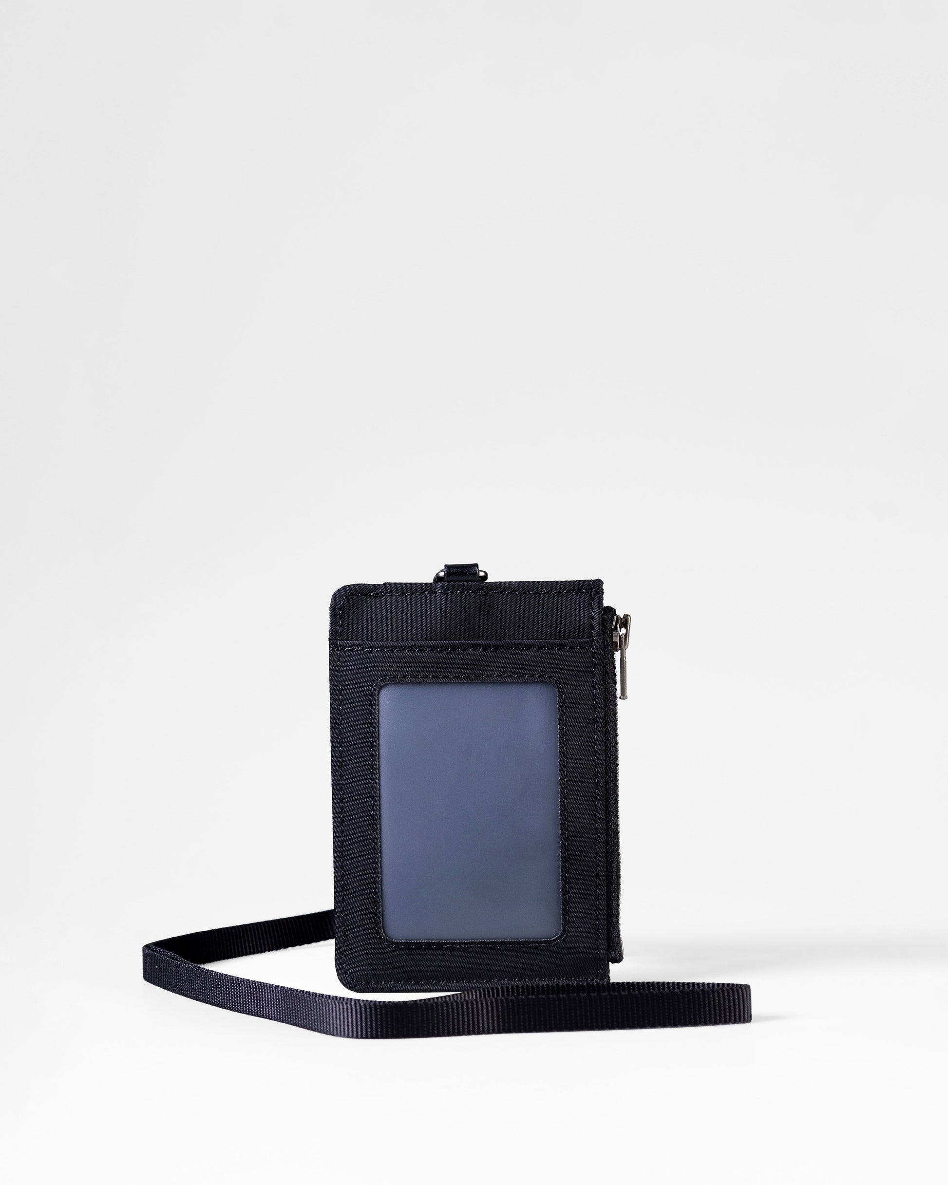 Two card sleeves on the front panel and a zipper pocket on the left side; one photo slot on the back panel; a movable hook strap