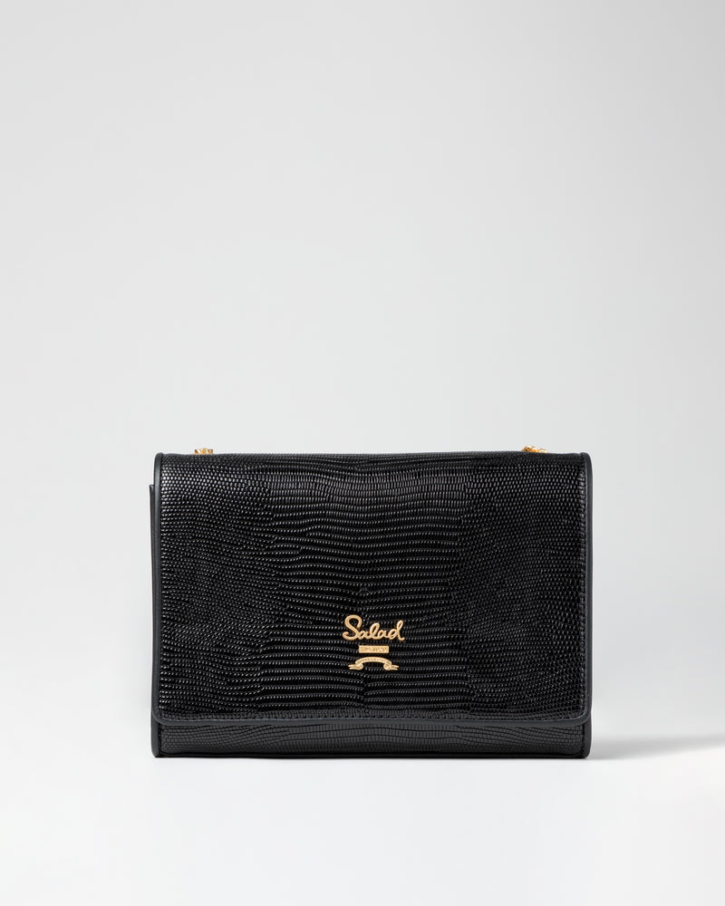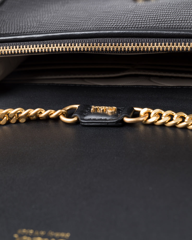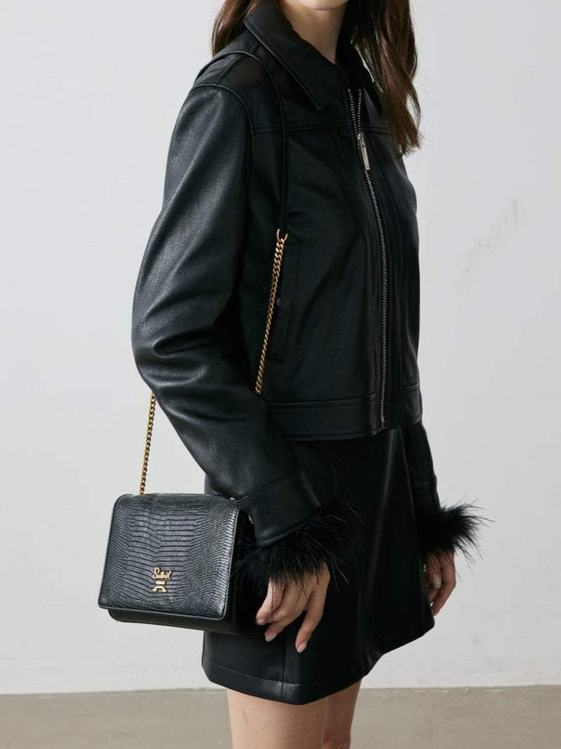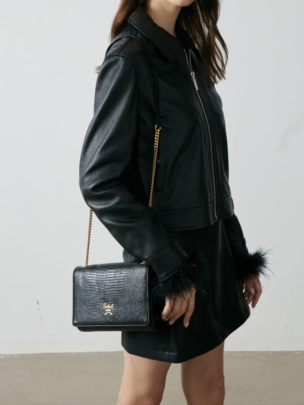 • Flap design with magnetic closure • Interior zip pocket, four credit card slots, side flat pockets, back slip pocket with magnetic closure • Adjustable chain and leather shoulder strap • Main material: Italian-made imitation lizard-embossed cowhide leather, hand-brushed with a yin-yang two-tone effect, making the leather more three-dimensional and transparent