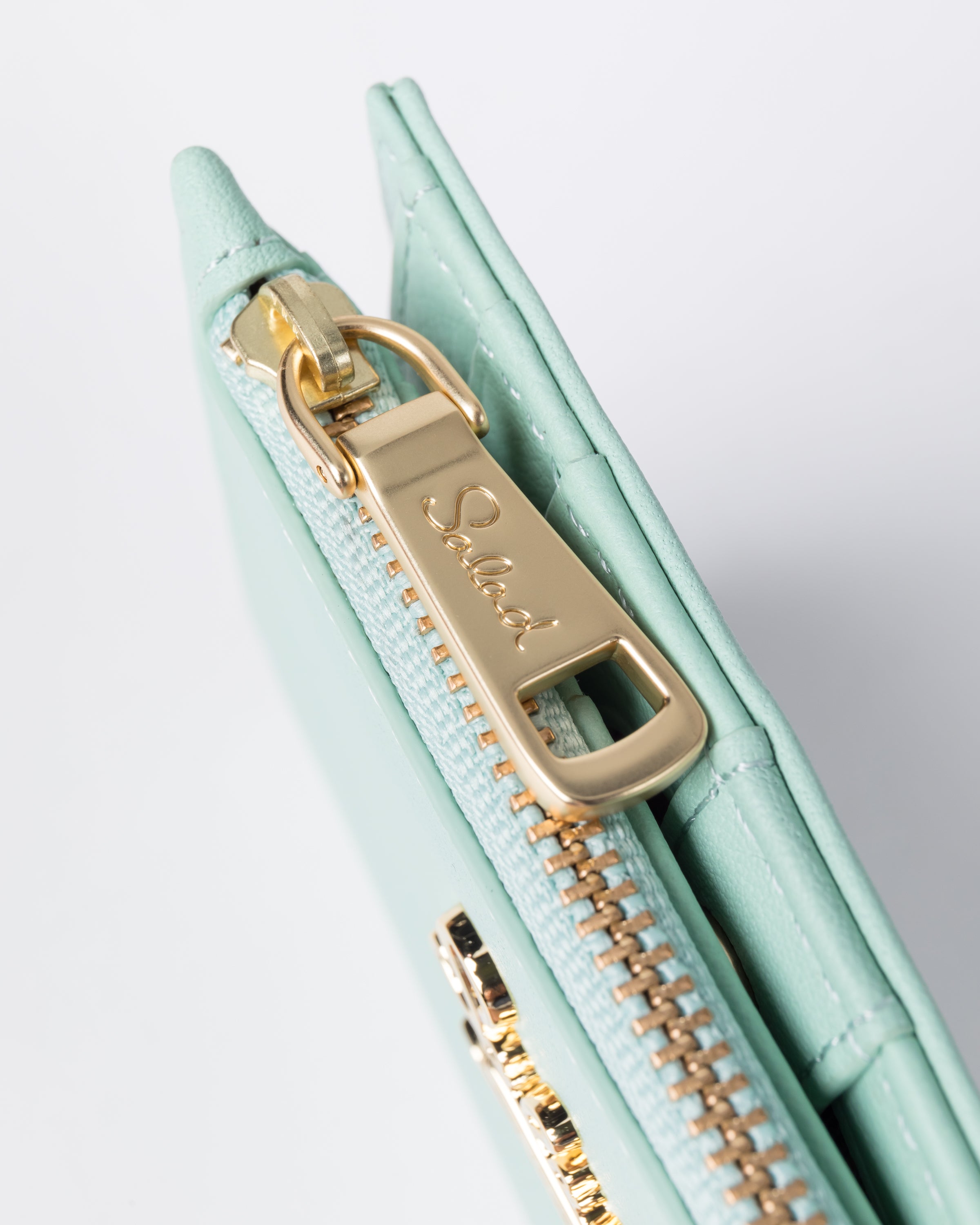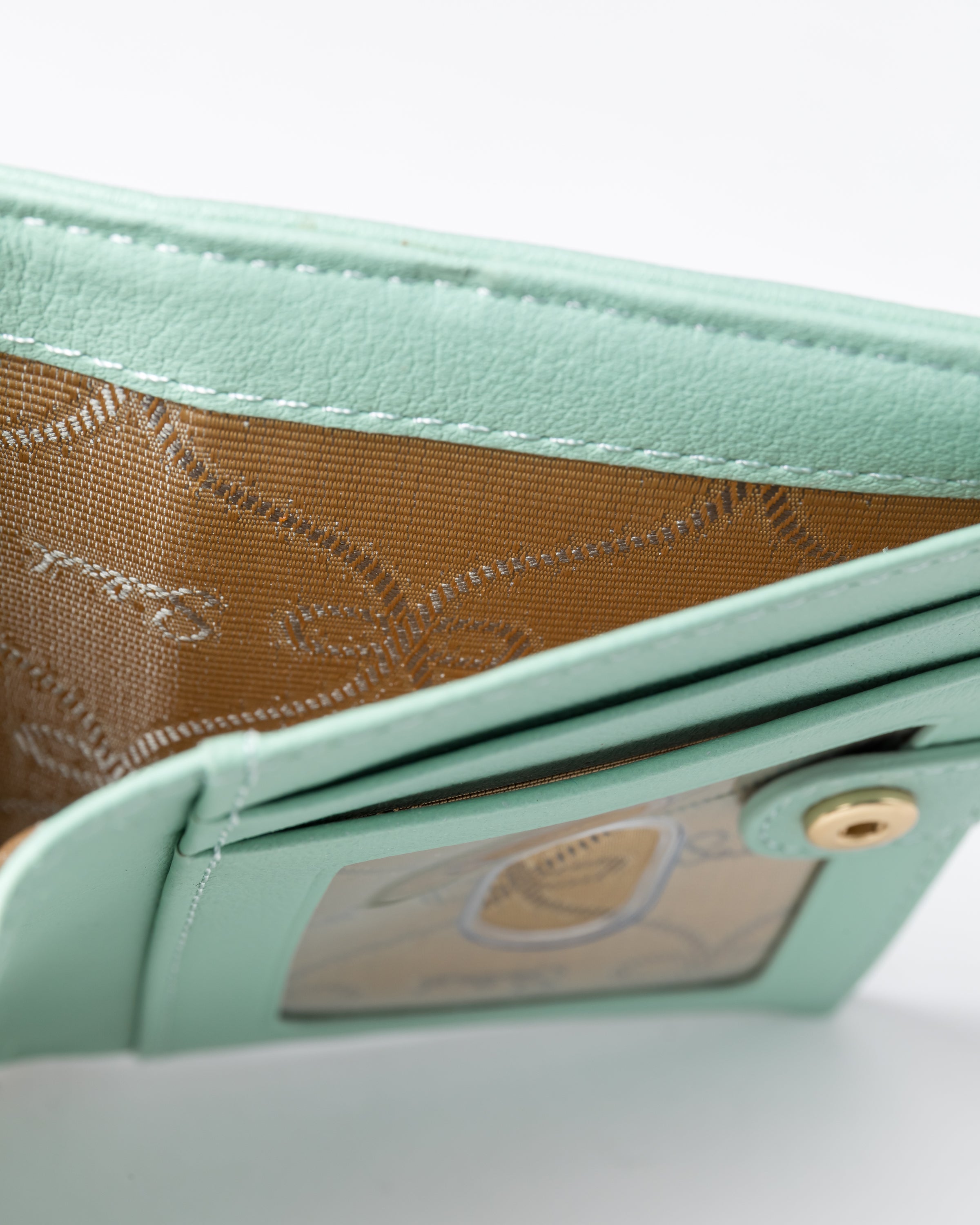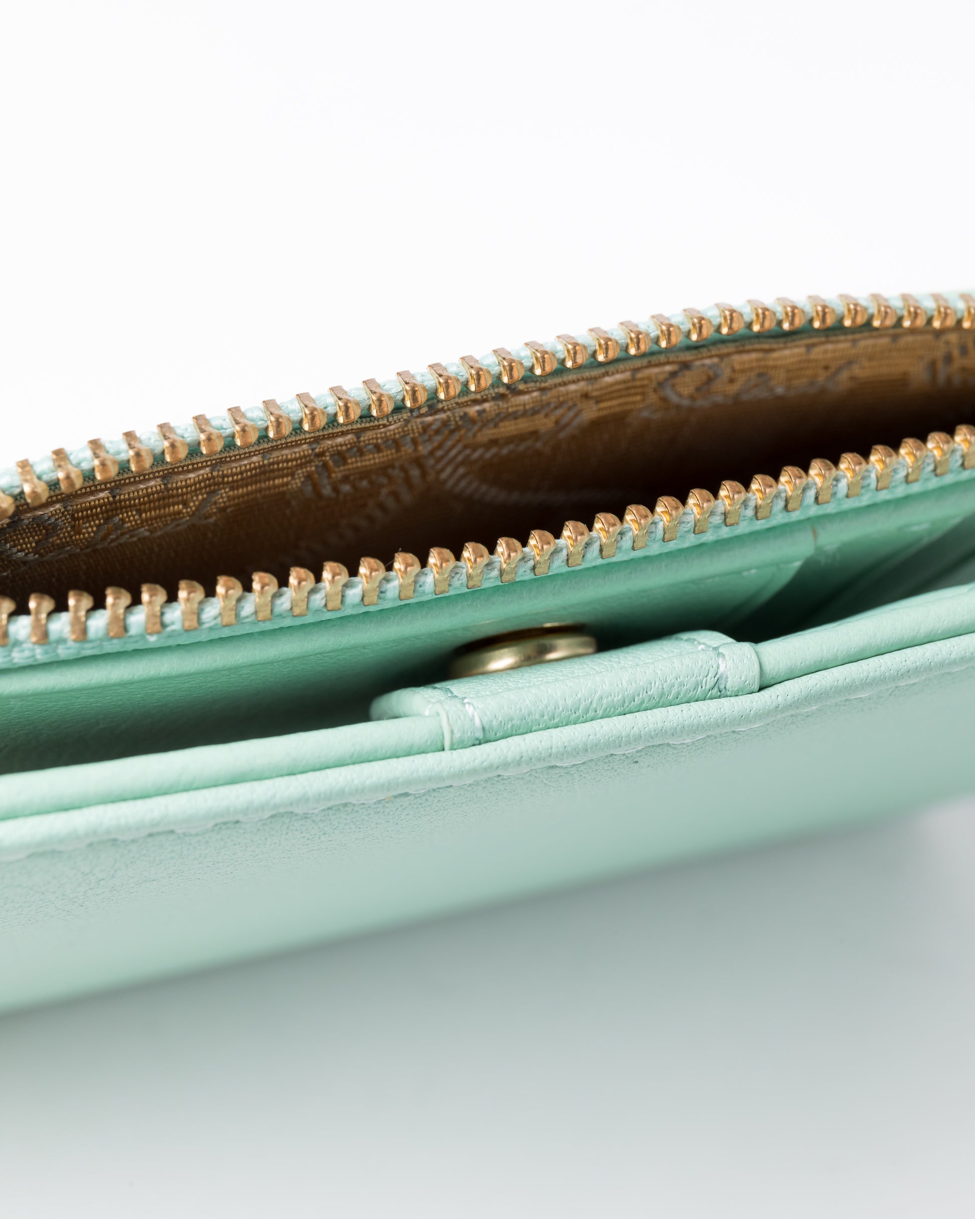 Zippered coin pocket on the top front; inside includes a bill compartment, four credit card compartments, two flat card slots and a photo frame compartment Grained cowhide leather with natural texture and soft feel 11(L) x 2(D) x 9 (height) cm