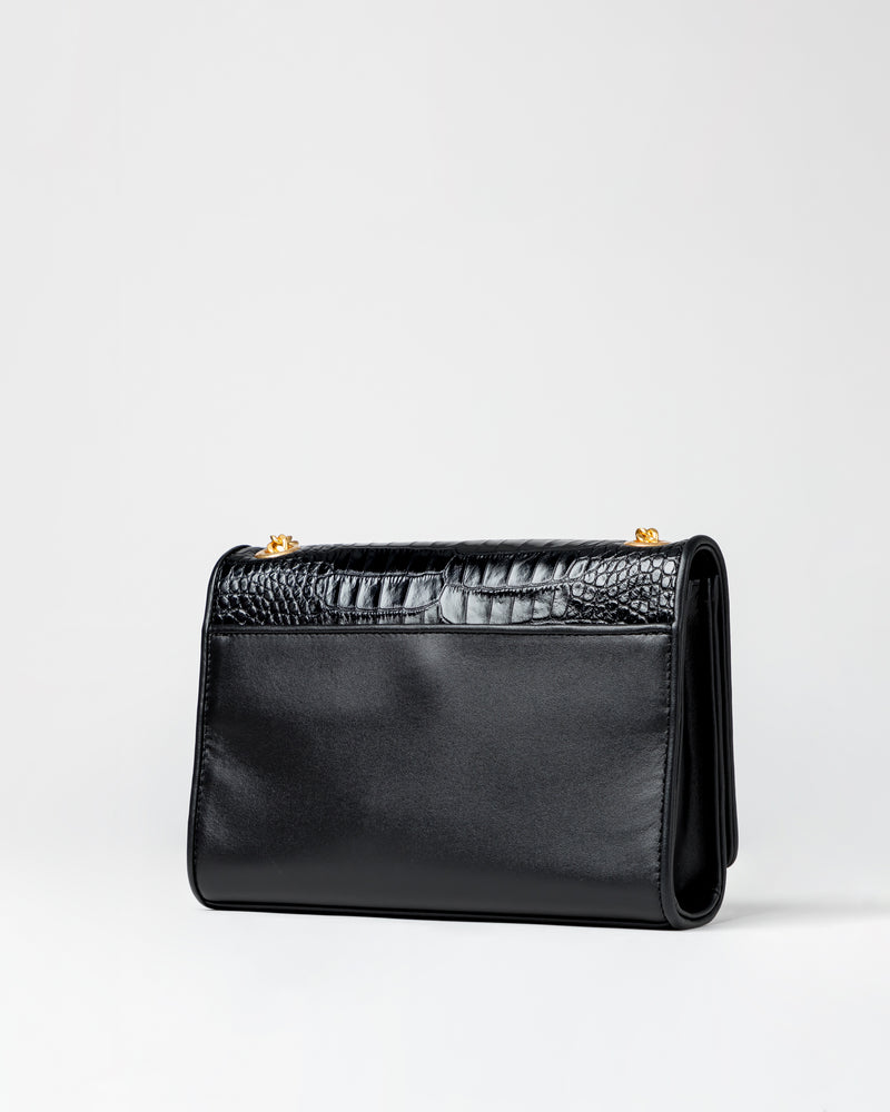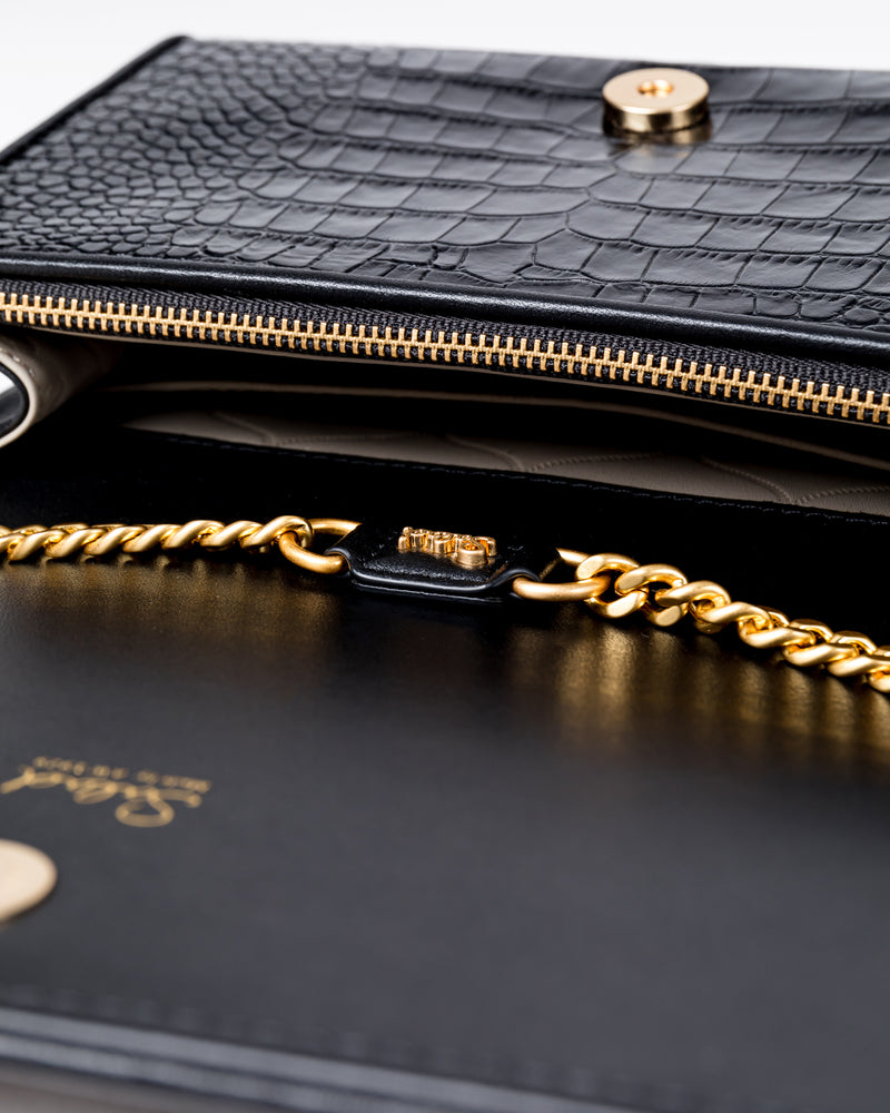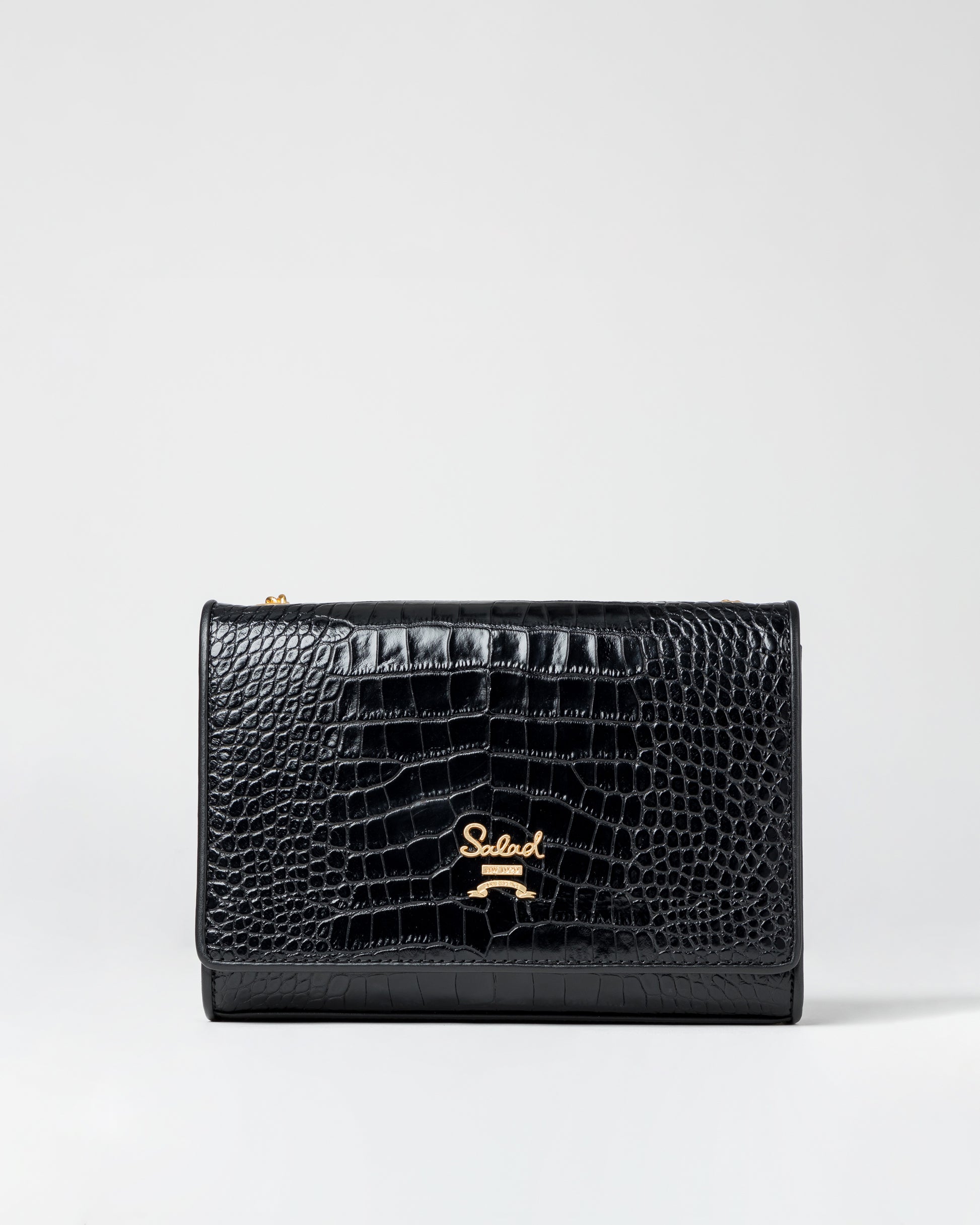 • Flap design with magnetic closure • Full lambskin lining with embossed Salad pattern • Interior zip pocket, four credit card slots, side flat pockets, back magnetic closure • Adjustable leather shoulder strap with chain • Main material: Italian cowhide with crocodile pattern, noble and elegant • Material: Cowhide with less texture on the surface and straight feel