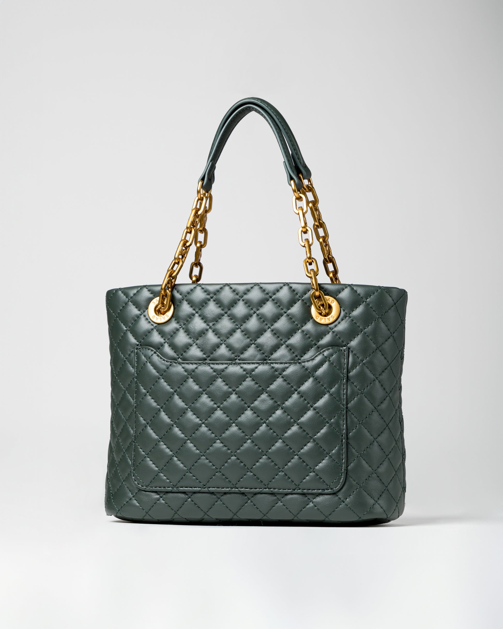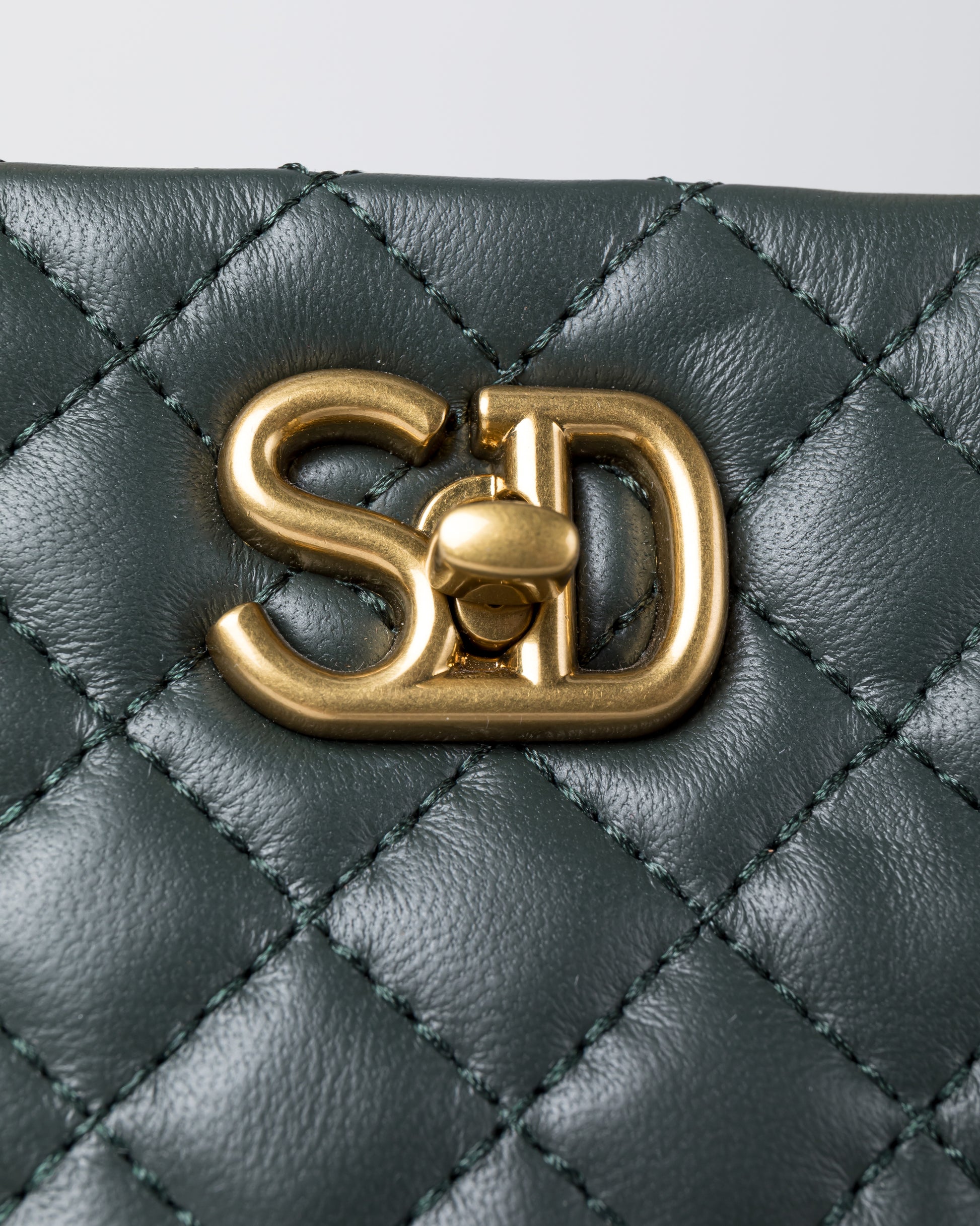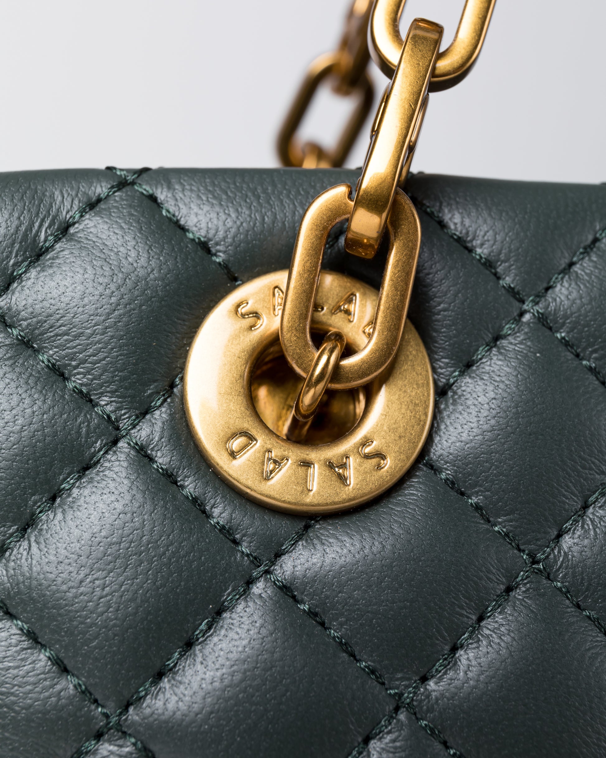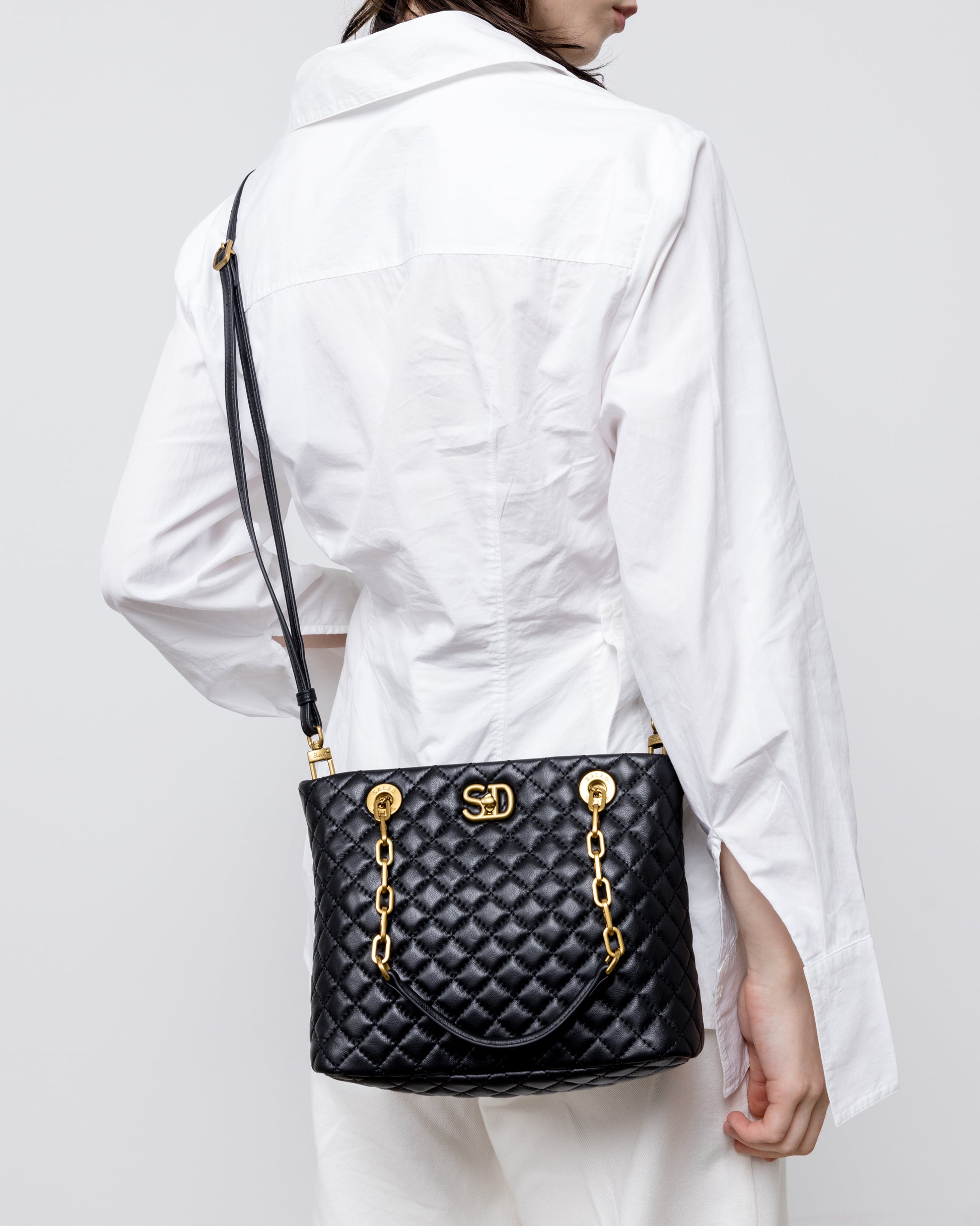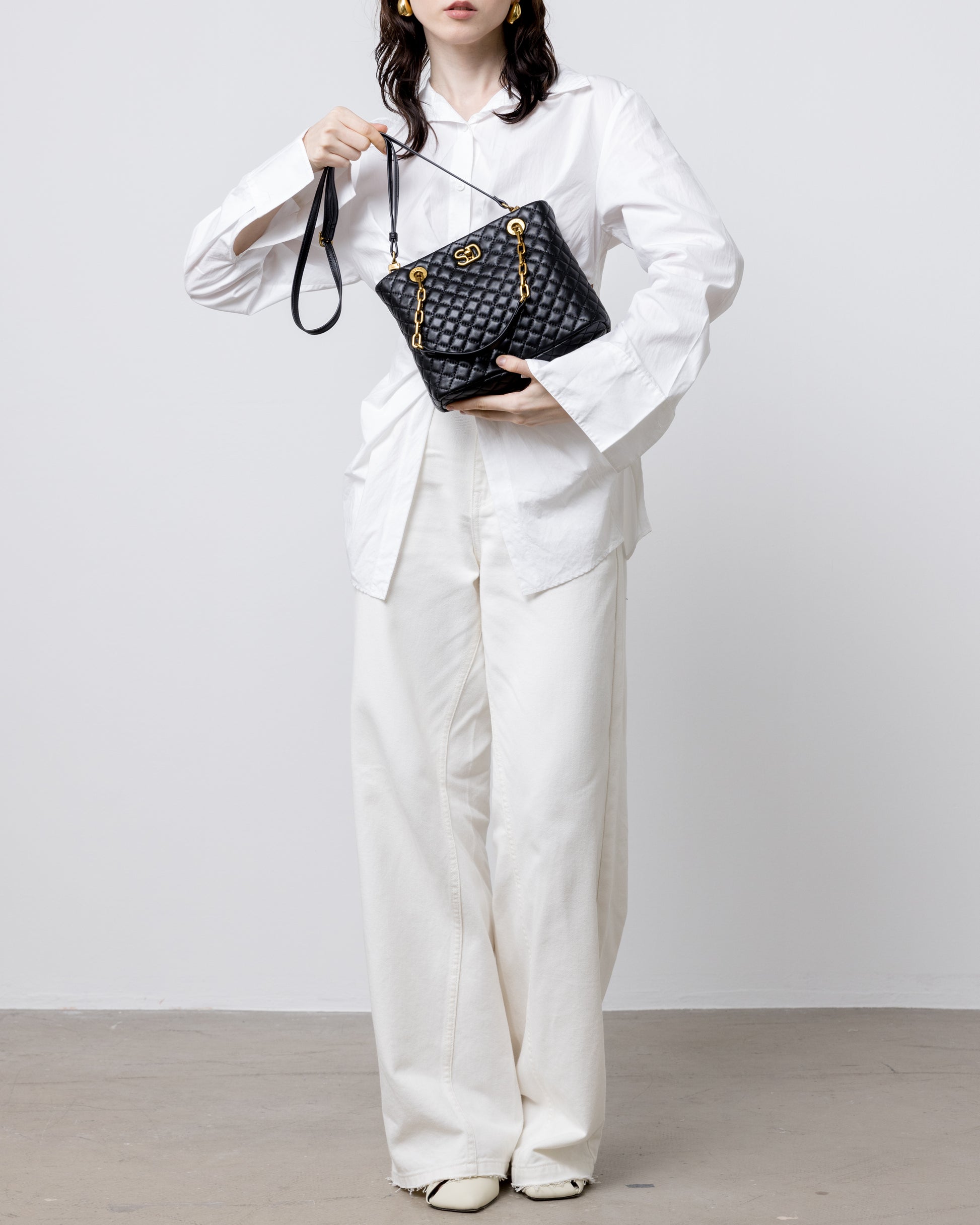 Bag quilted in leather with a quilted leather effect and flap top with twist lock closure; rear slide slip pocket; exclusive chunky ""S"" chain on the handle for added style and personality ; Antique gold-plated metal can enhance scratch resistance; Detachable and adjustable long shoulder strap, tailless design, more convenient and smooth when using Selected natural smooth lambskin, with soft touch and smooth and delicate Textured and extra light 22.9(L) x 10.2(D) x 17.1(H) cm Strap Length: 105.4 - 124.5 cm Strap Mid Height: 62.25 cm Handle Height: 43.2 cm