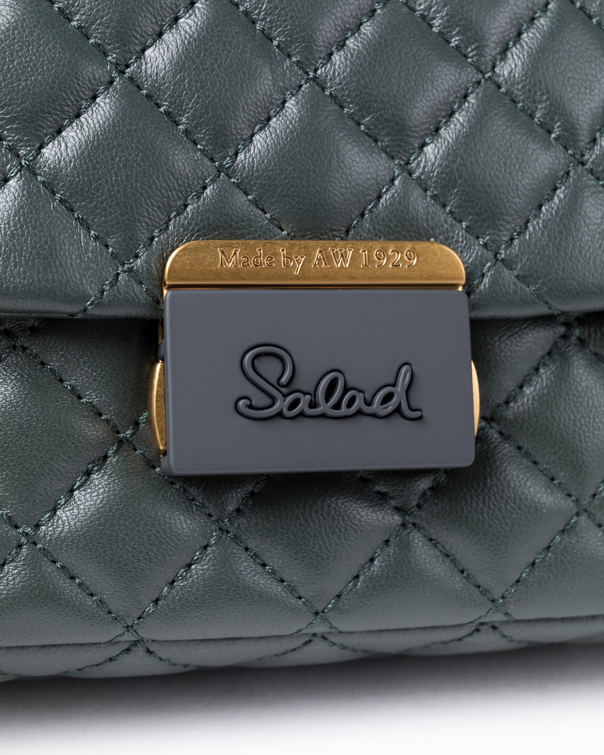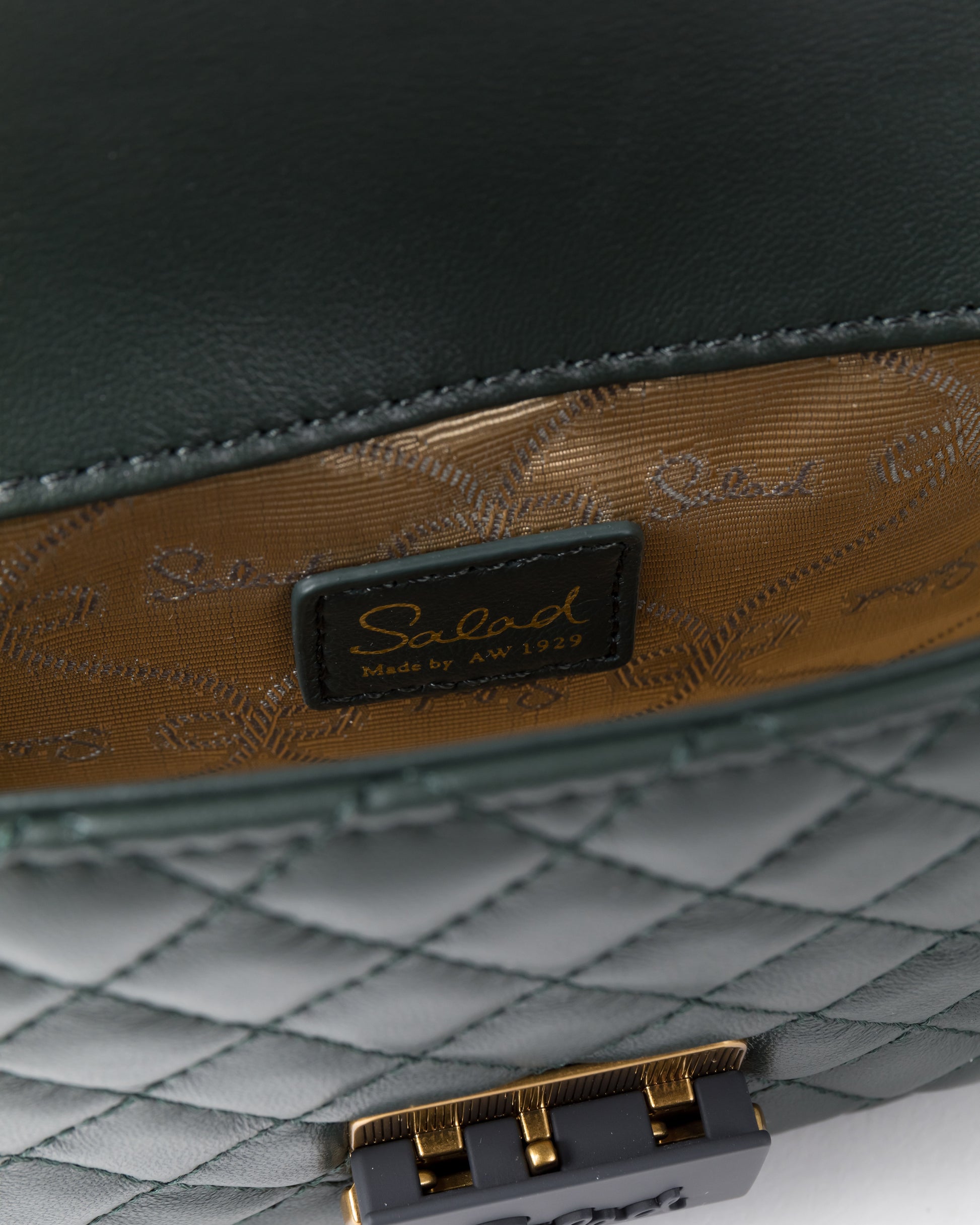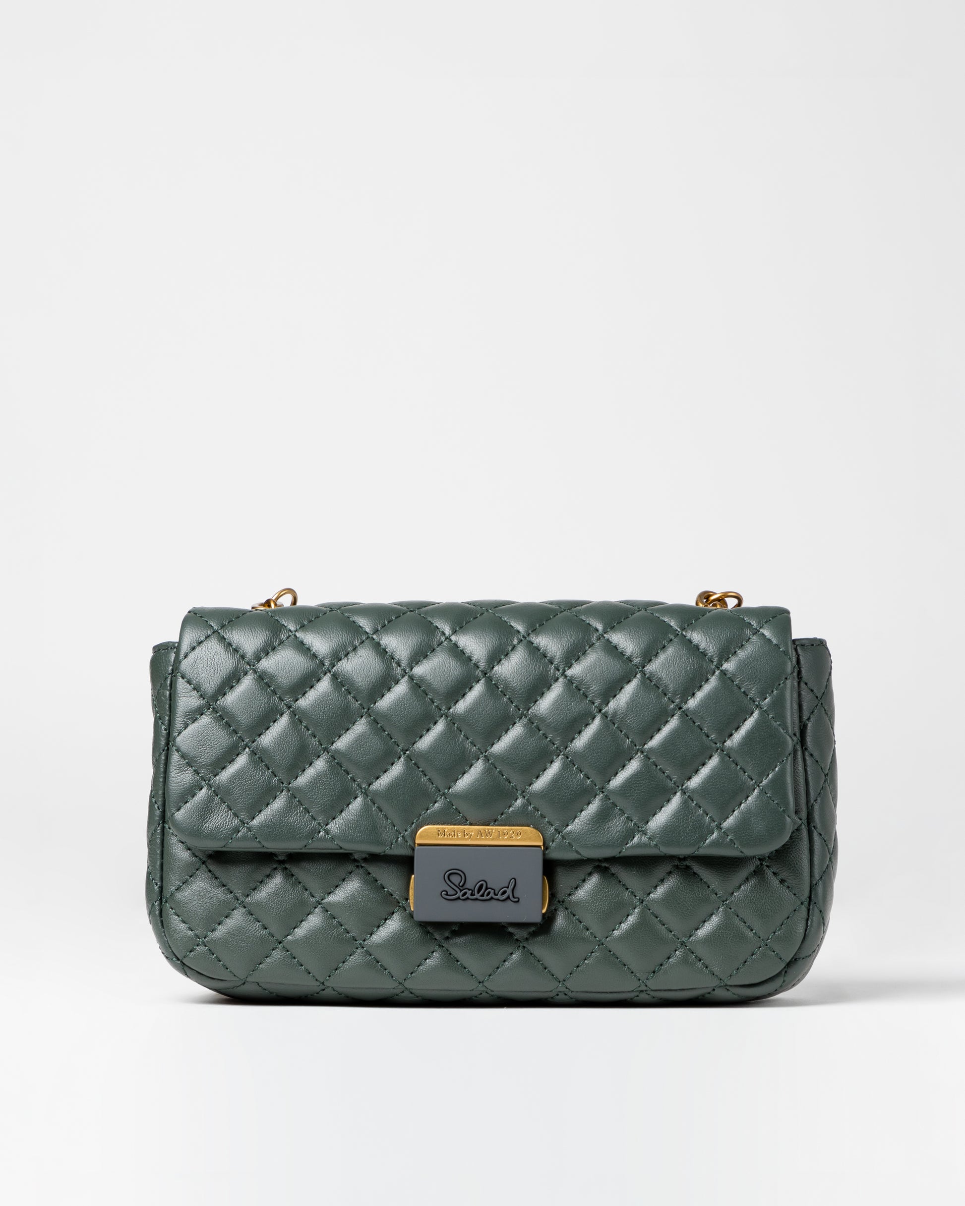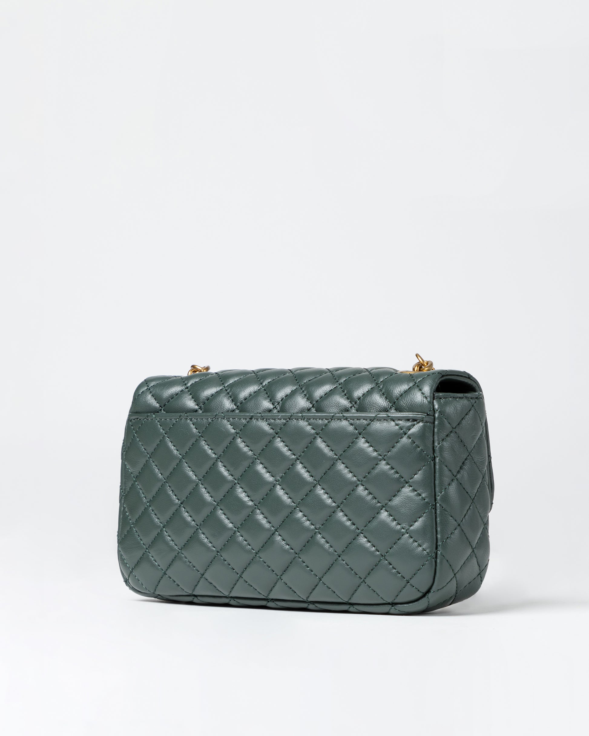 • Diamond quilted effect with champagne and rubber-colored plated metal push-lock front flap