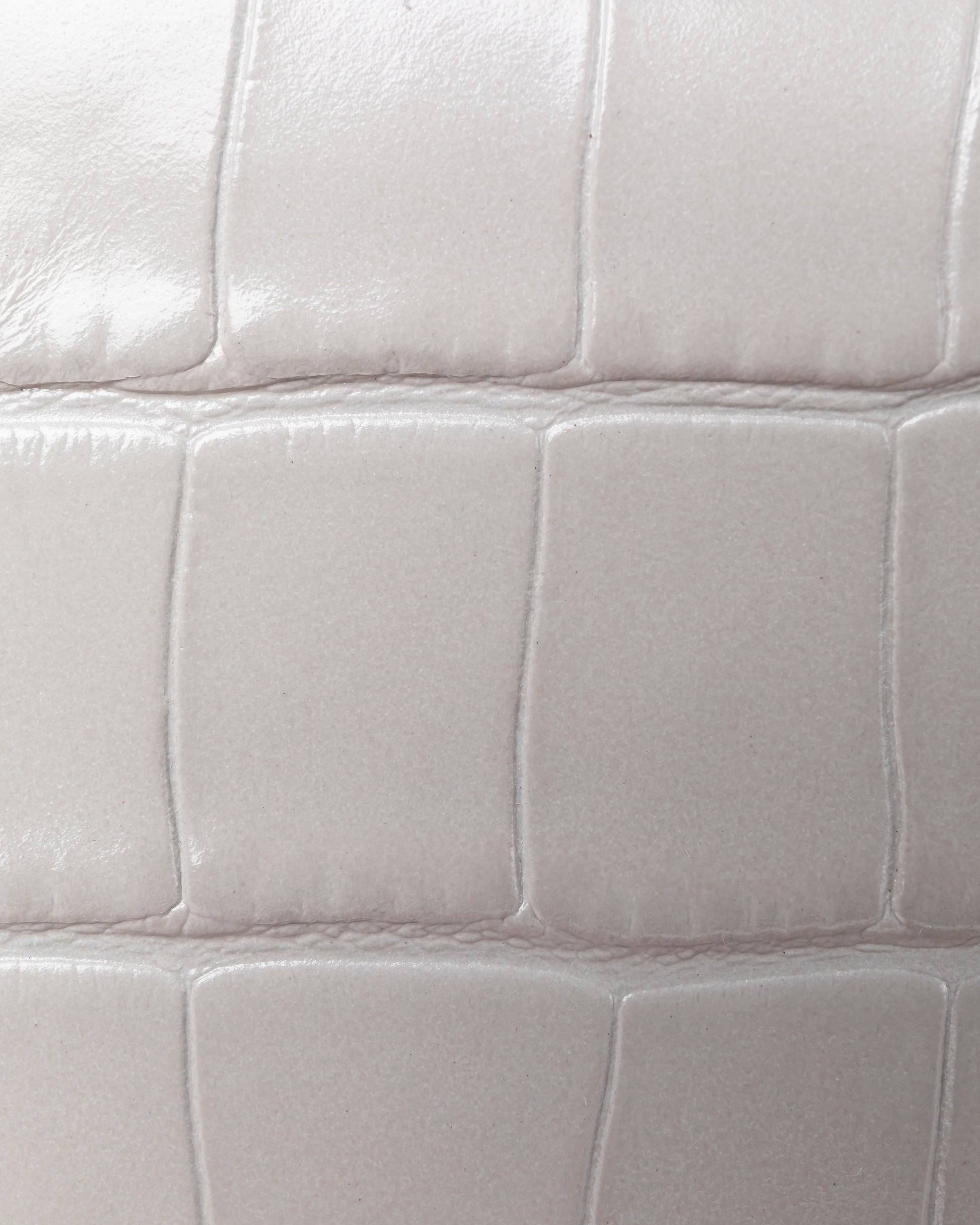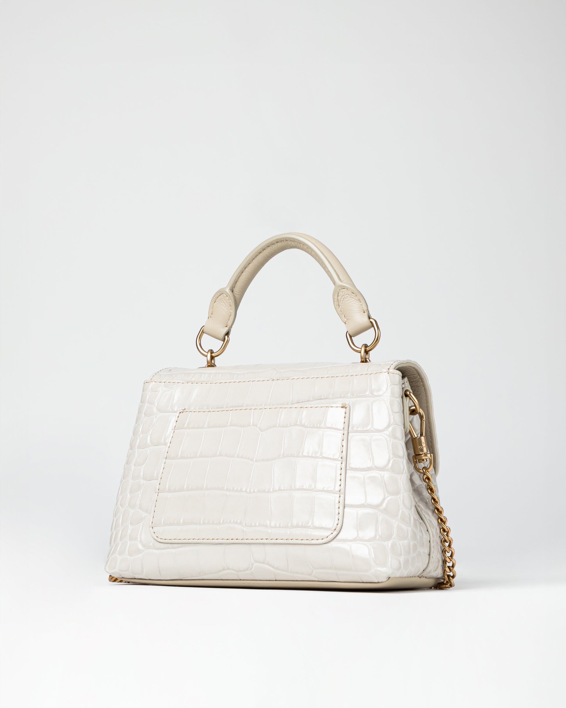 Metal push-button front flap, slip pocket in the center of the inner compartment, slip pocket on the back; adjustable chain leather shoulder strap Main material: cowhide made in Italy, embossed with crocodile flower effect, feeling noble and elegant; 20.5 (length )x 9(D)x 14(H) cm Shoulder Strap Length: 85 - 118 cm Shoulder Strap Middle Height: 59 cm Handle Height: 24.8 cm