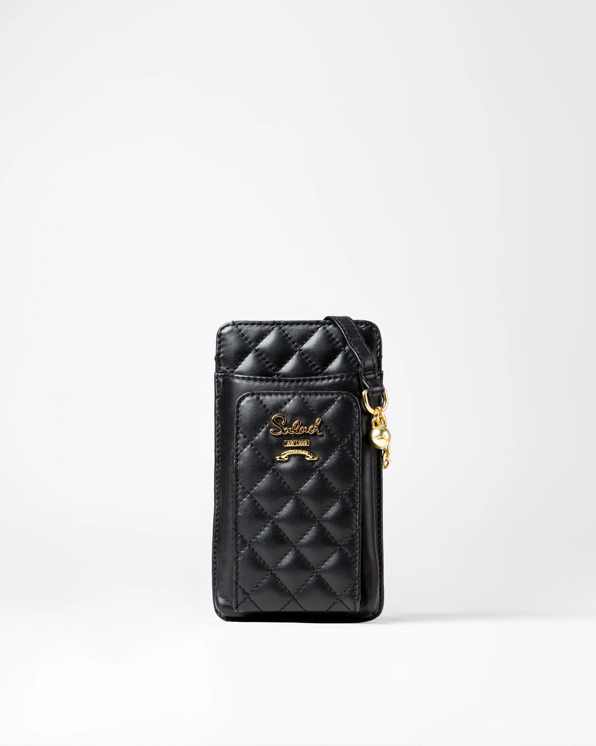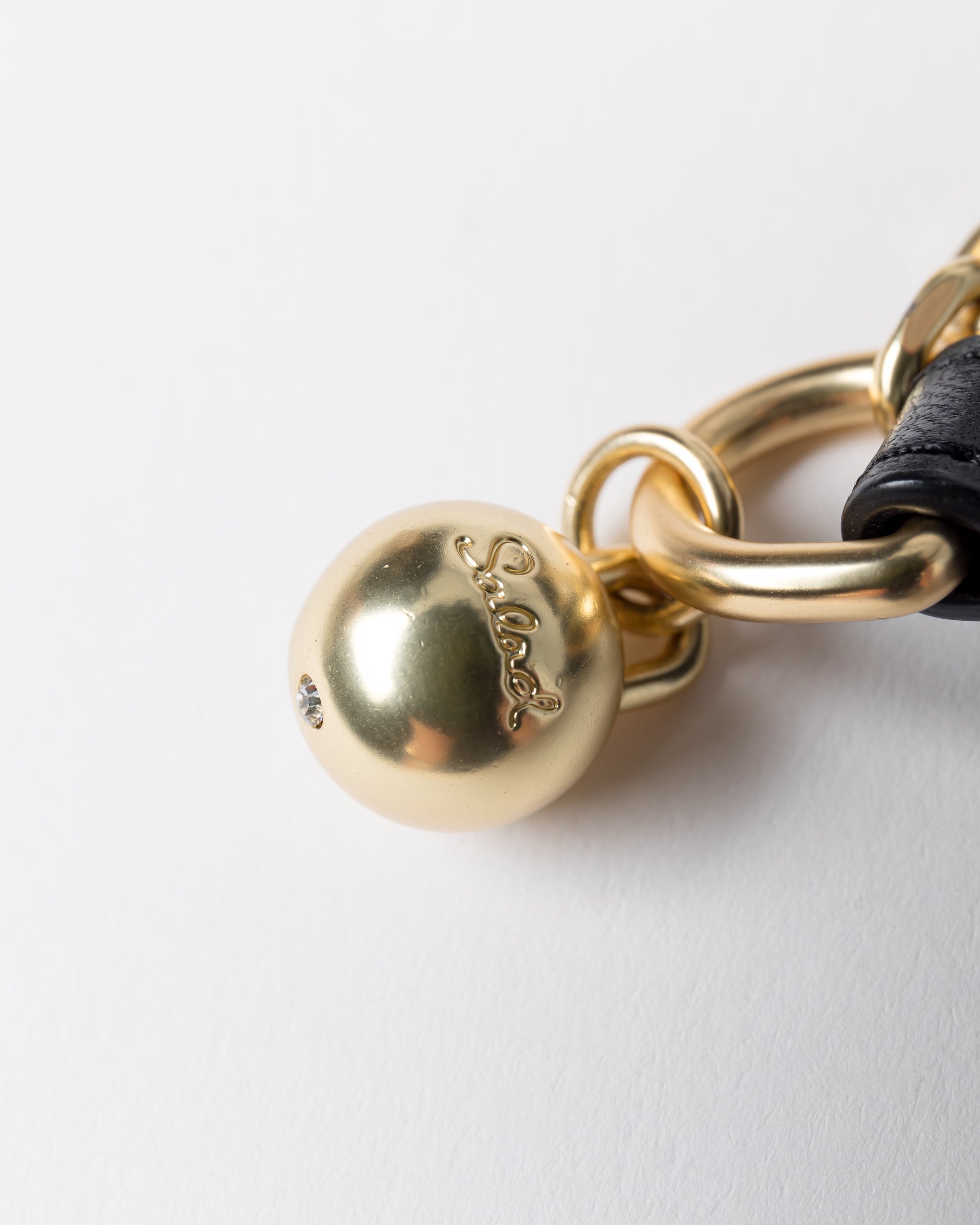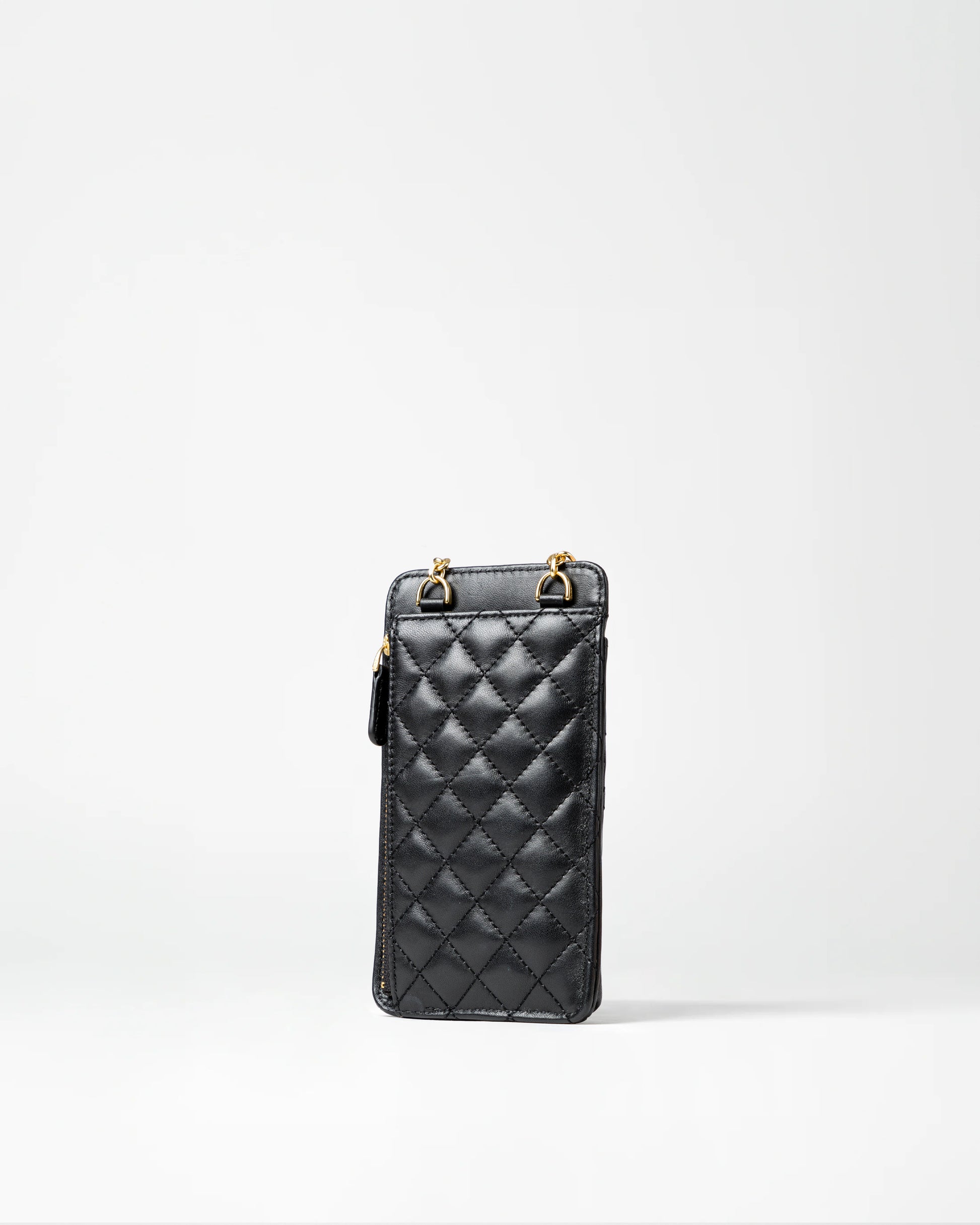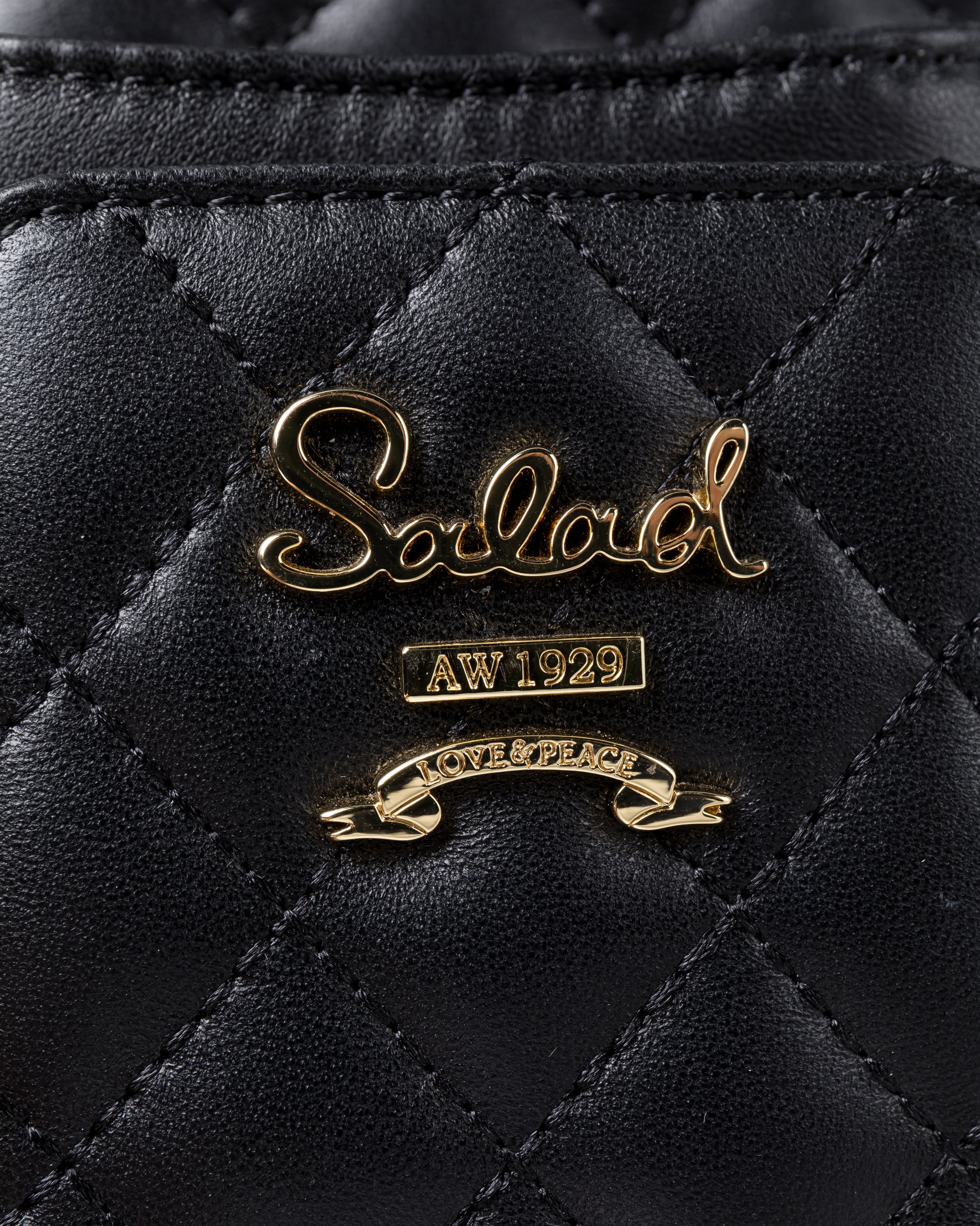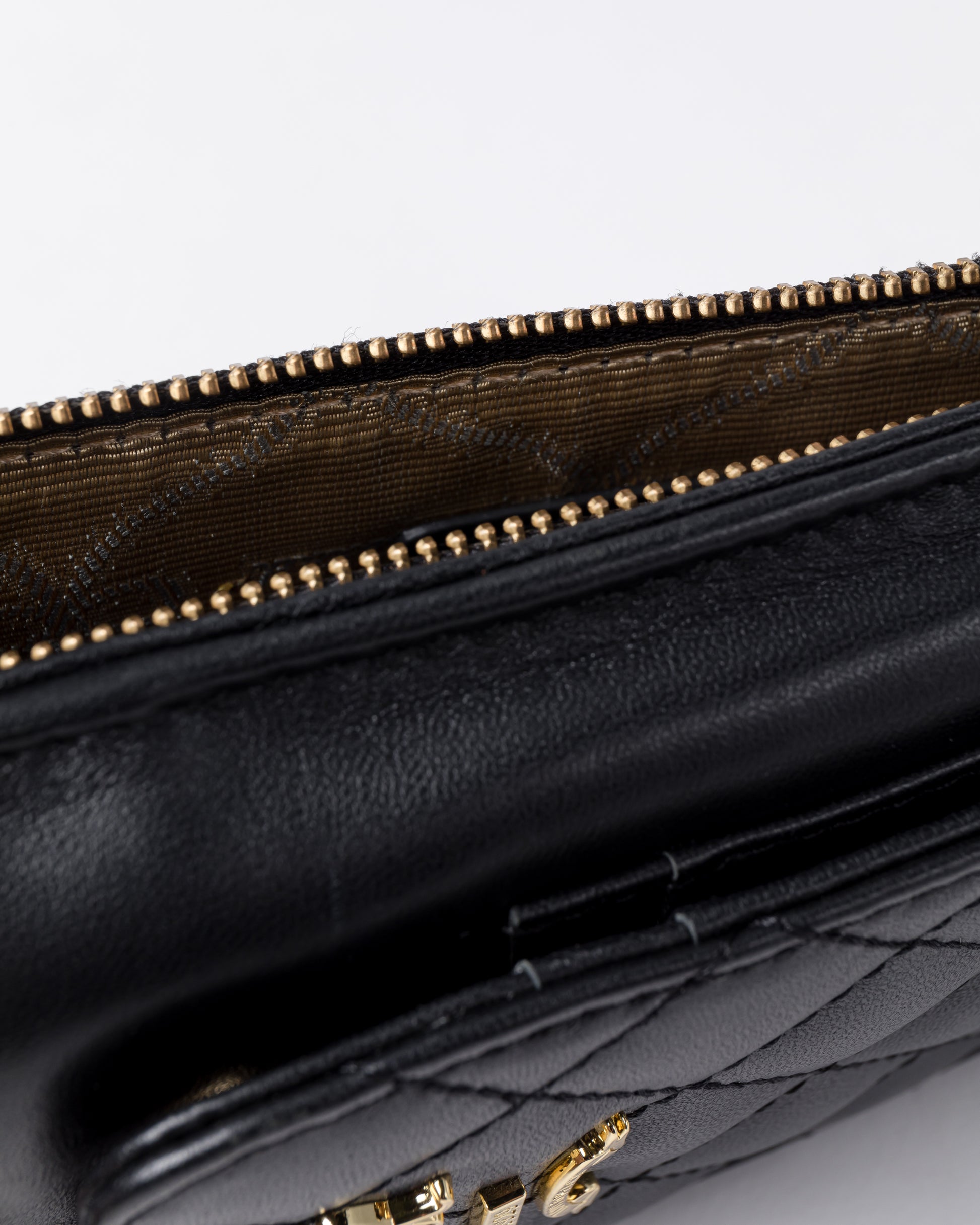quilted leather effect on the face; 4 card slots on the front panel with push-button closures and a zipped pocket on the back panel for cards; adjustable shoulder strap in leather with chains;