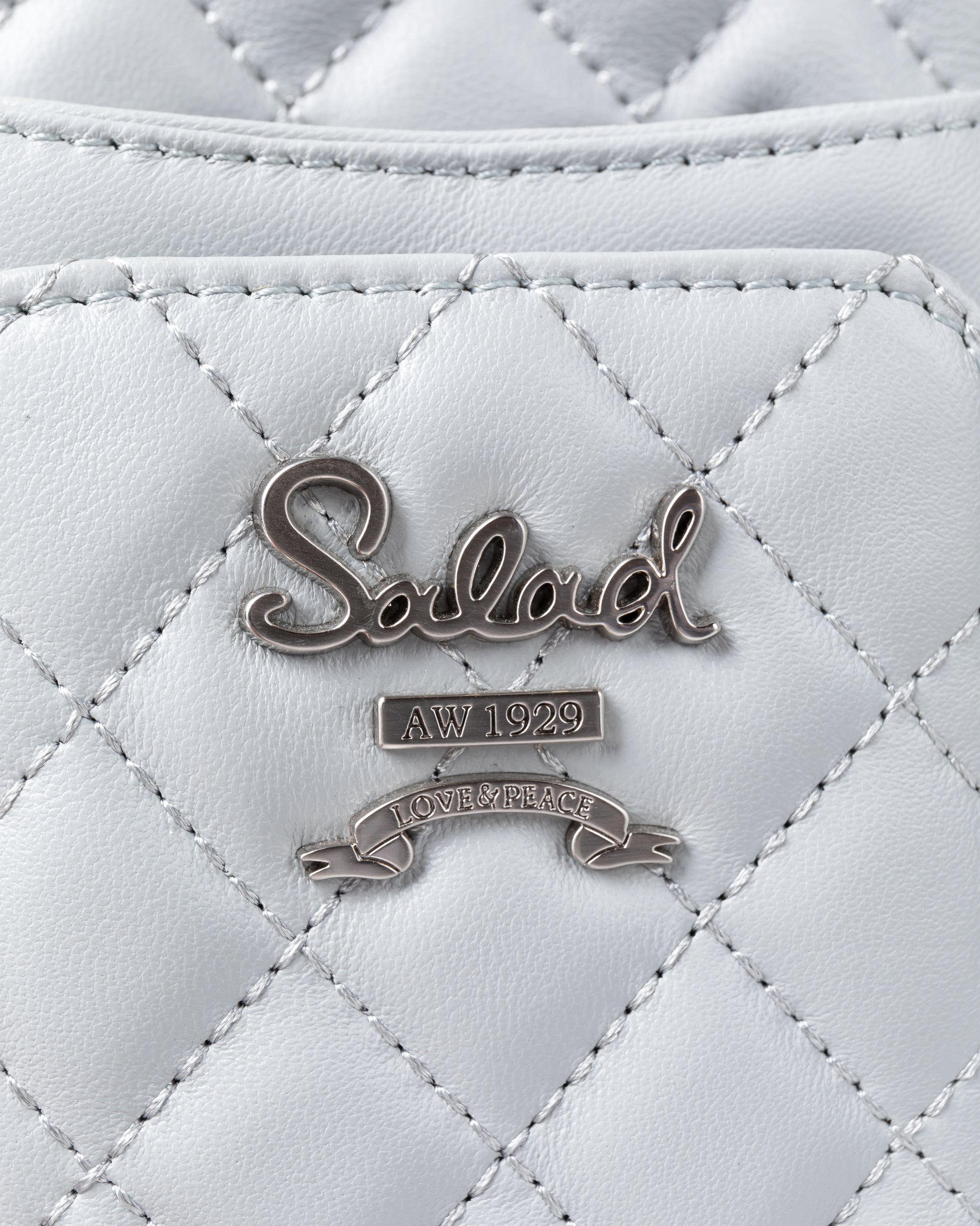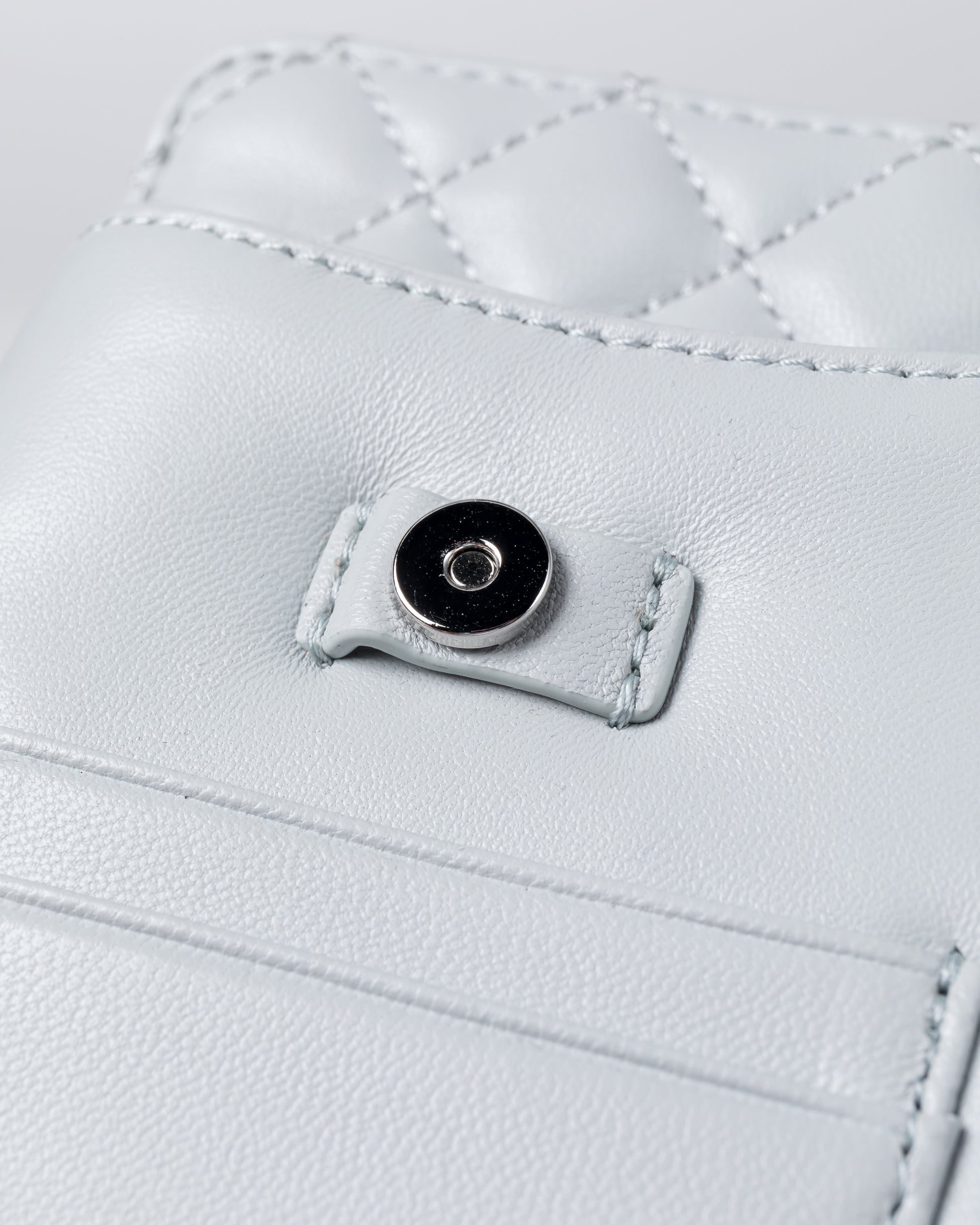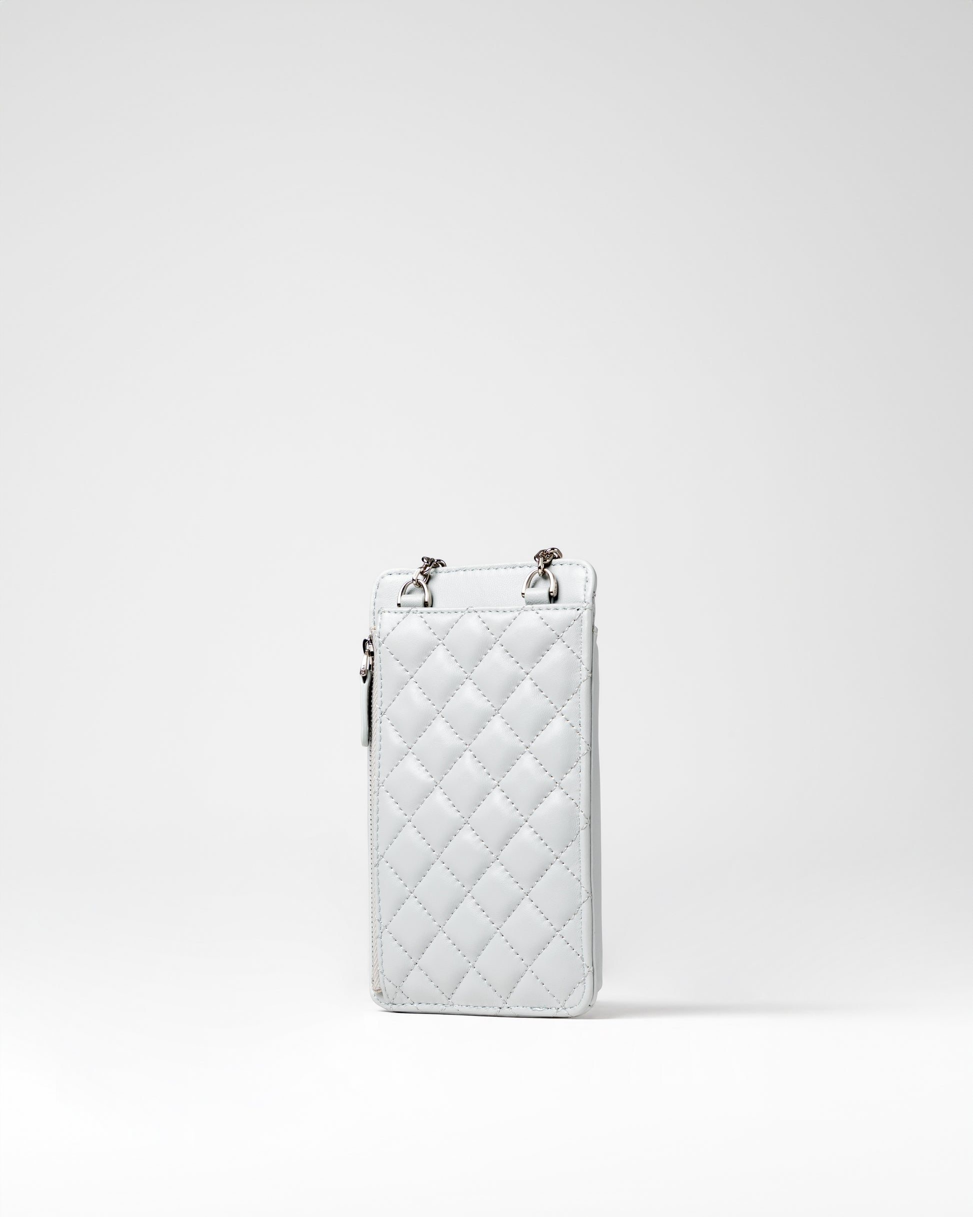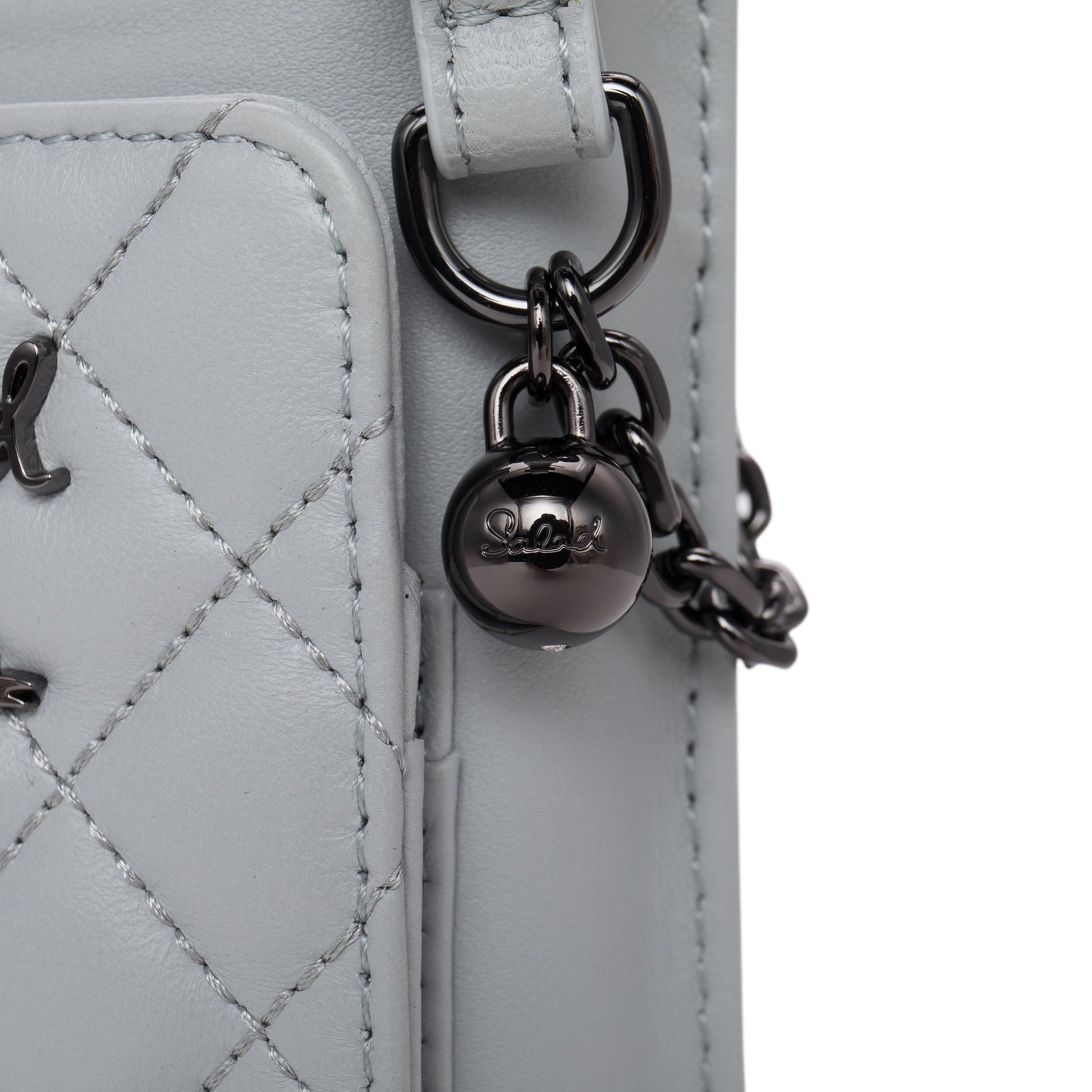 quilted leather effect on the face; 4 card slots on the front panel with push-button closures and a zipped pocket on the back panel for cards; adjustable shoulder strap in leather with chains;