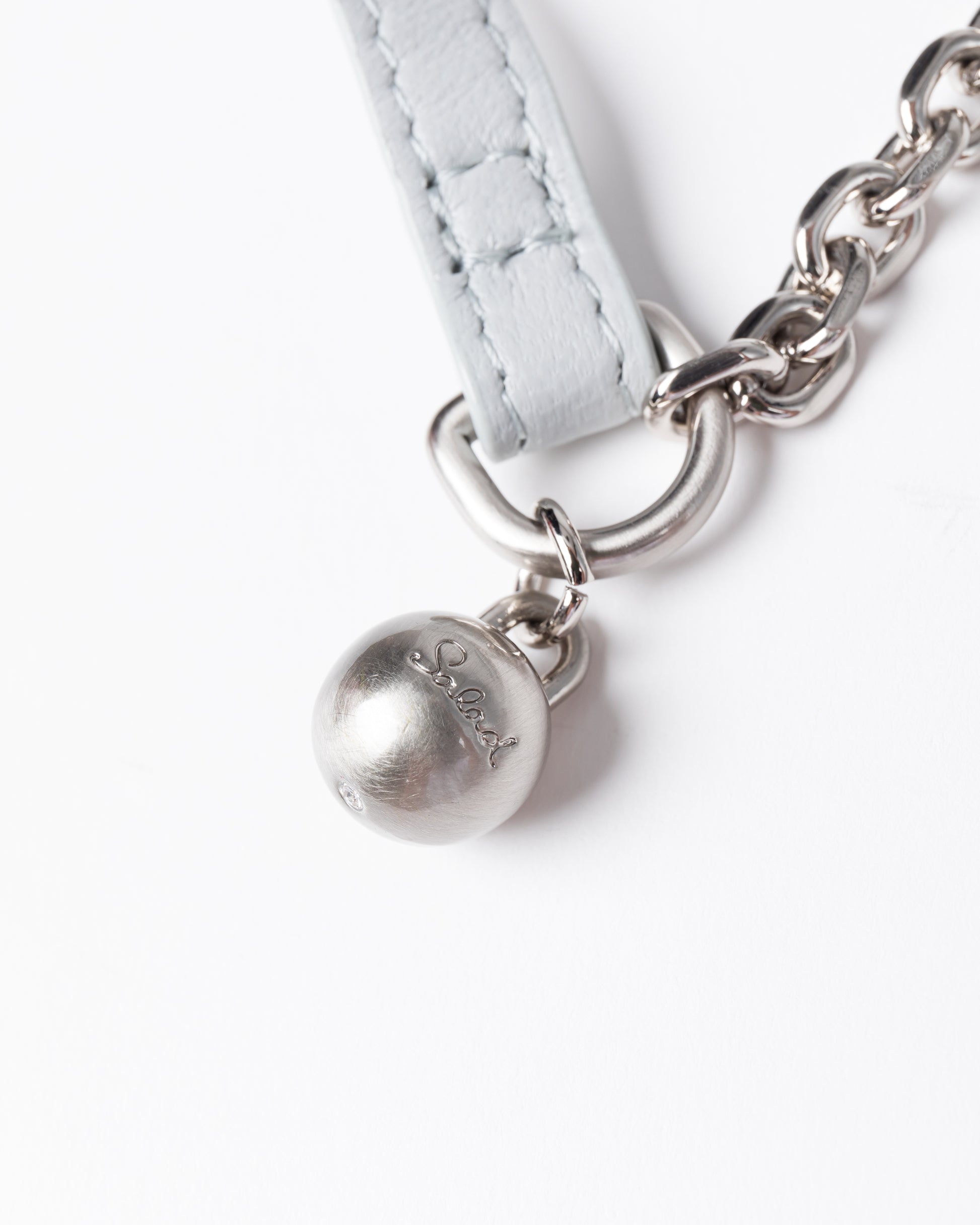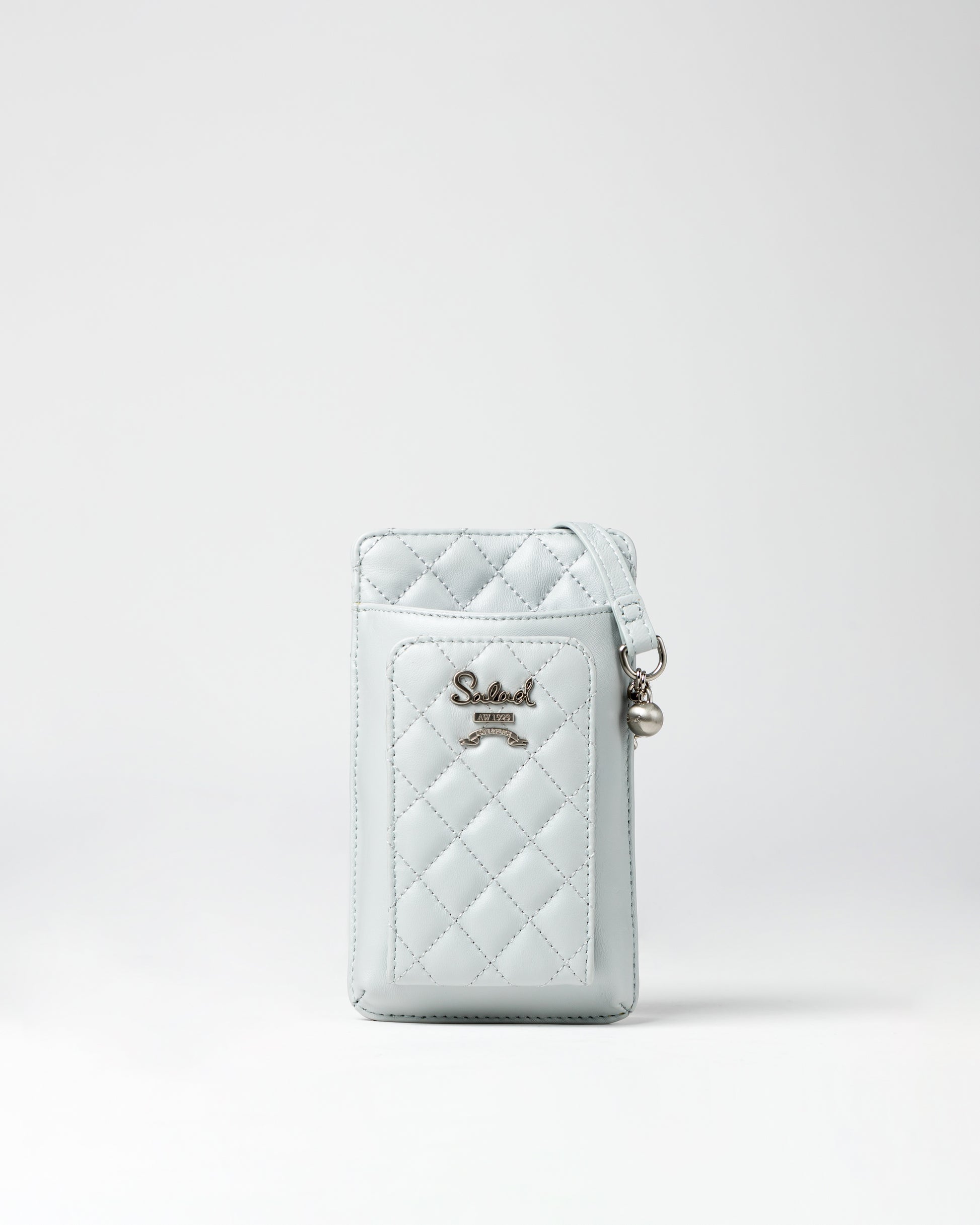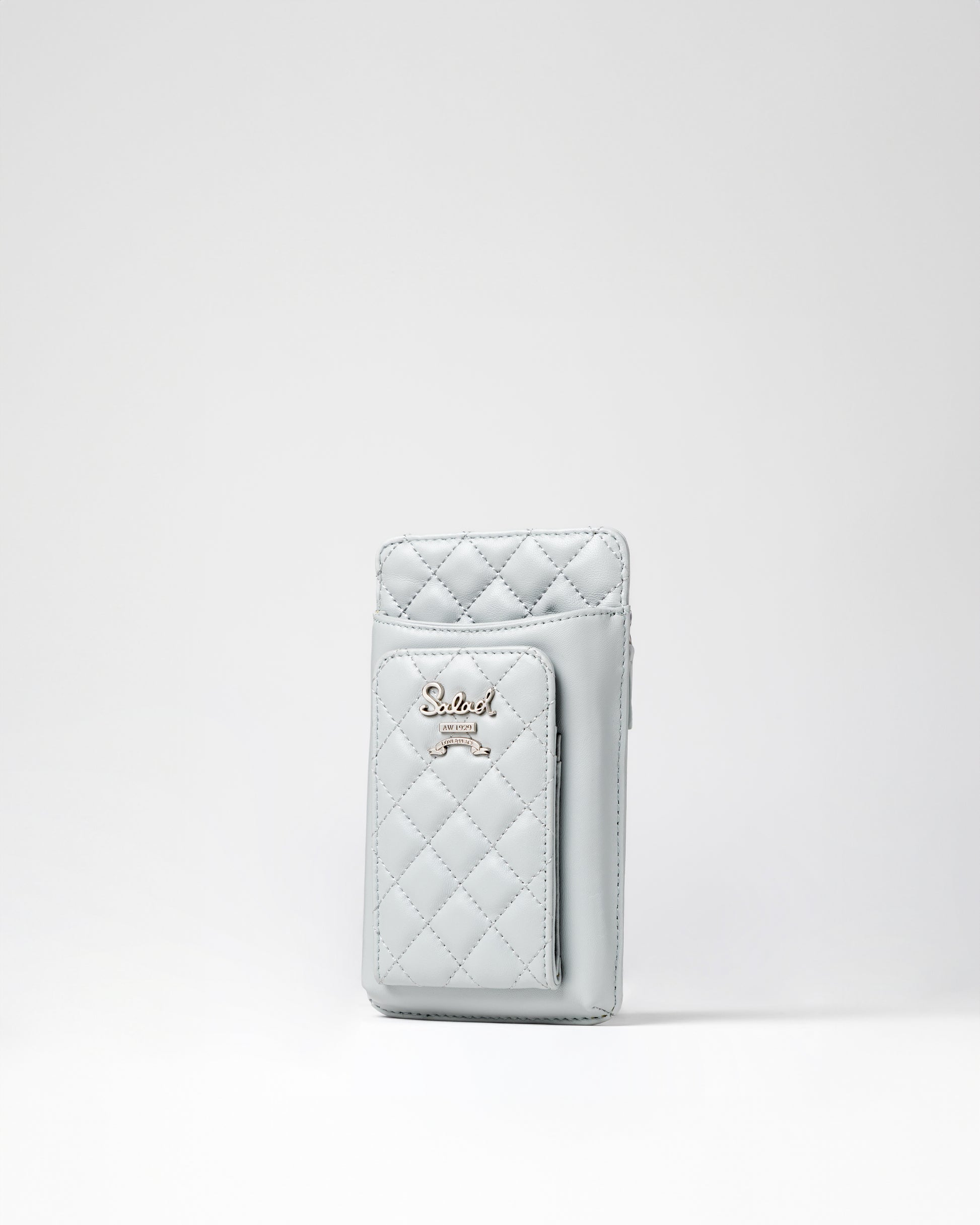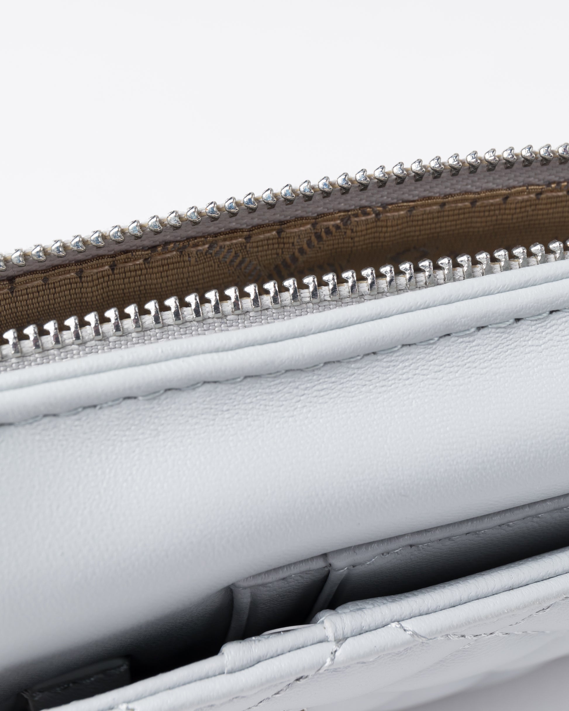 quilted leather effect on the face; 4 card slots on the front panel with push-button closures and a zipped pocket on the back panel for cards; adjustable shoulder strap in leather with chains;