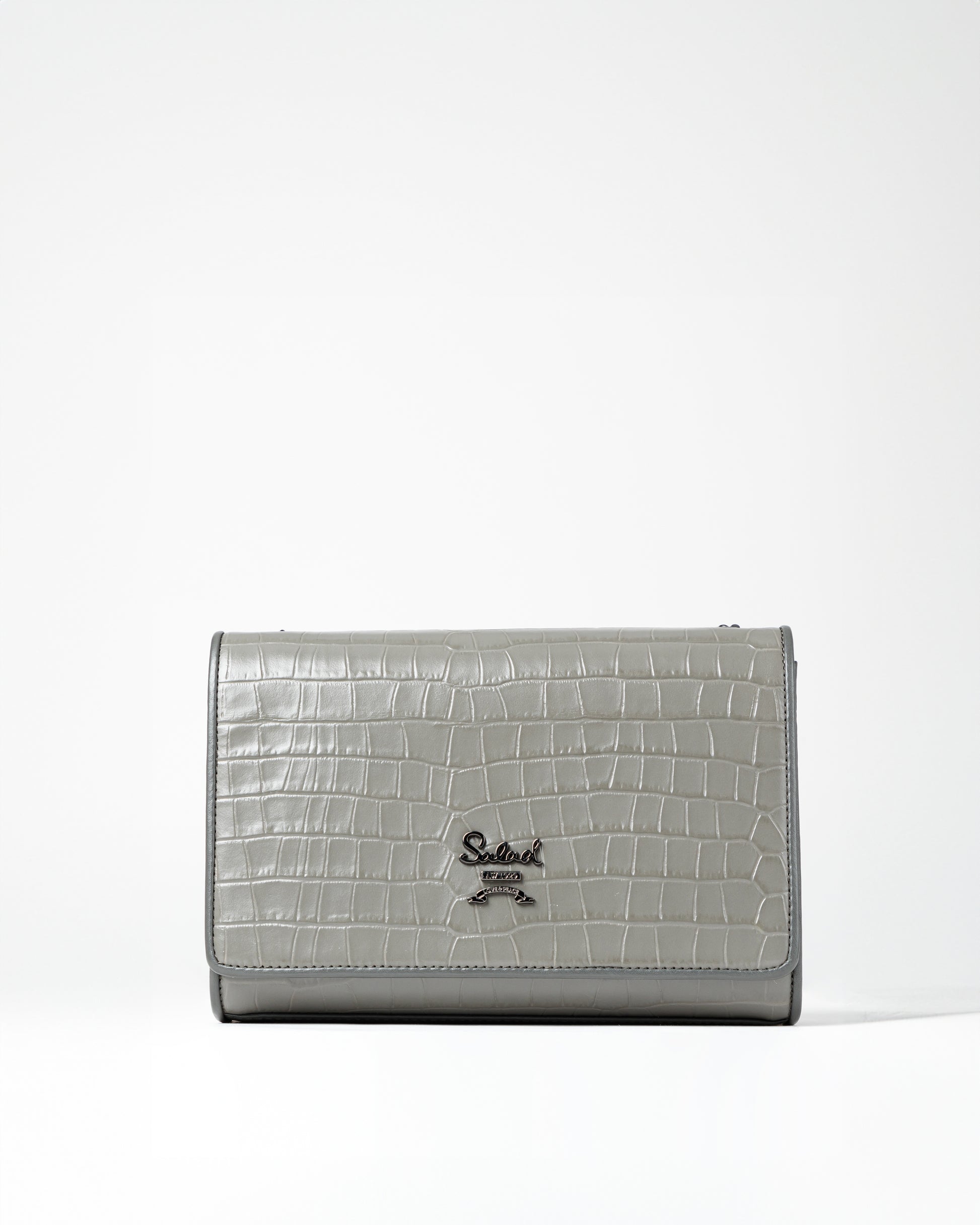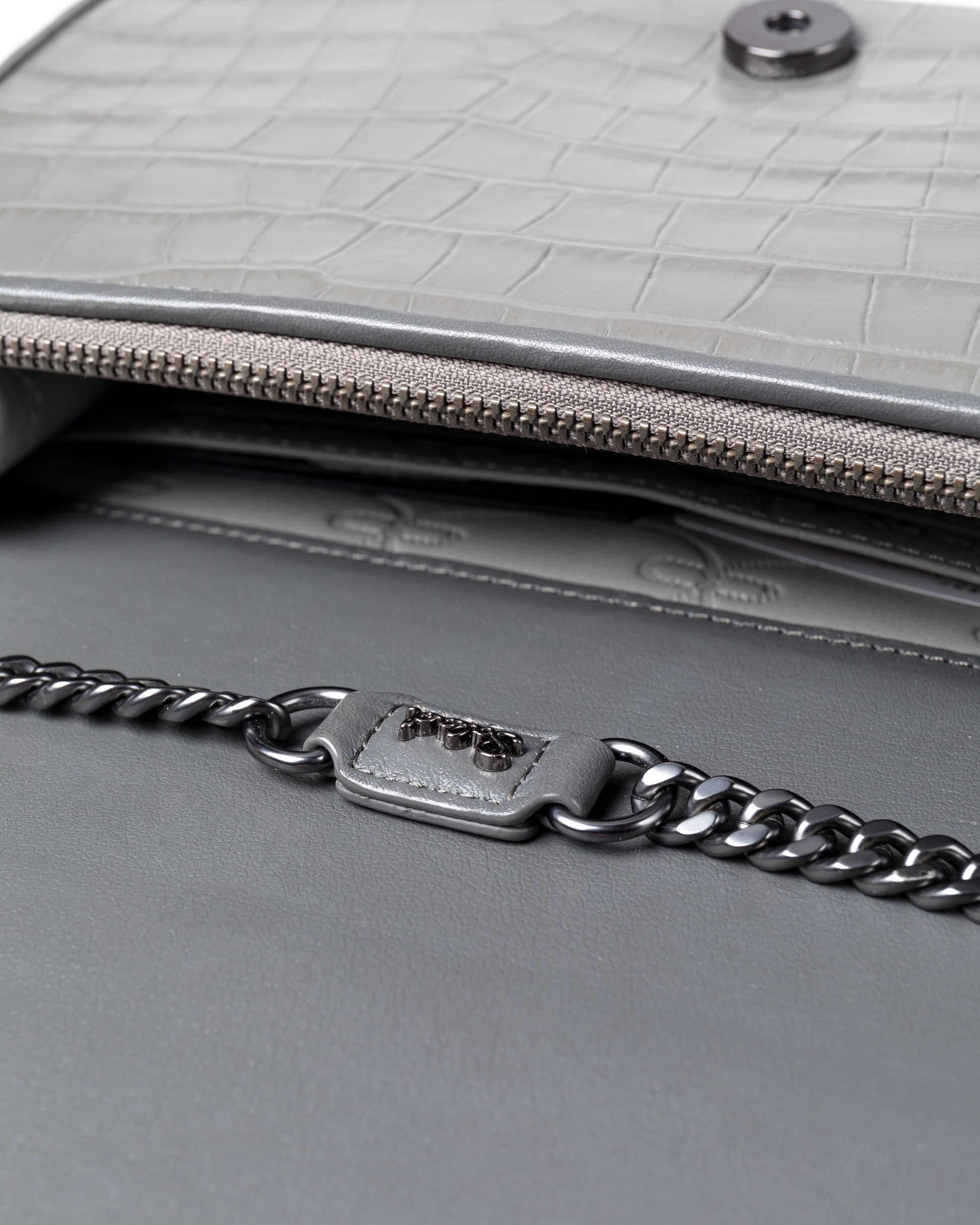 Interior zippered pocket, four credit card slots, flat side pockets, sliding pocket with magnetic closure on the back, adjustable chain-trimmed leather shoulder strap