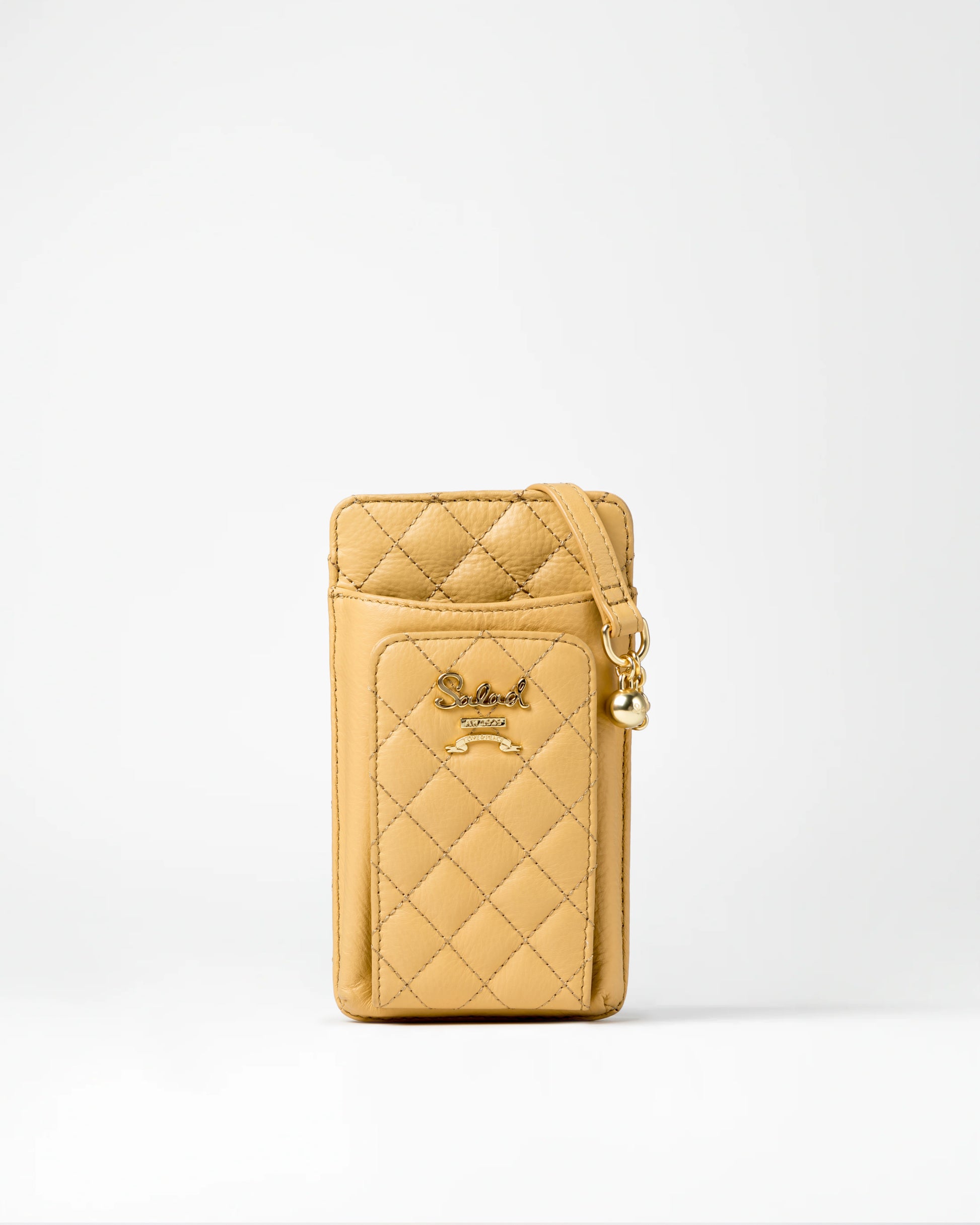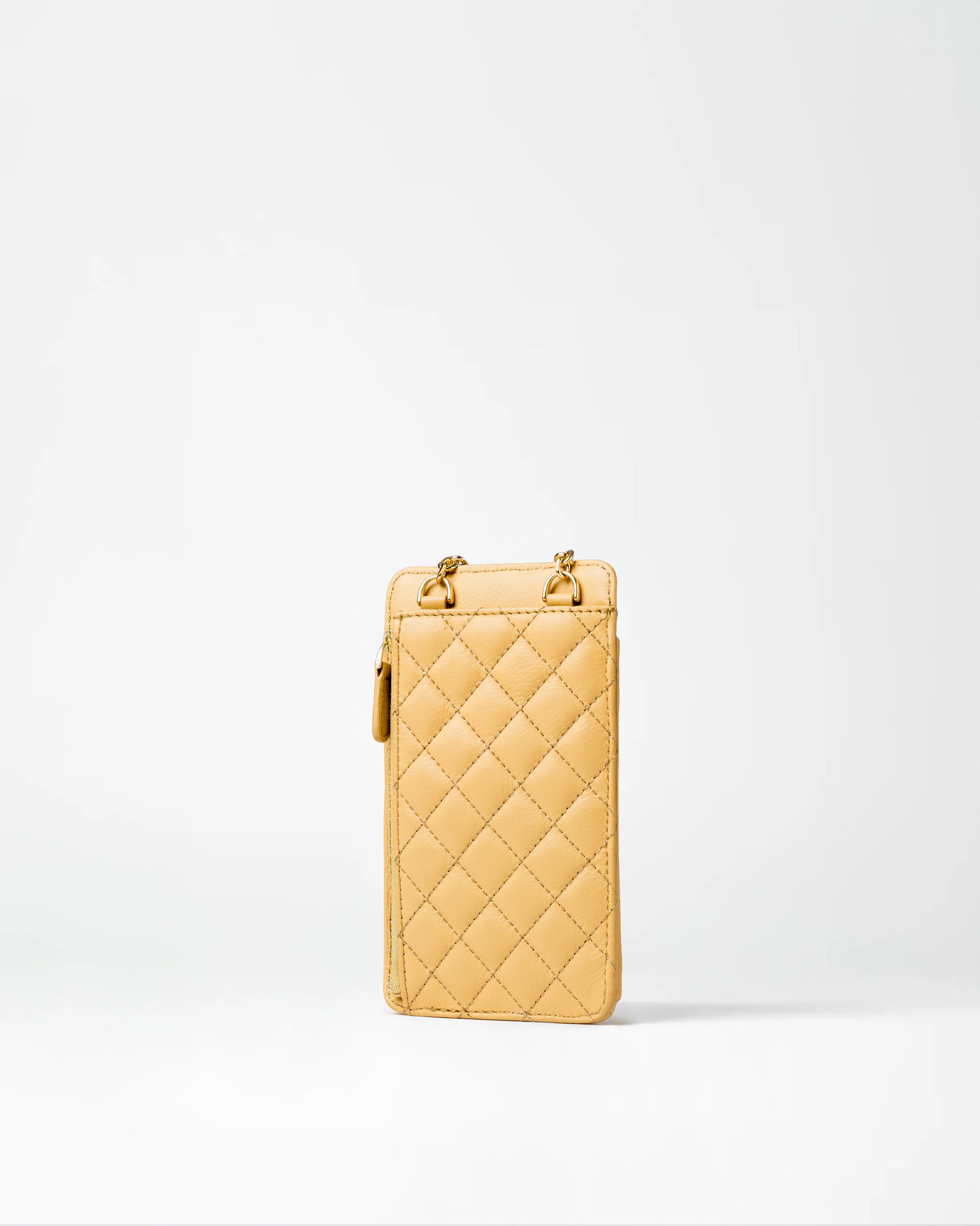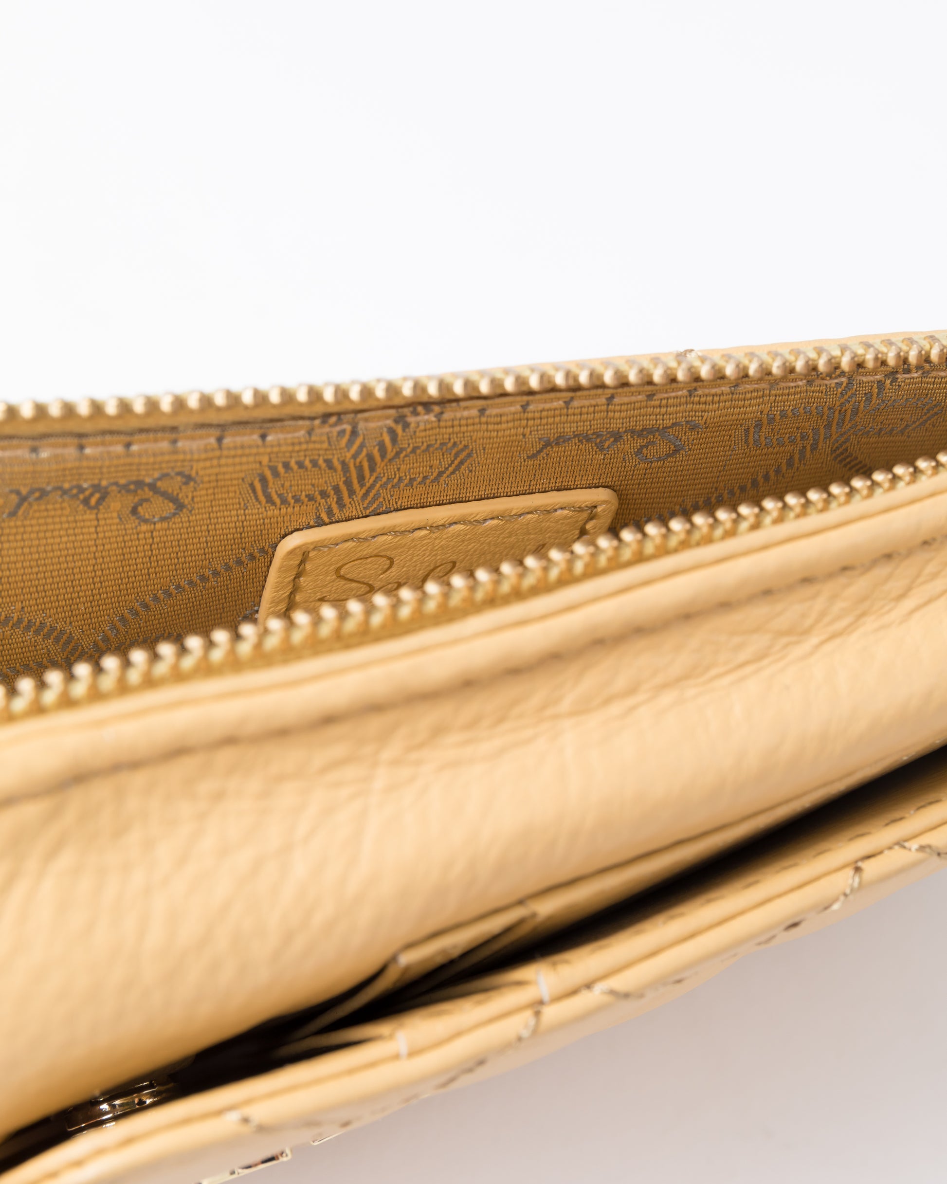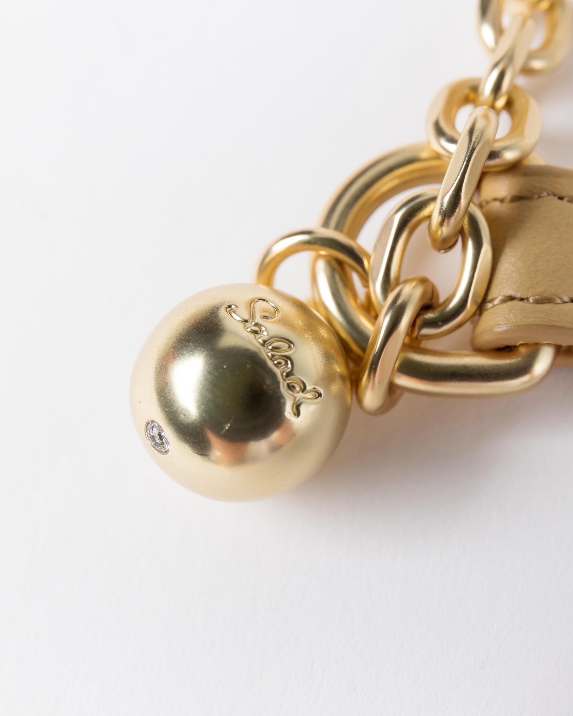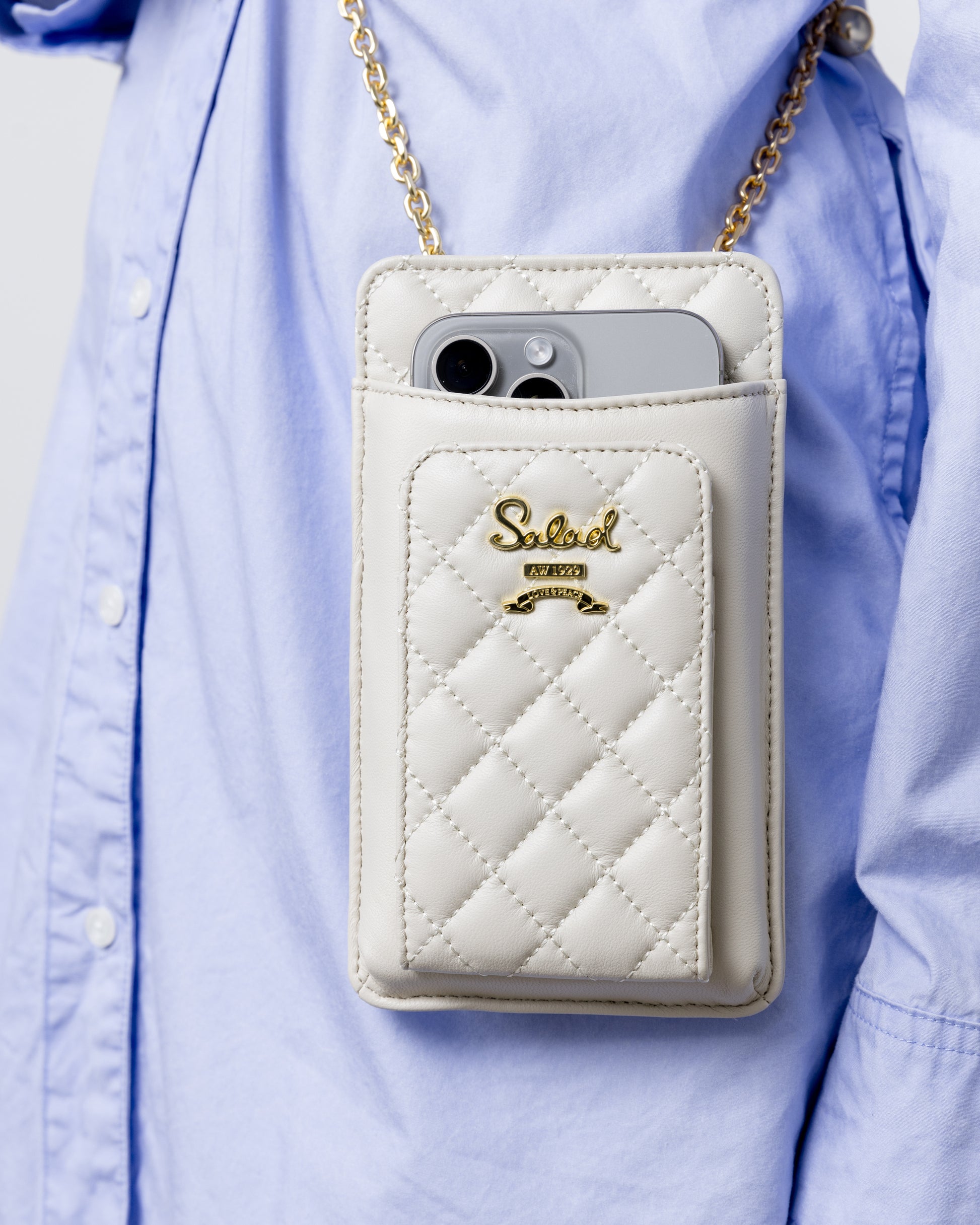 quilted leather effect on the face; 4 card slots on the front panel with push-button closures and a zipped pocket on the back panel for cards; adjustable shoulder strap in leather with chains;