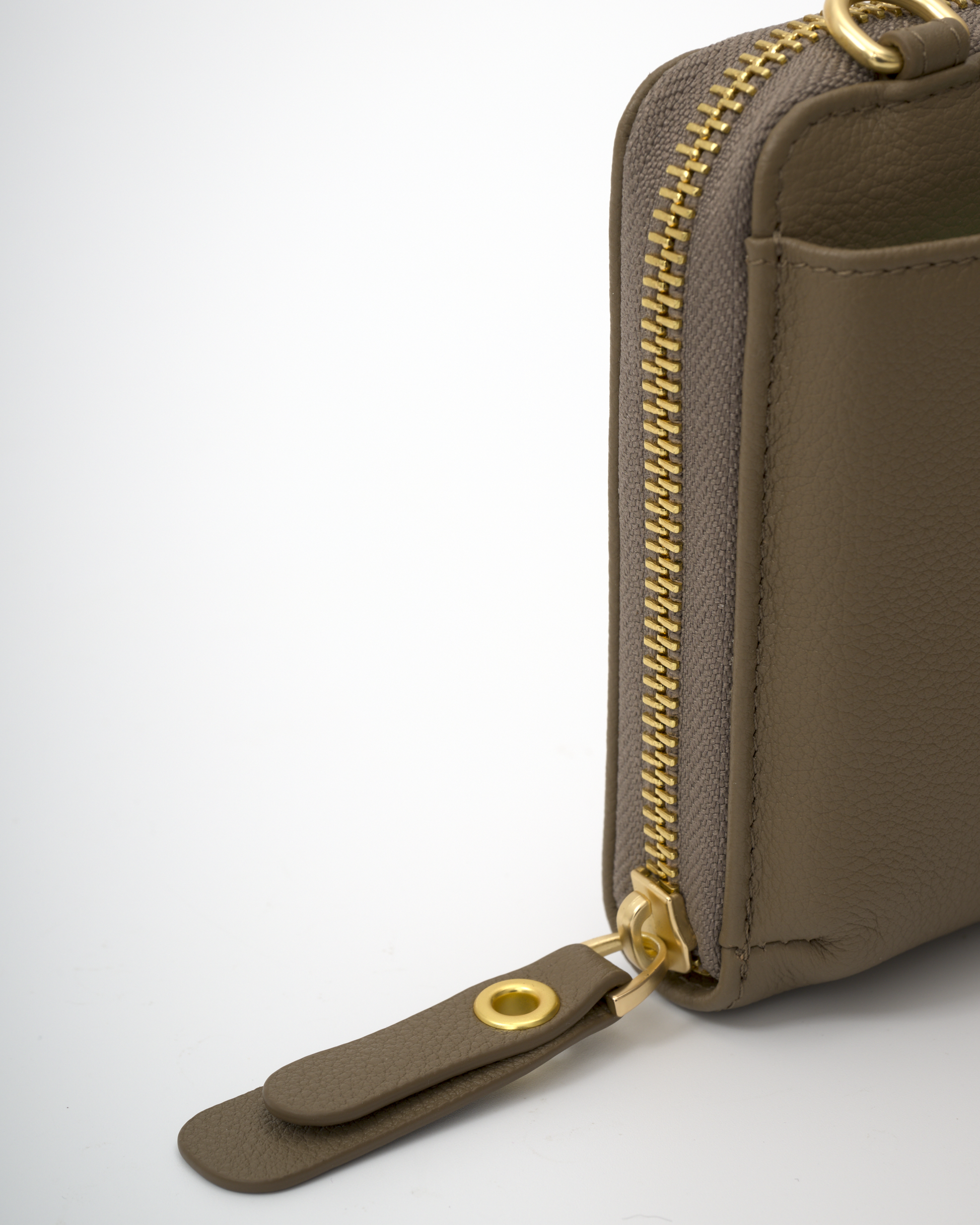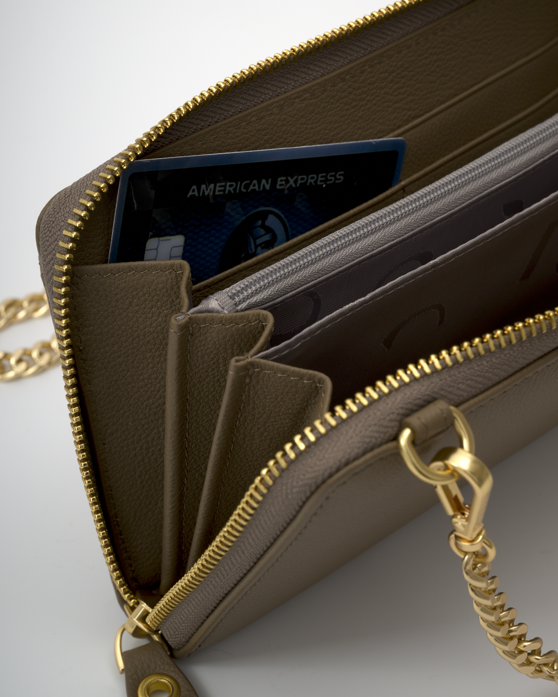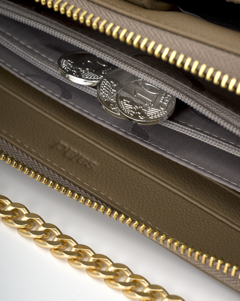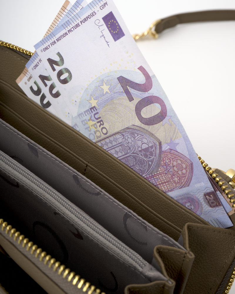 • The accordion-style pocket has three bill compartments and one zippered pocket for storing coins.