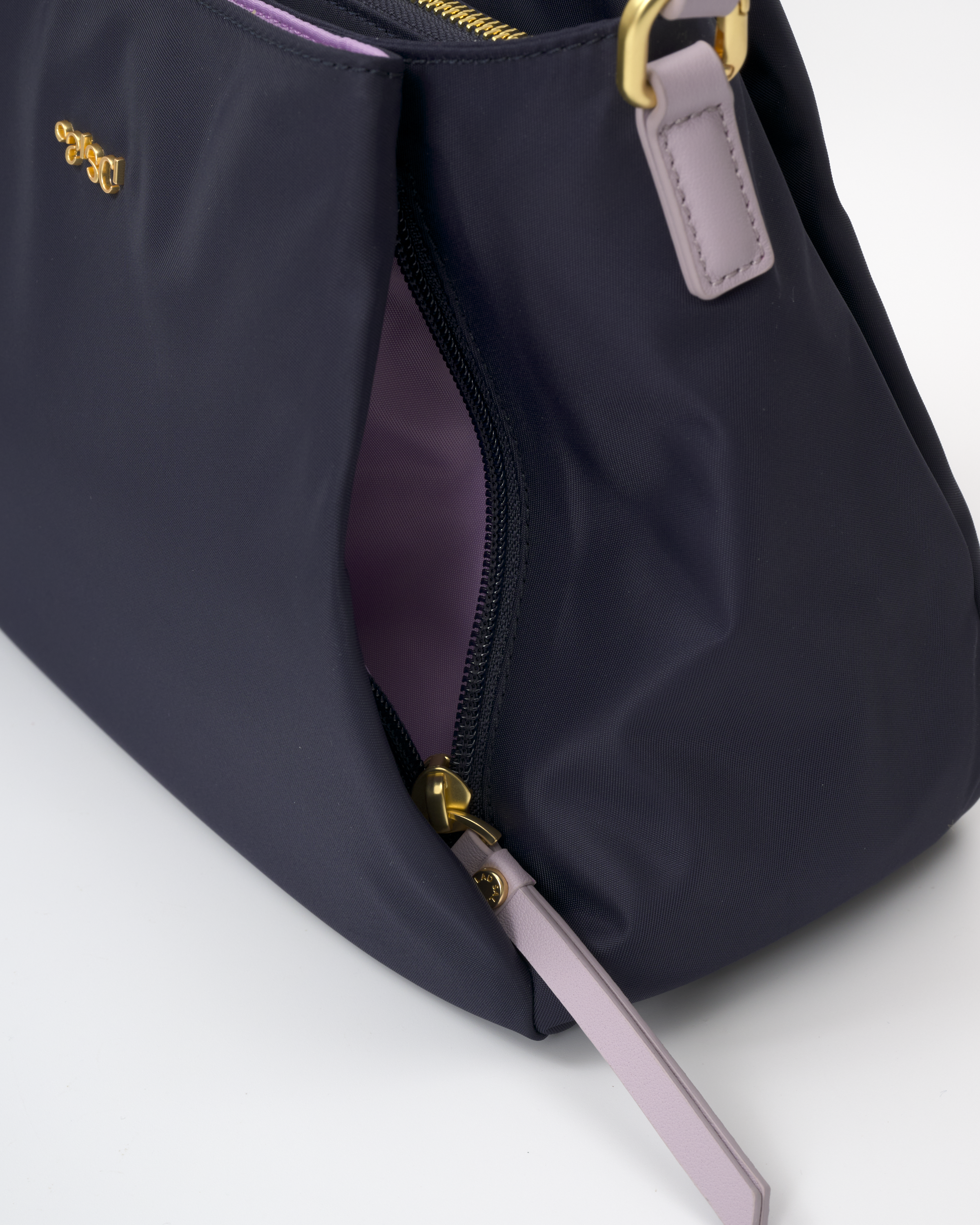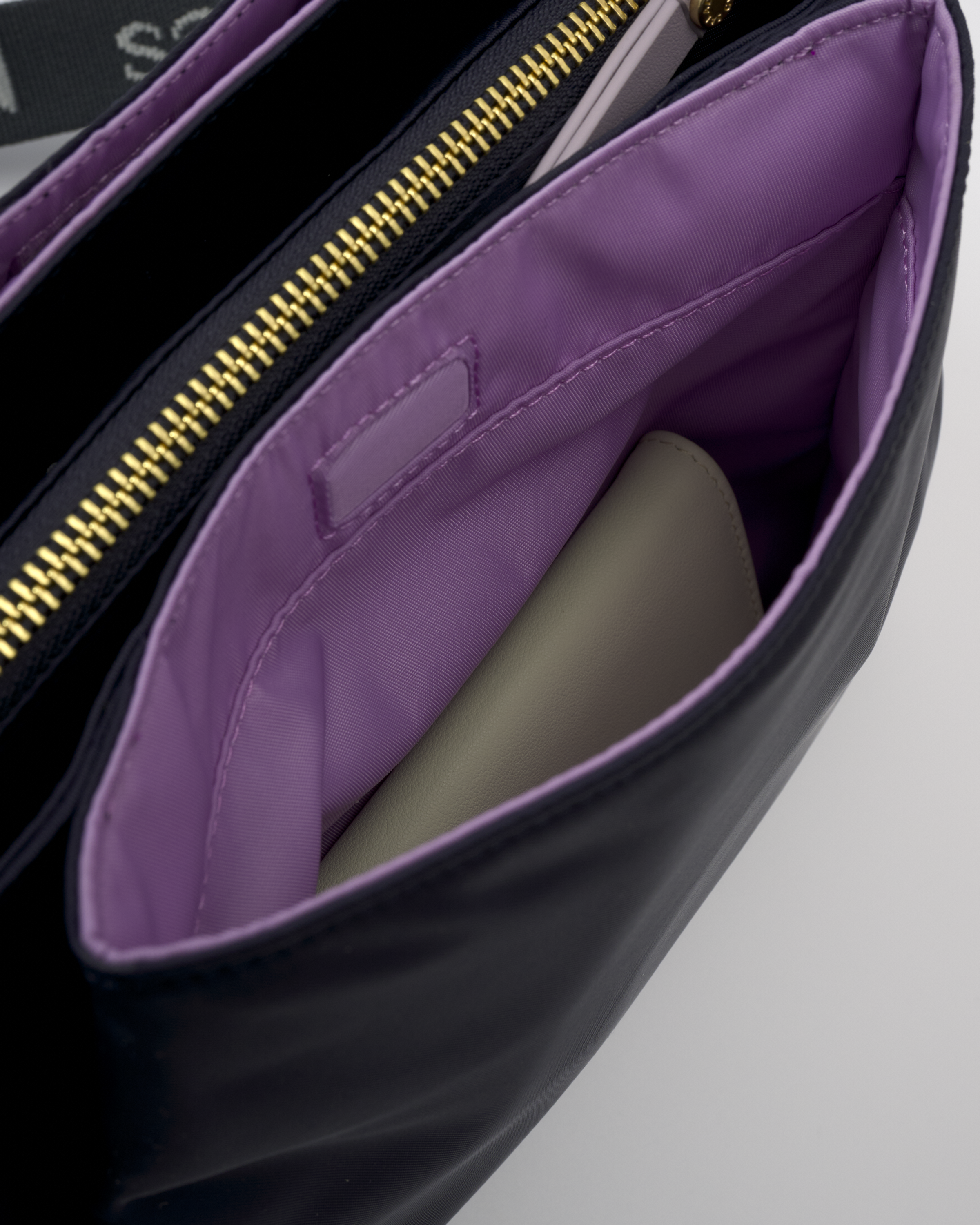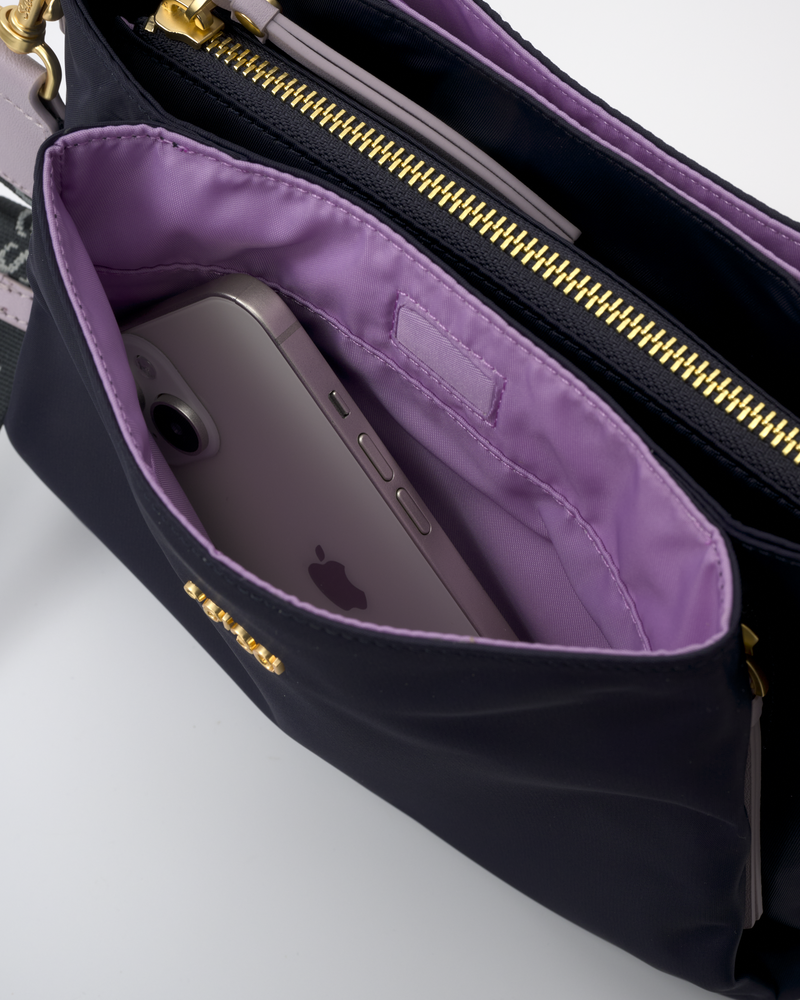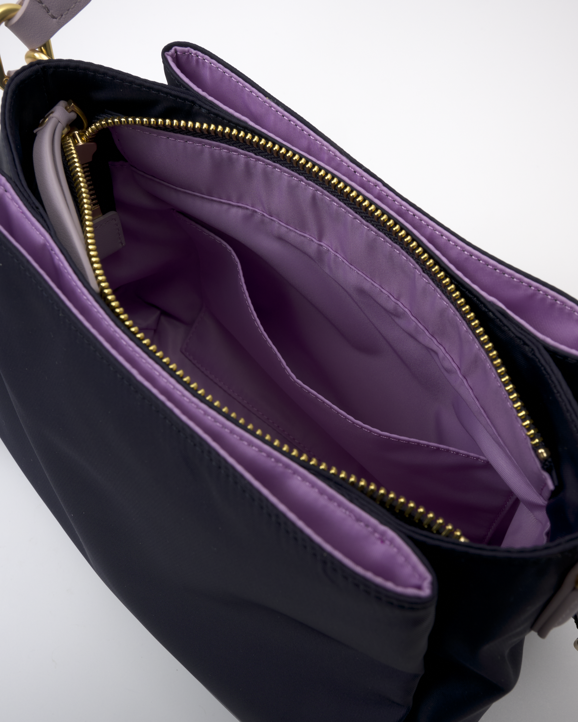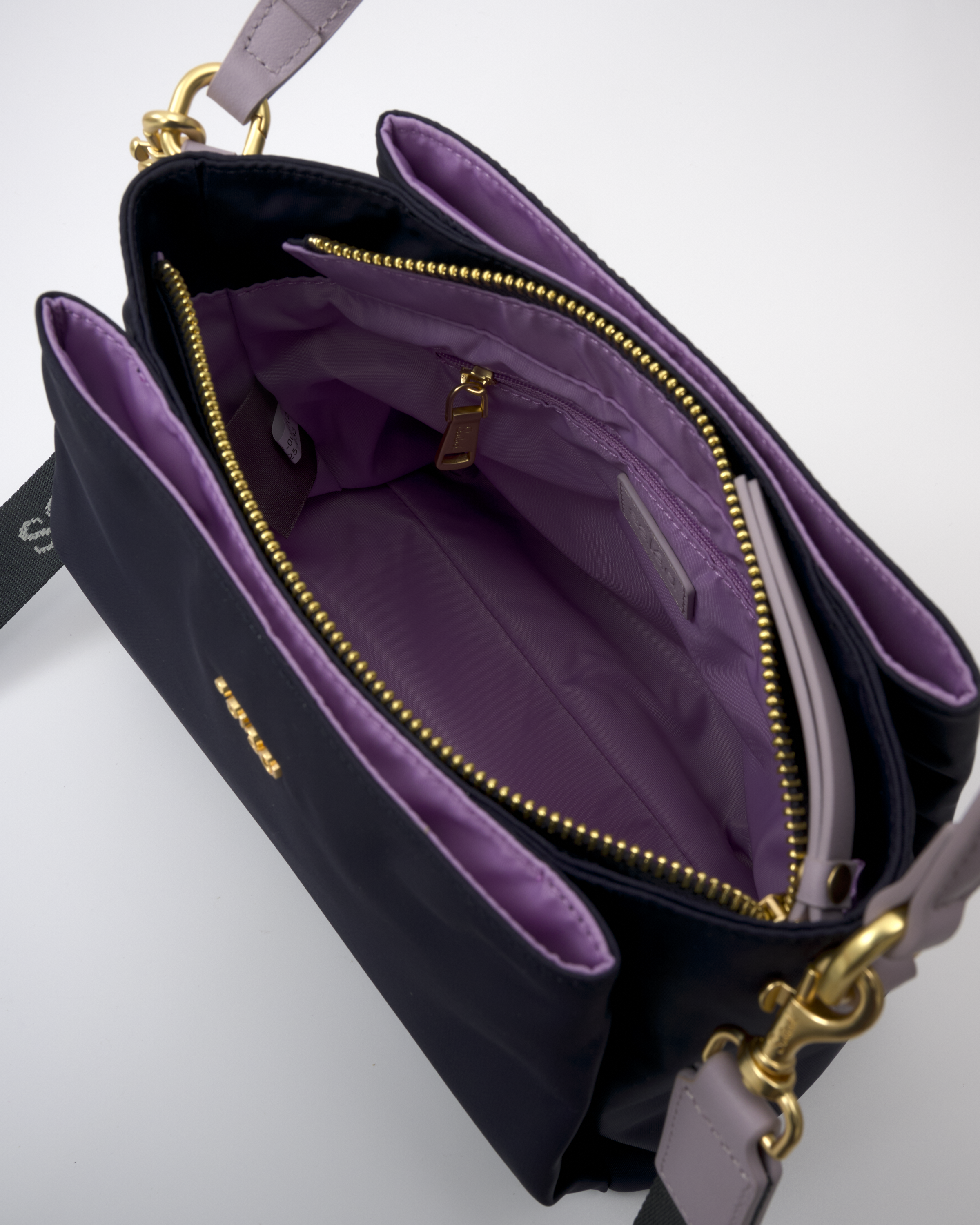 • The main compartment is divided into three sections (front, middle, and back). The middle section closes with a zipper and has one slip pocket and one zip pocket inside.
