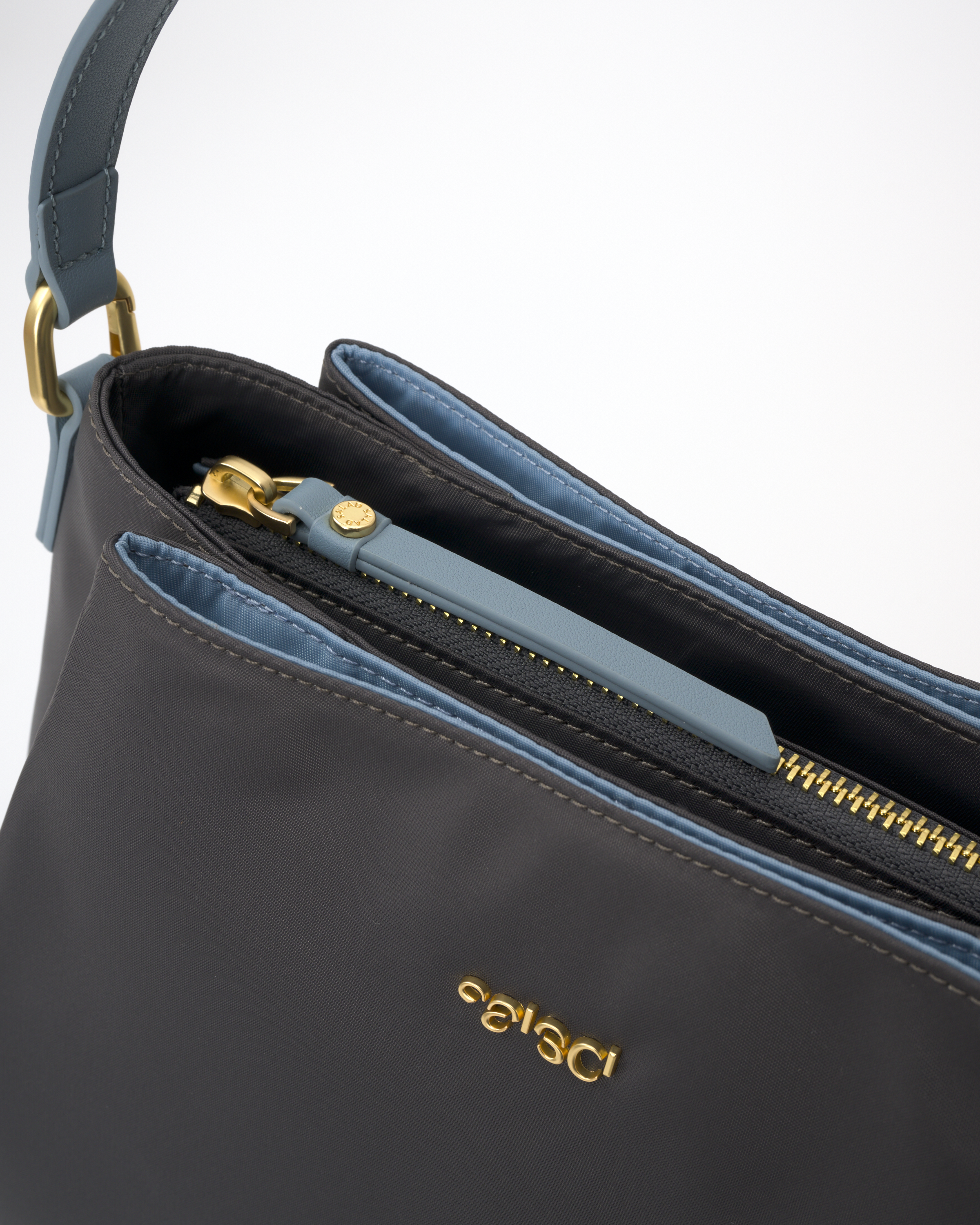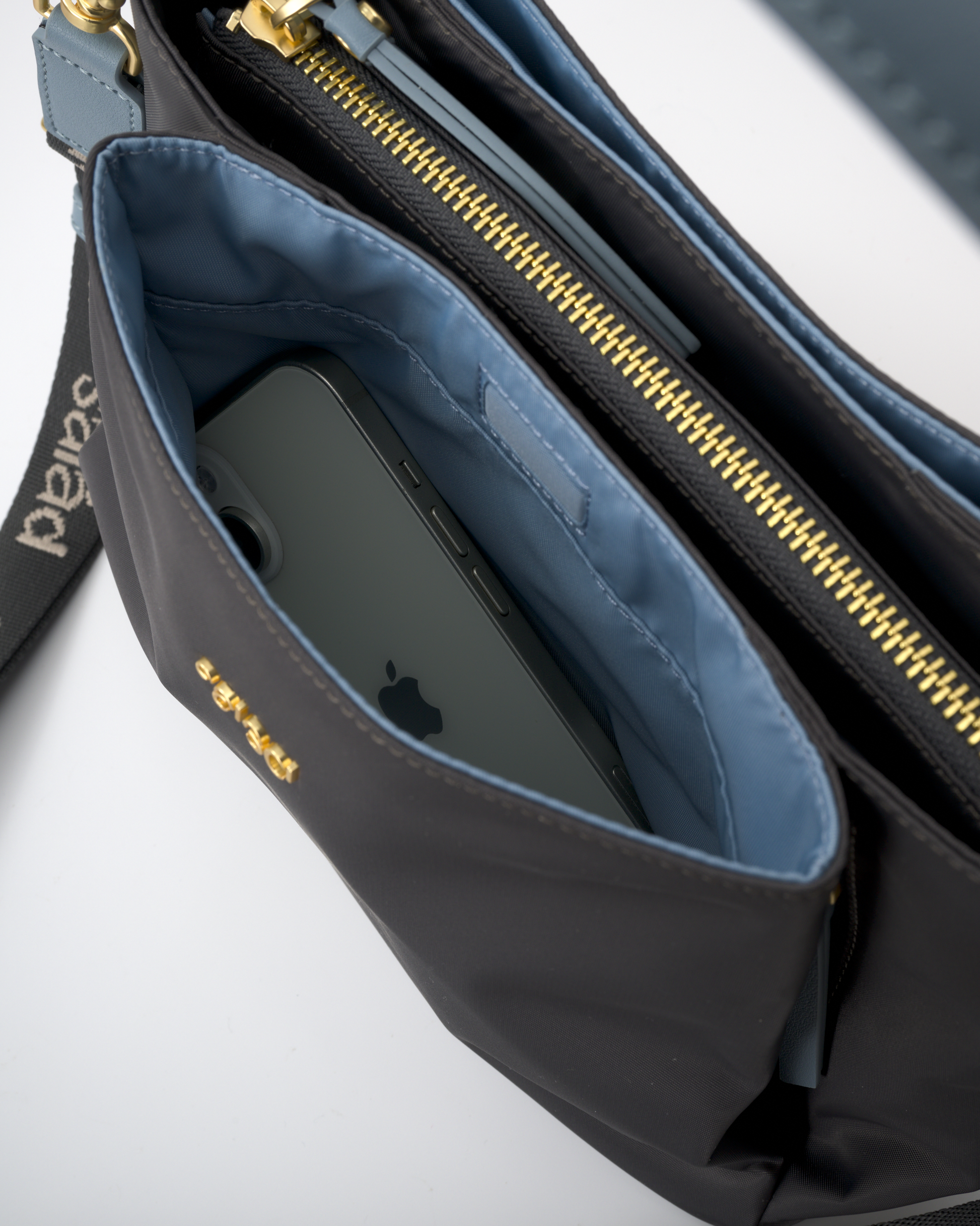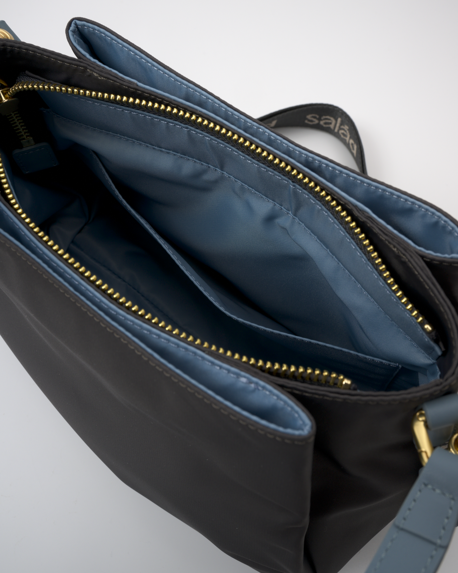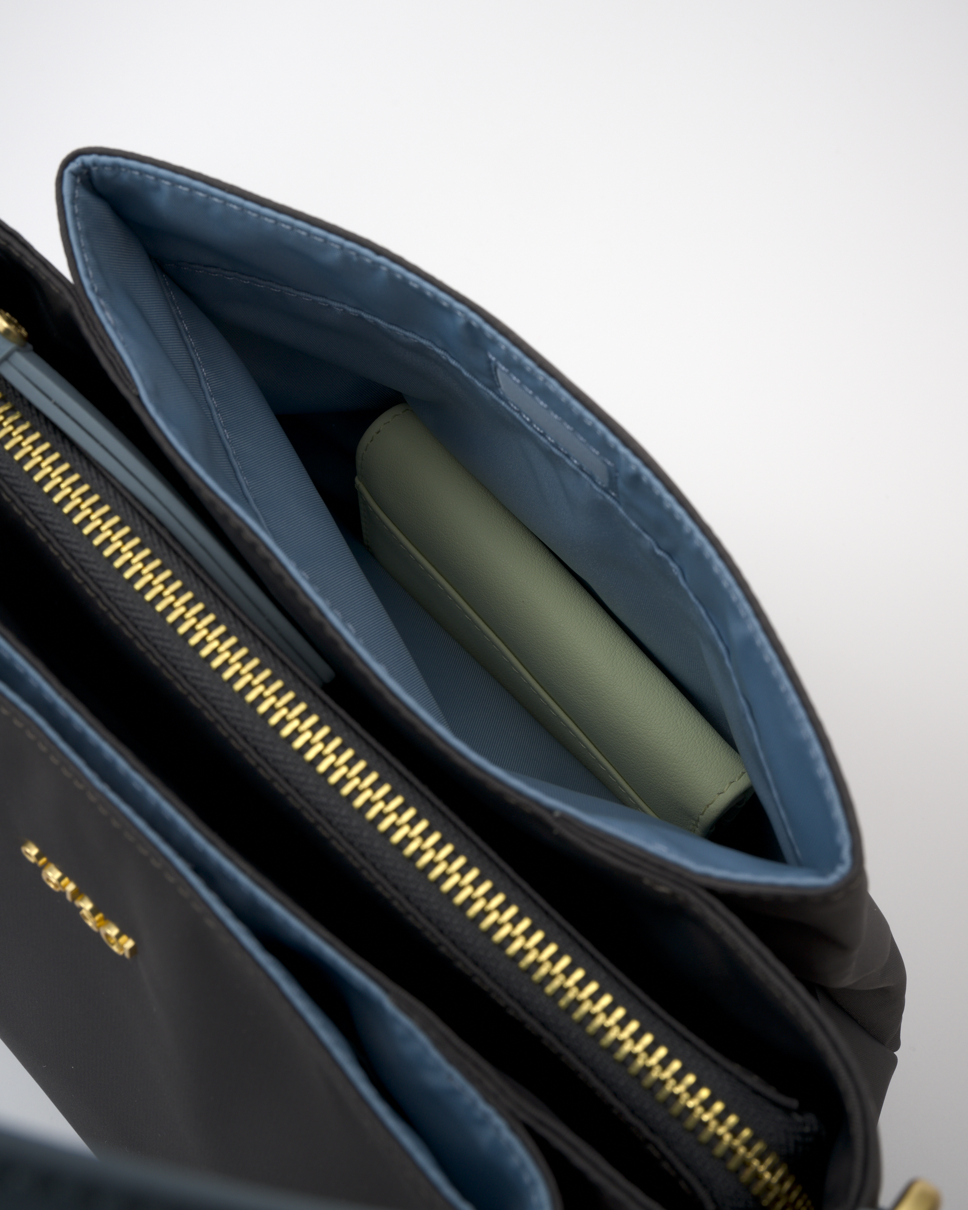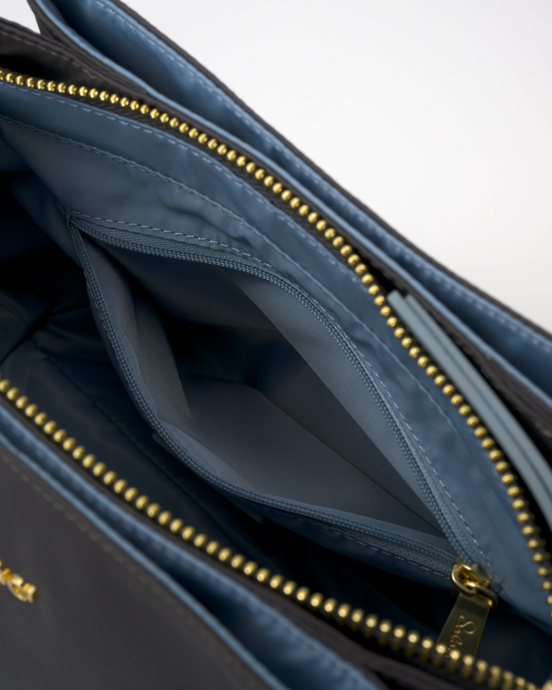 • The main compartment is divided into three sections (front, middle, and back). The middle section closes with a zipper and has one slip pocket and one zip pocket inside.