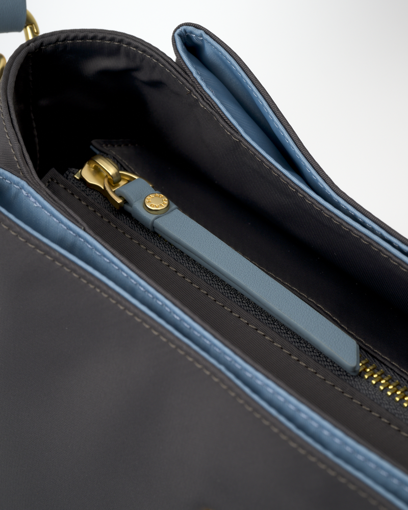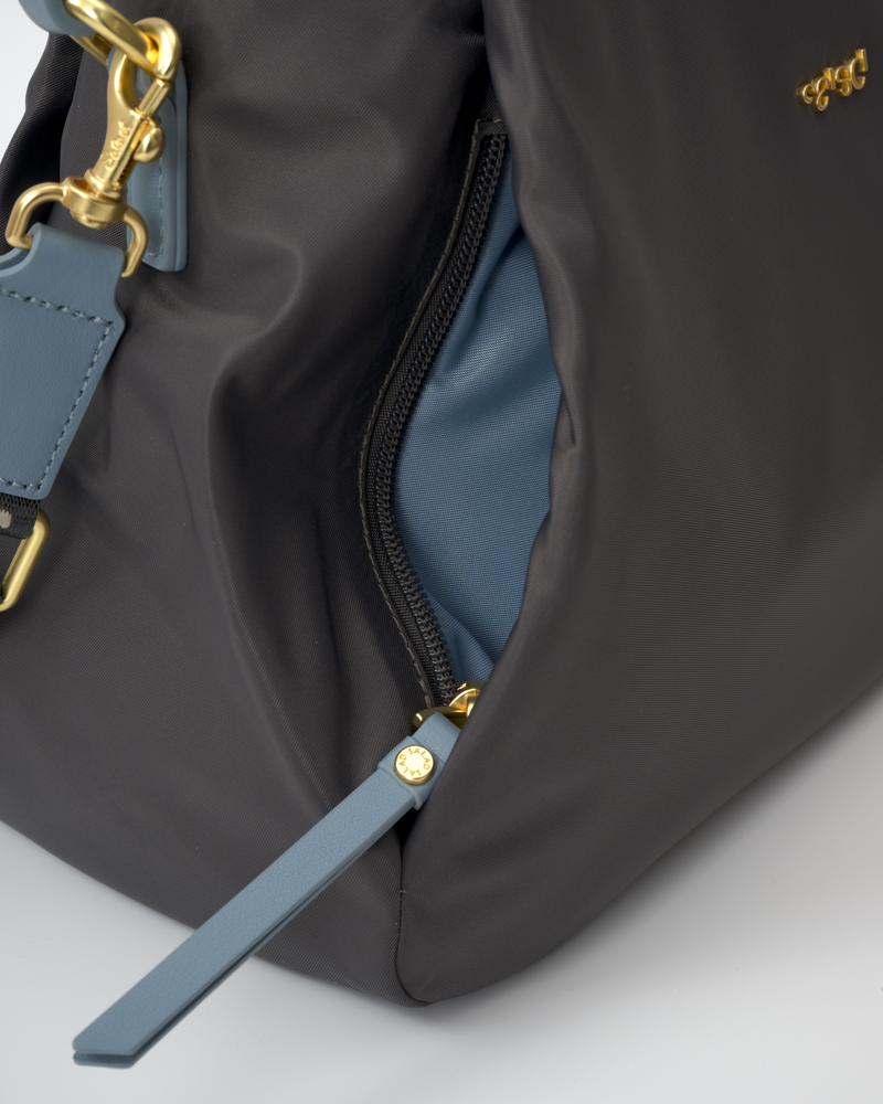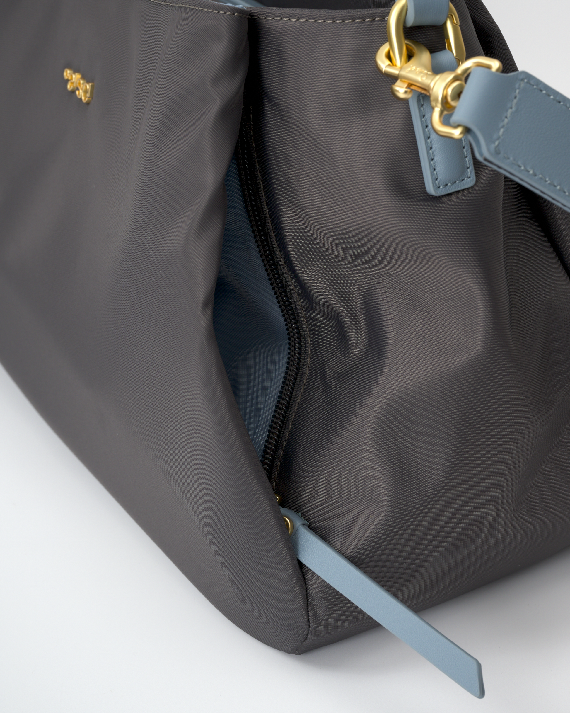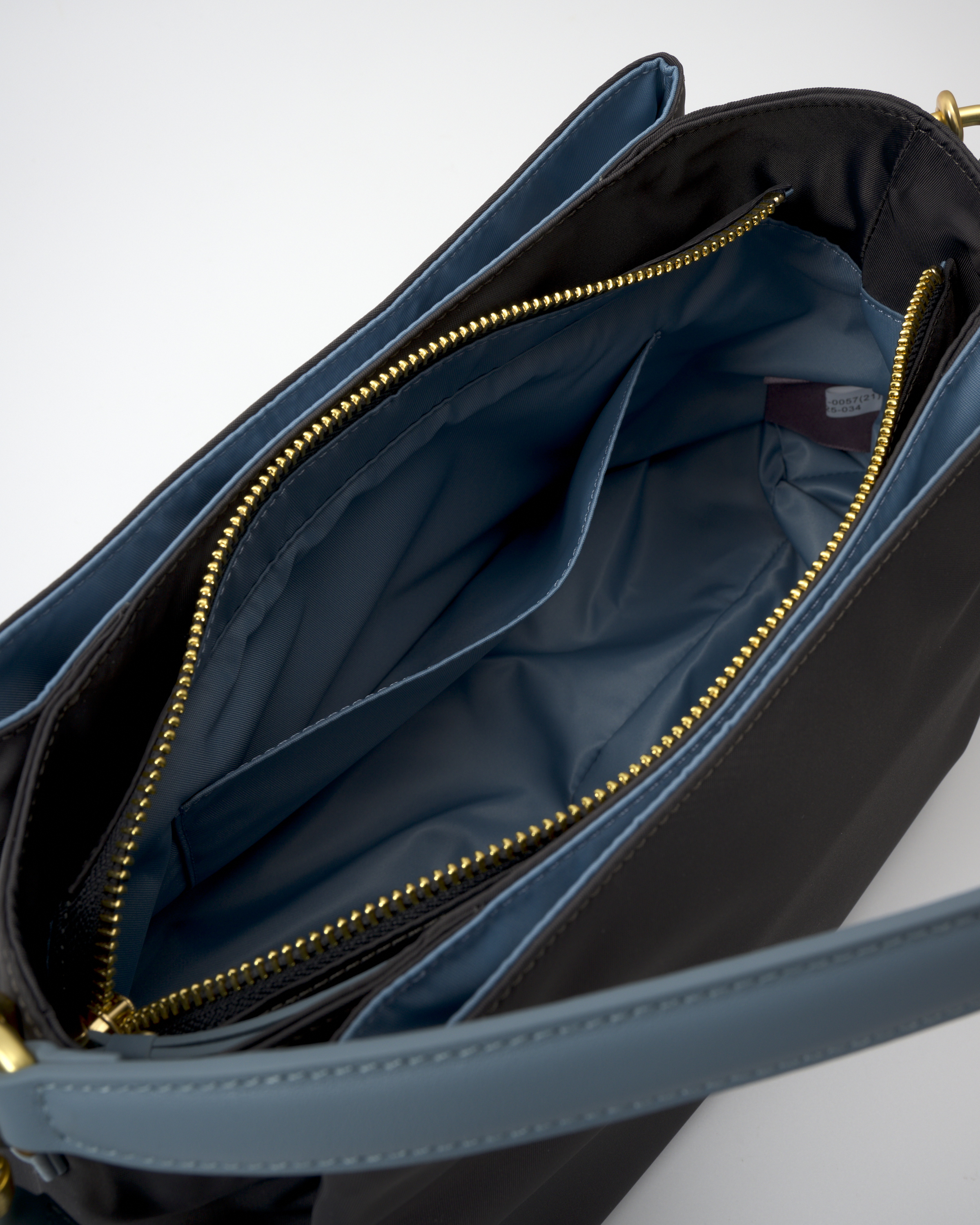 • The main compartment is divided into three sections (front, middle, and back). The middle section closes with a zipper and has one slip pocket and one zip pocket inside.