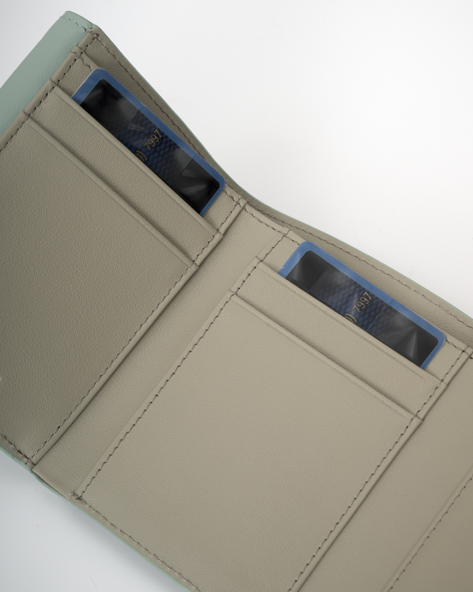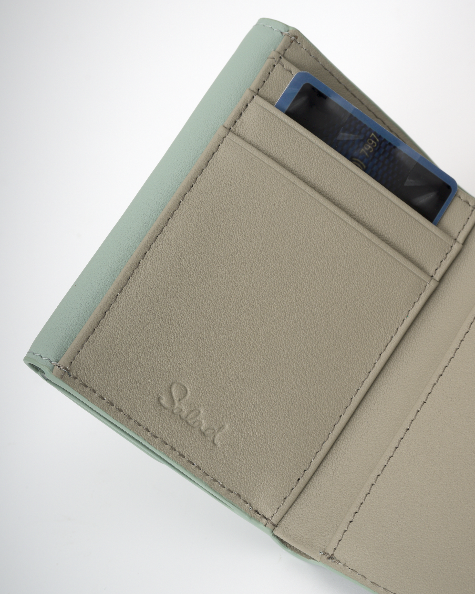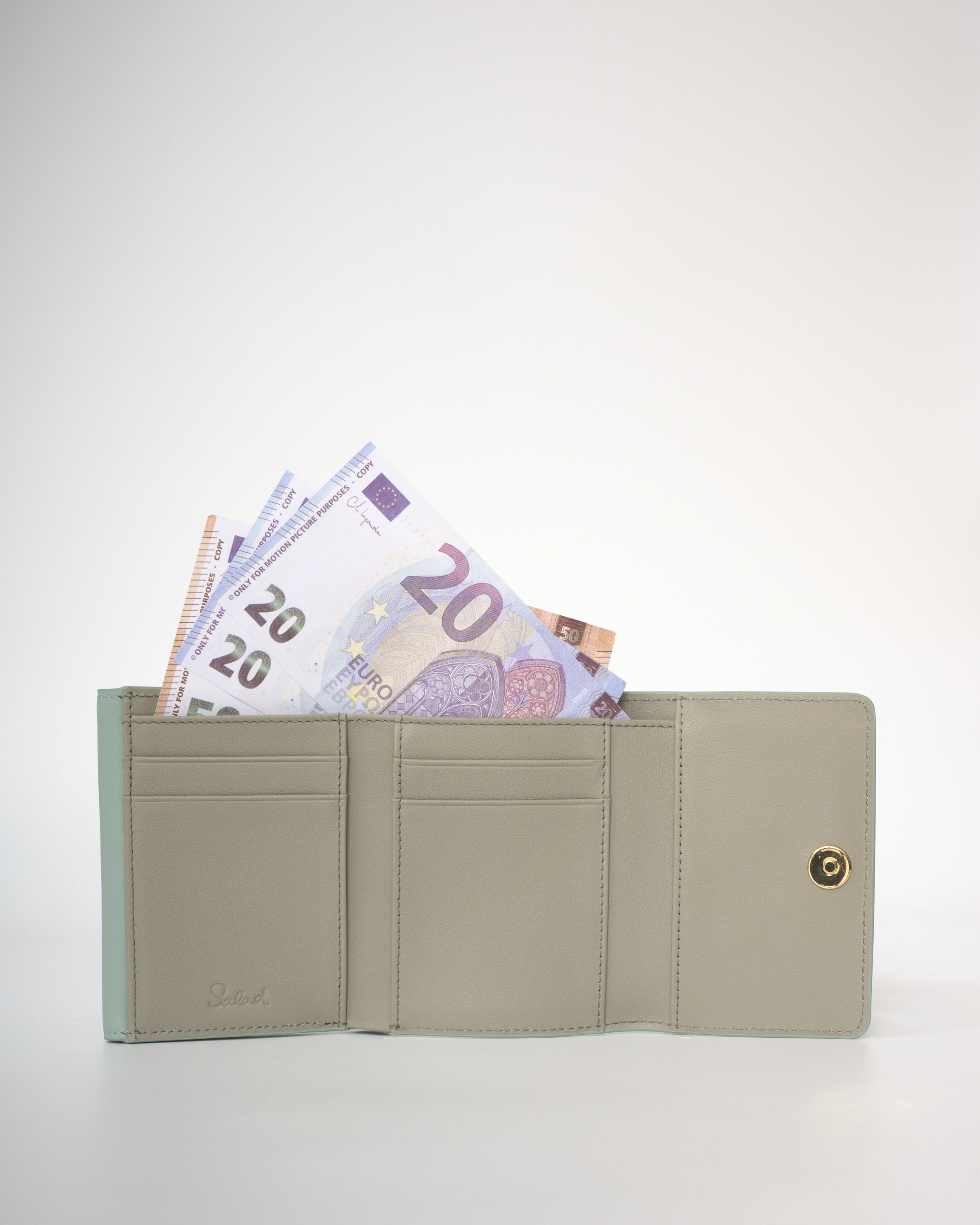 • The tri-fold wallet uses a magnetic clasp for closure.