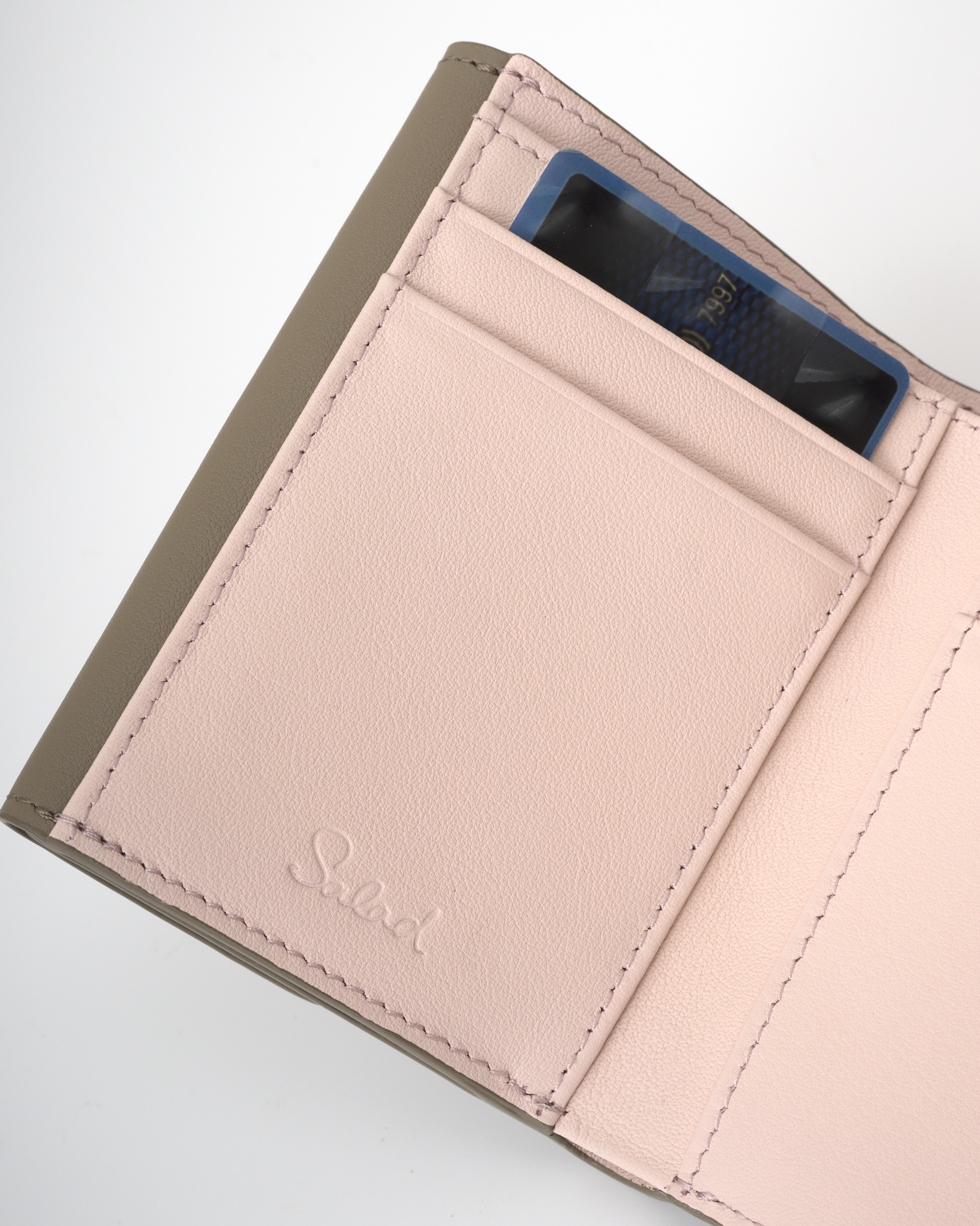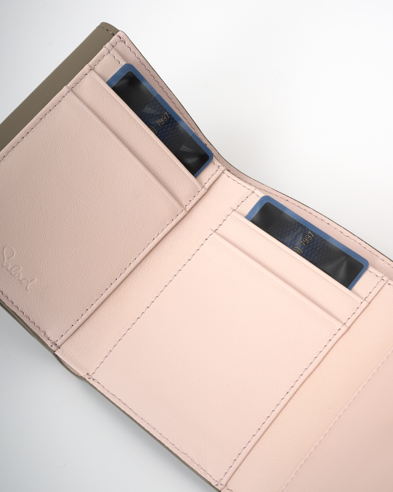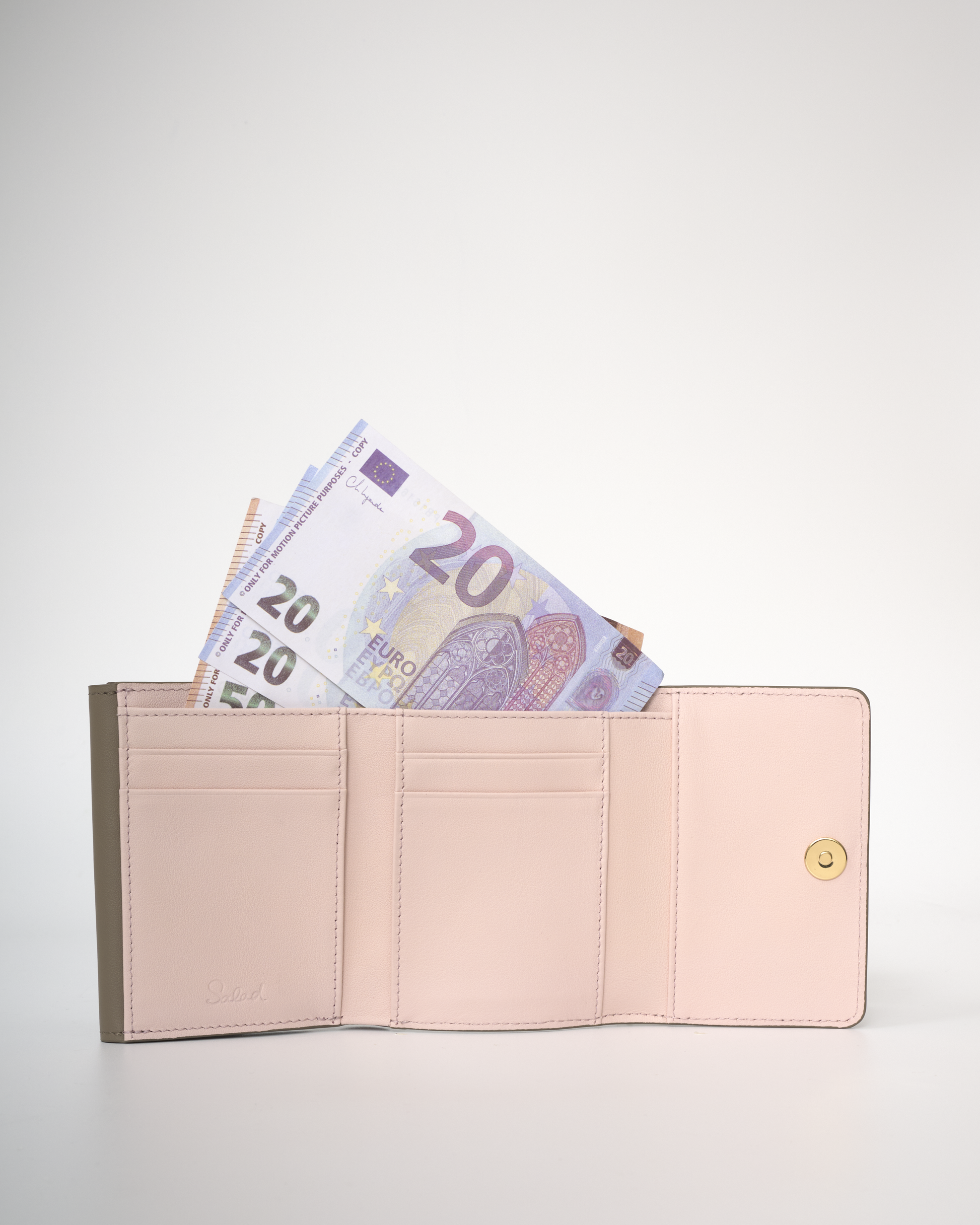 • The tri-fold wallet uses a magnetic clasp for closure.