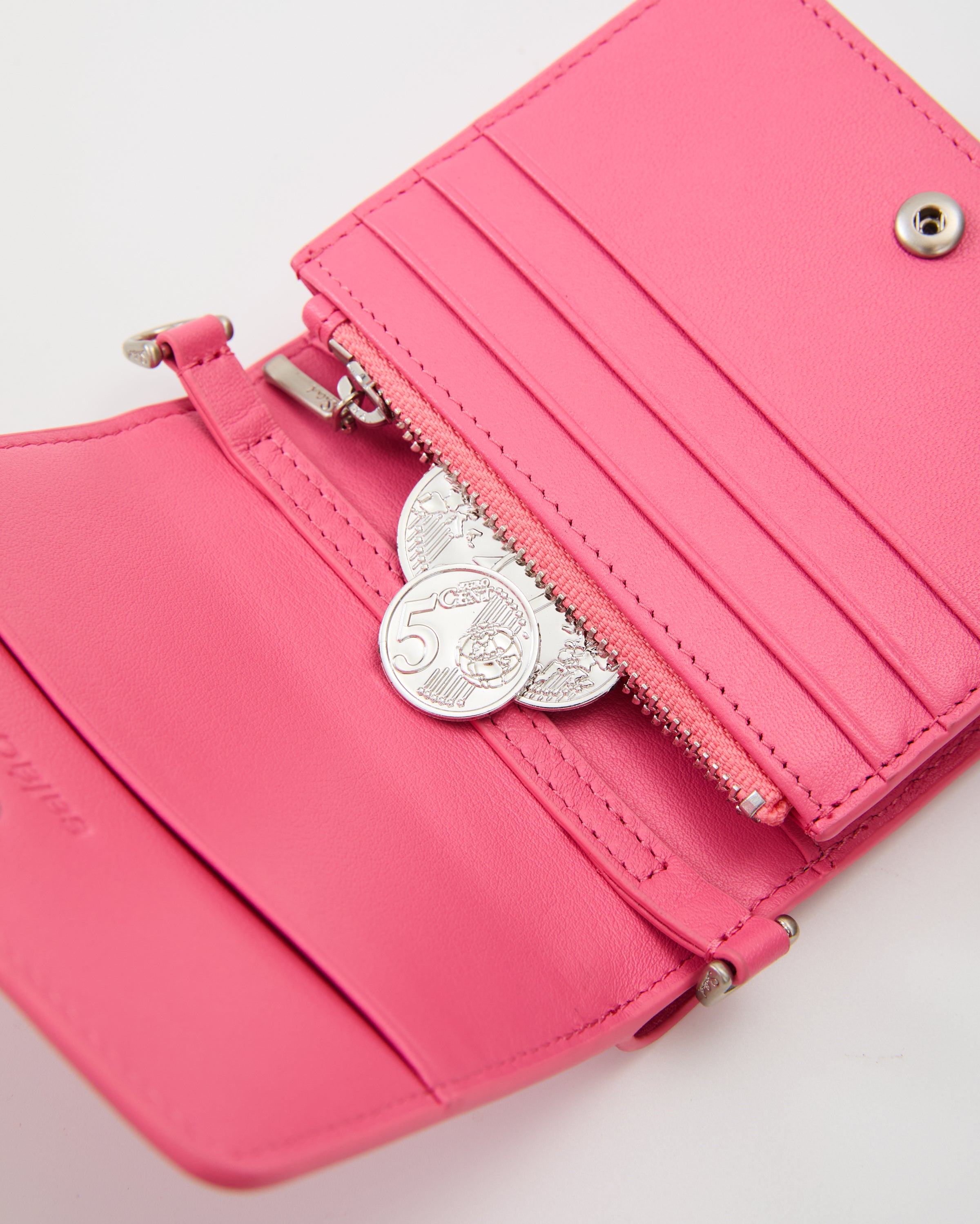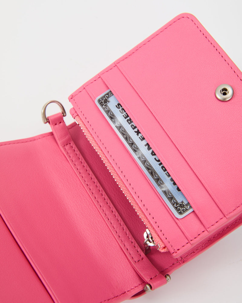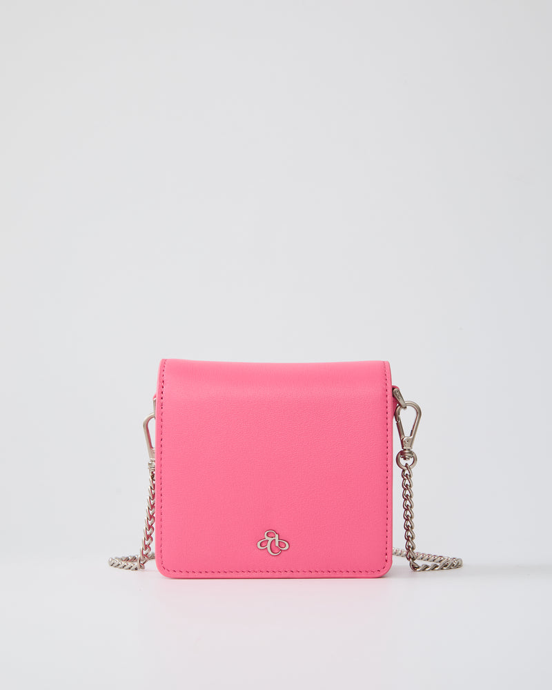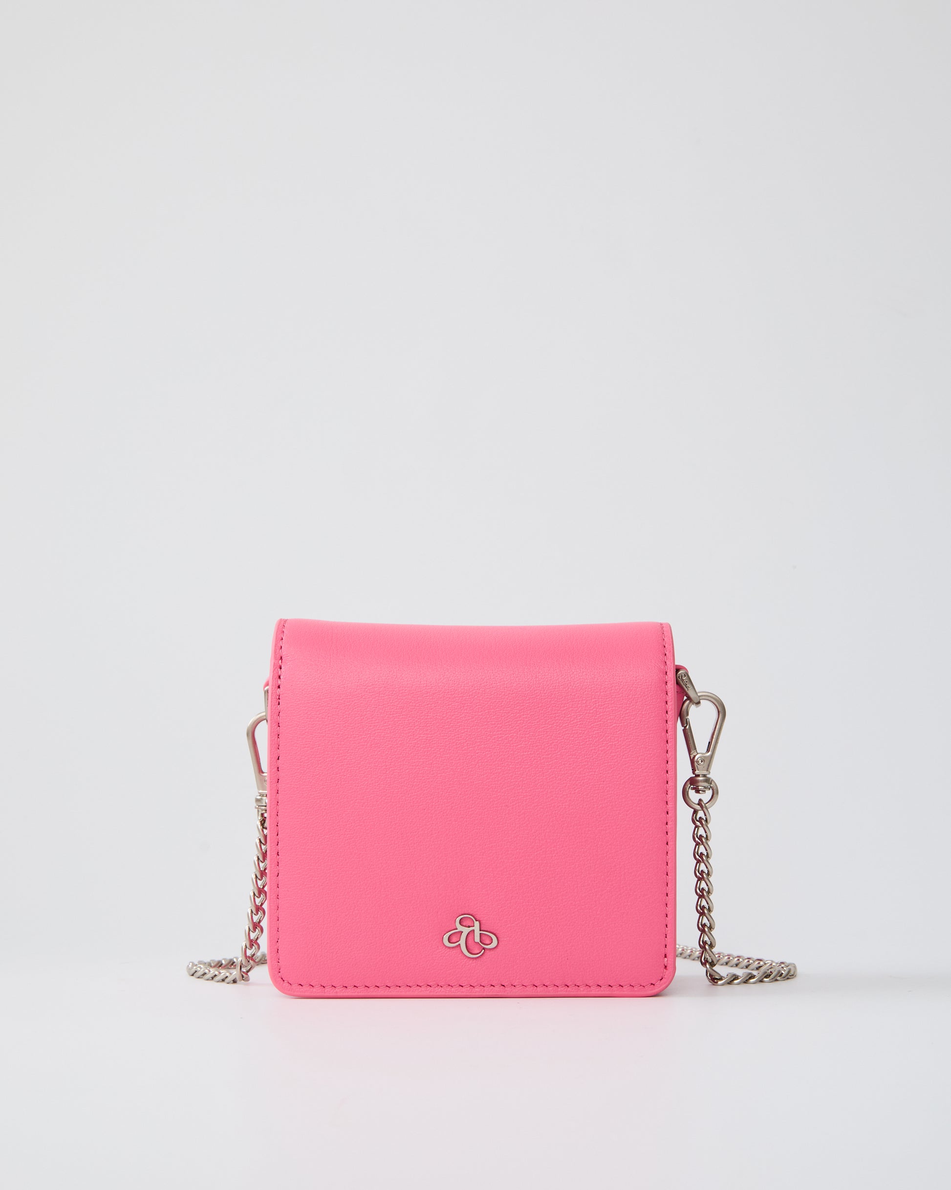 •Slip pocket and bill compartment on the back and right side respectively •Interior contains 3 credit card holders and coin zipper pocket •Active metal chain can be removed and used as an independent wallet •Sophisticated structure with small brand logo, showing low-key elegance