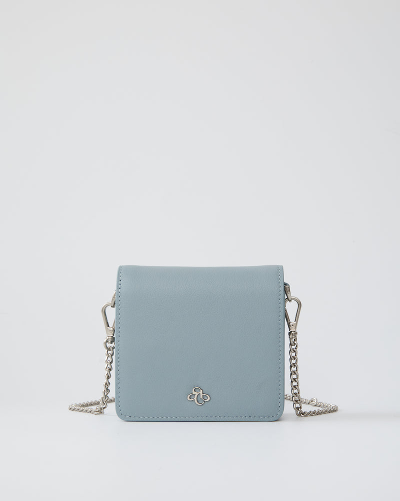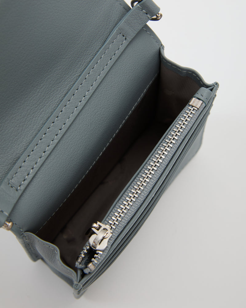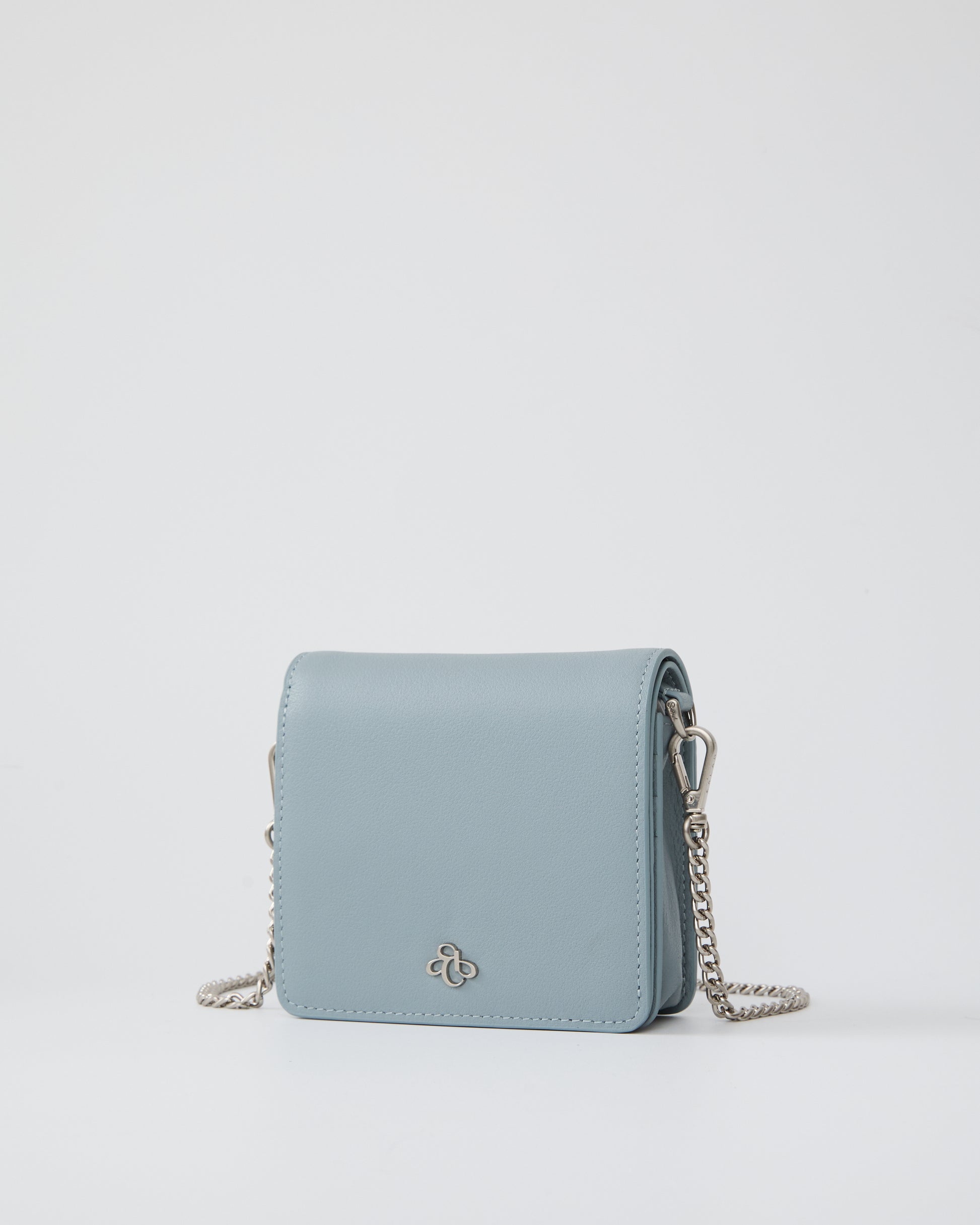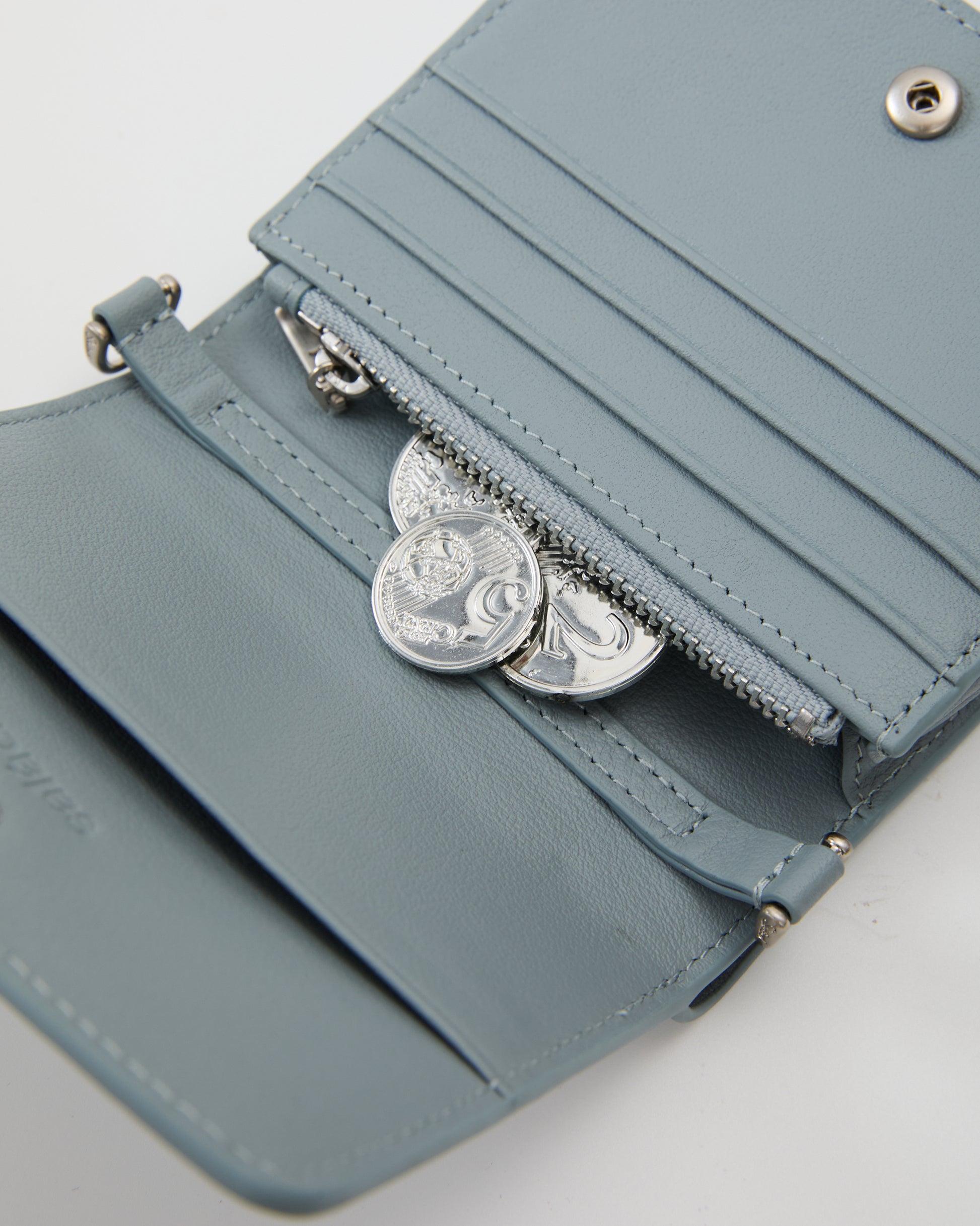 •Slip pocket and bill compartment on the back and right side respectively •Interior contains 3 credit card holders and coin zipper pocket •Active metal chain can be removed and used as an independent wallet •Sophisticated structure with small brand logo, showing low-key elegance