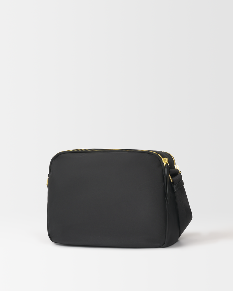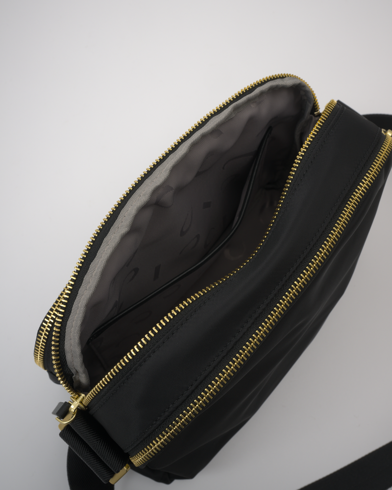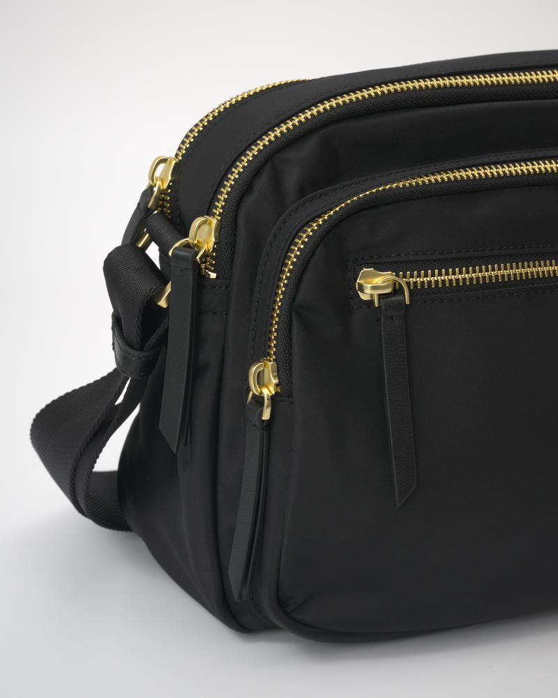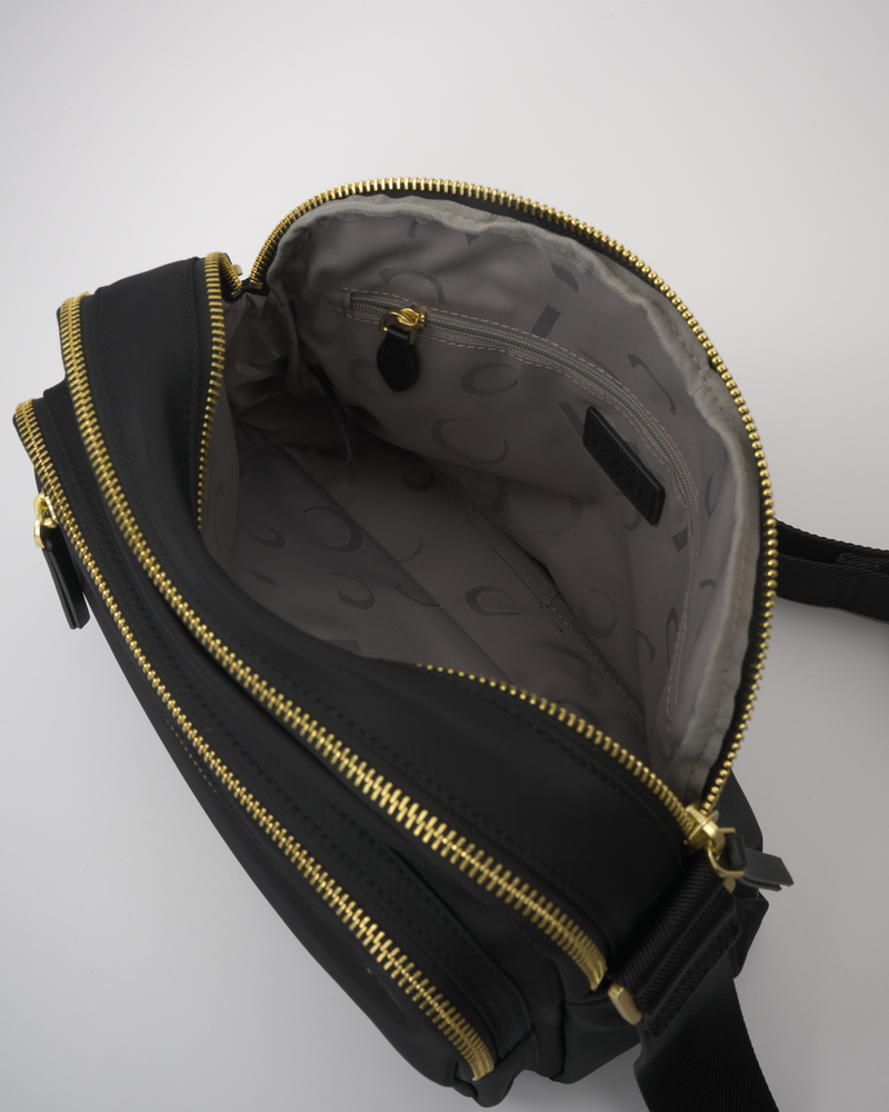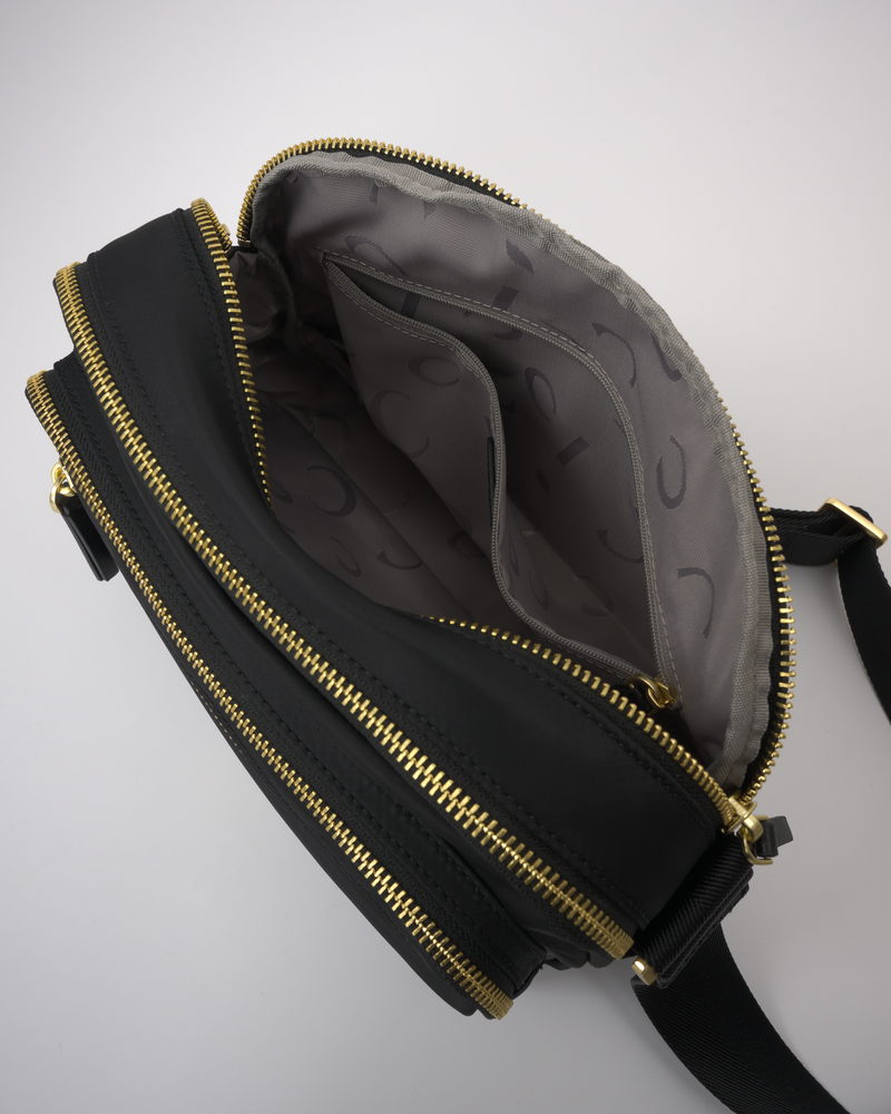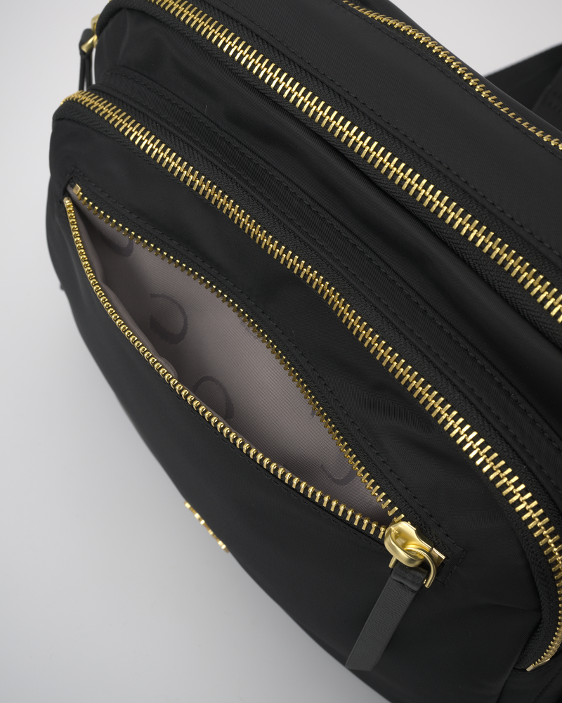 • The main compartment is divided into three sections (front, middle, and back) with zipper closures, and the back section has an internal zip pocket.