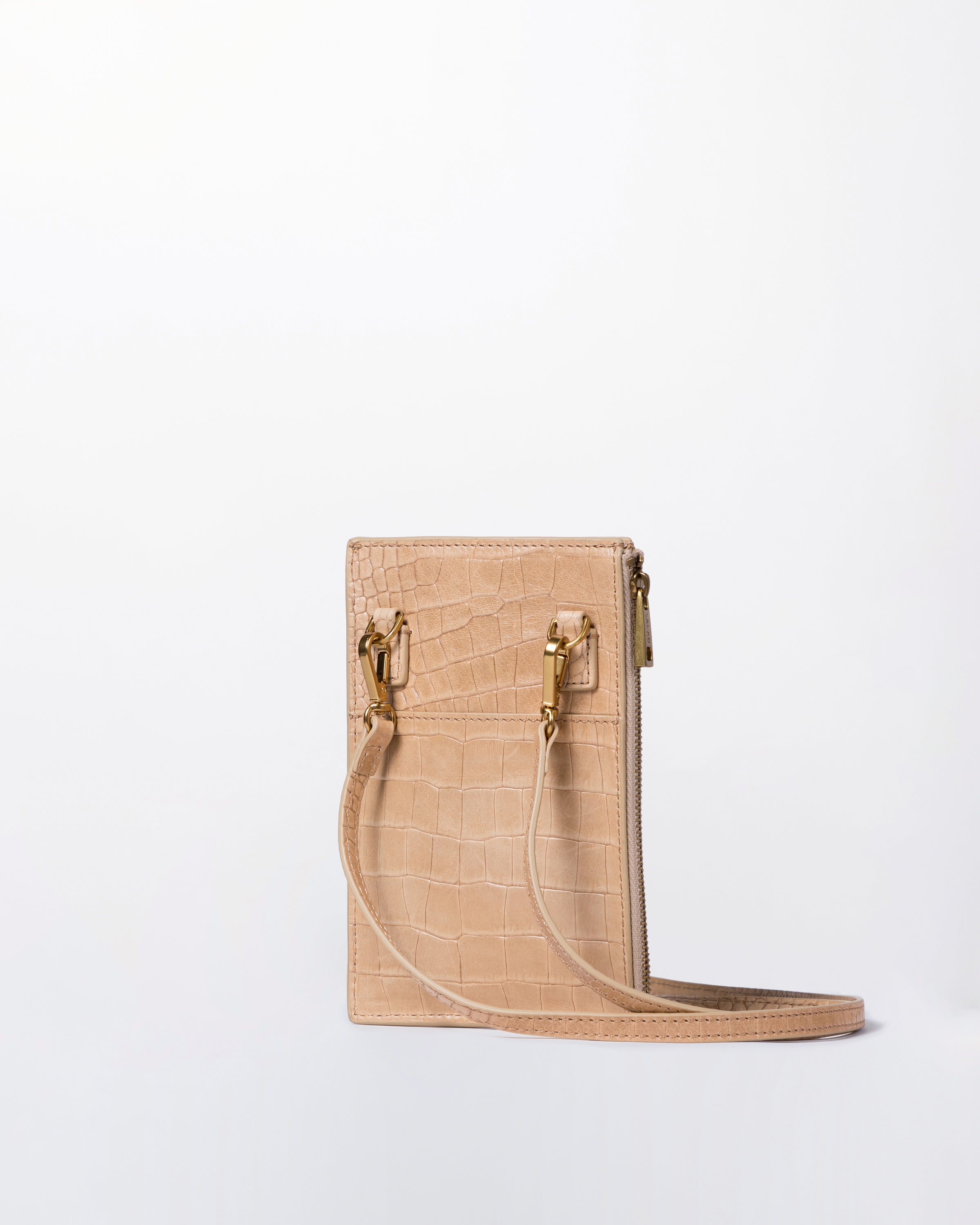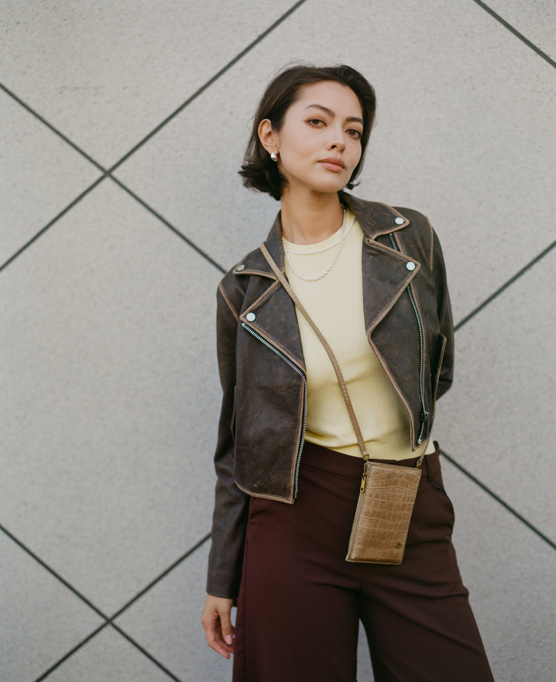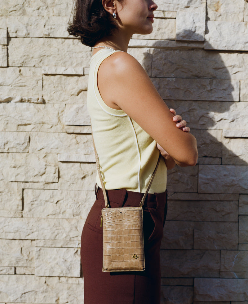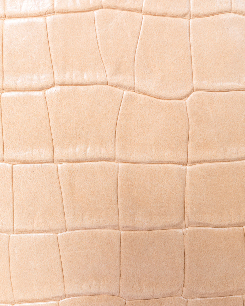 • Front slip pocket for cell phone • Side zipper pocket for small items or cards • Back panel with gusset • Detachable and adjustable long shoulder strap • Italian crocodile-embossed soft leather, soft to the touch and lightweight