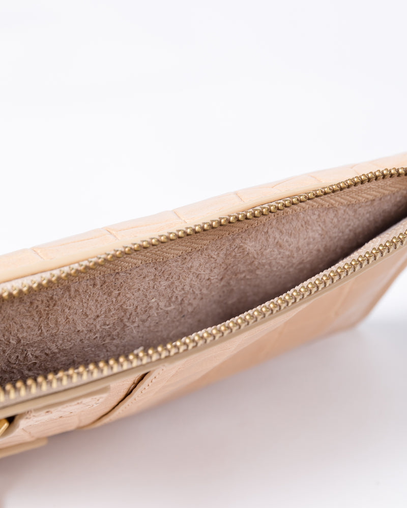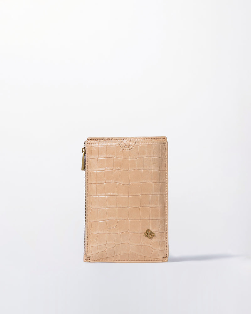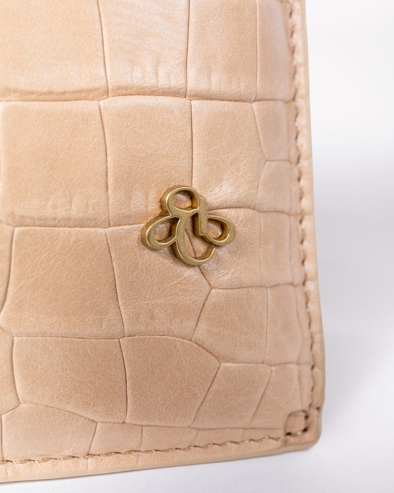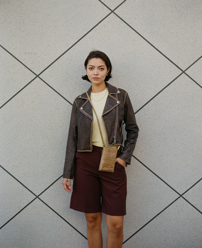 • Front slip pocket for cell phone • Side zipper pocket for small items or cards • Back panel with gusset • Detachable and adjustable long shoulder strap • Italian crocodile-embossed soft leather, soft to the touch and lightweight