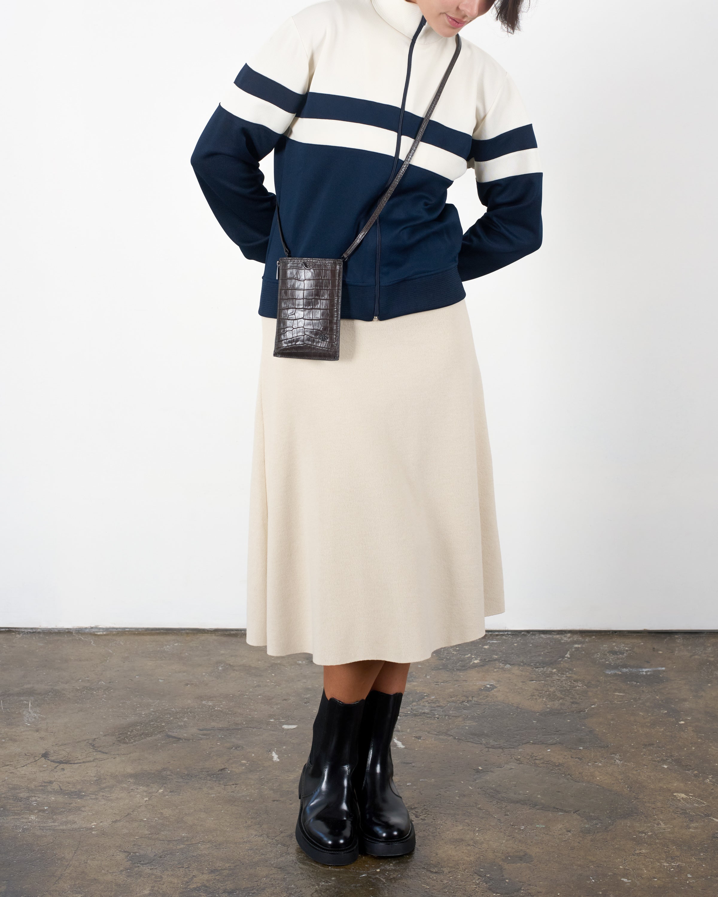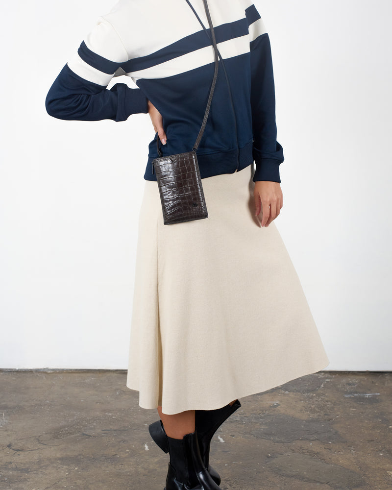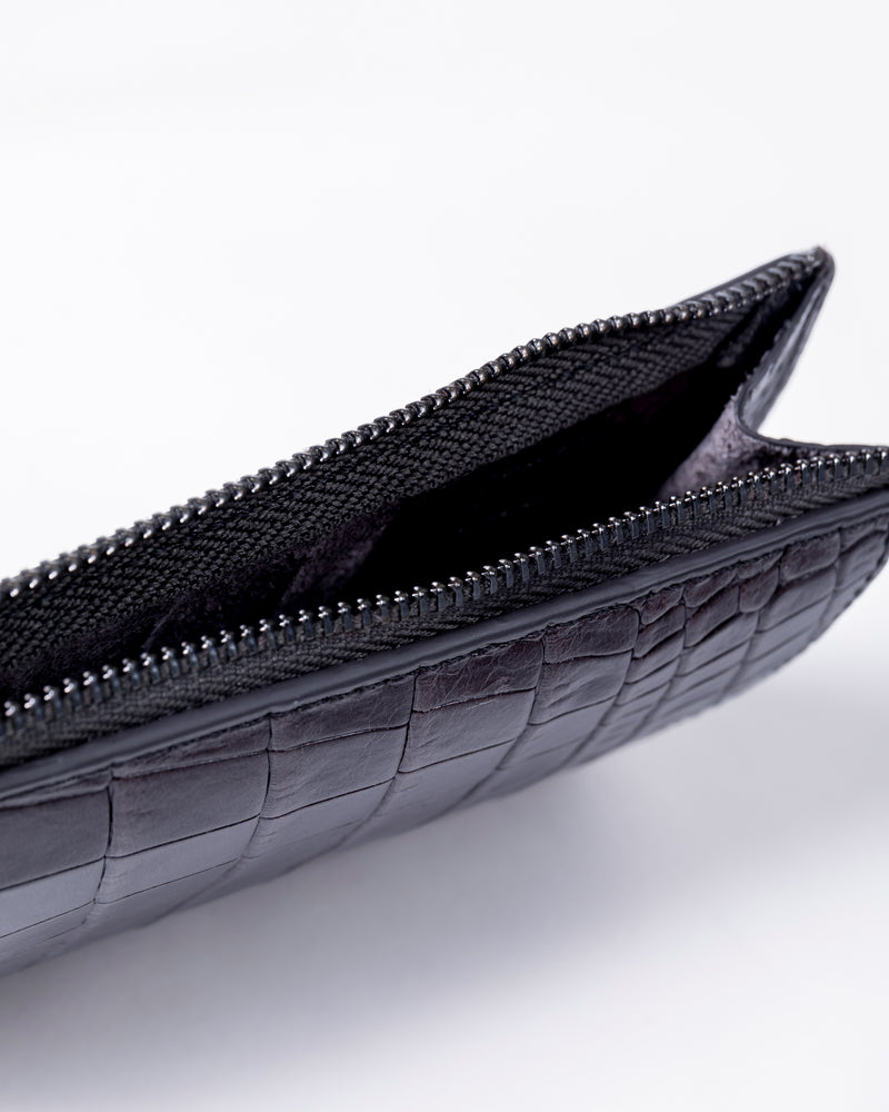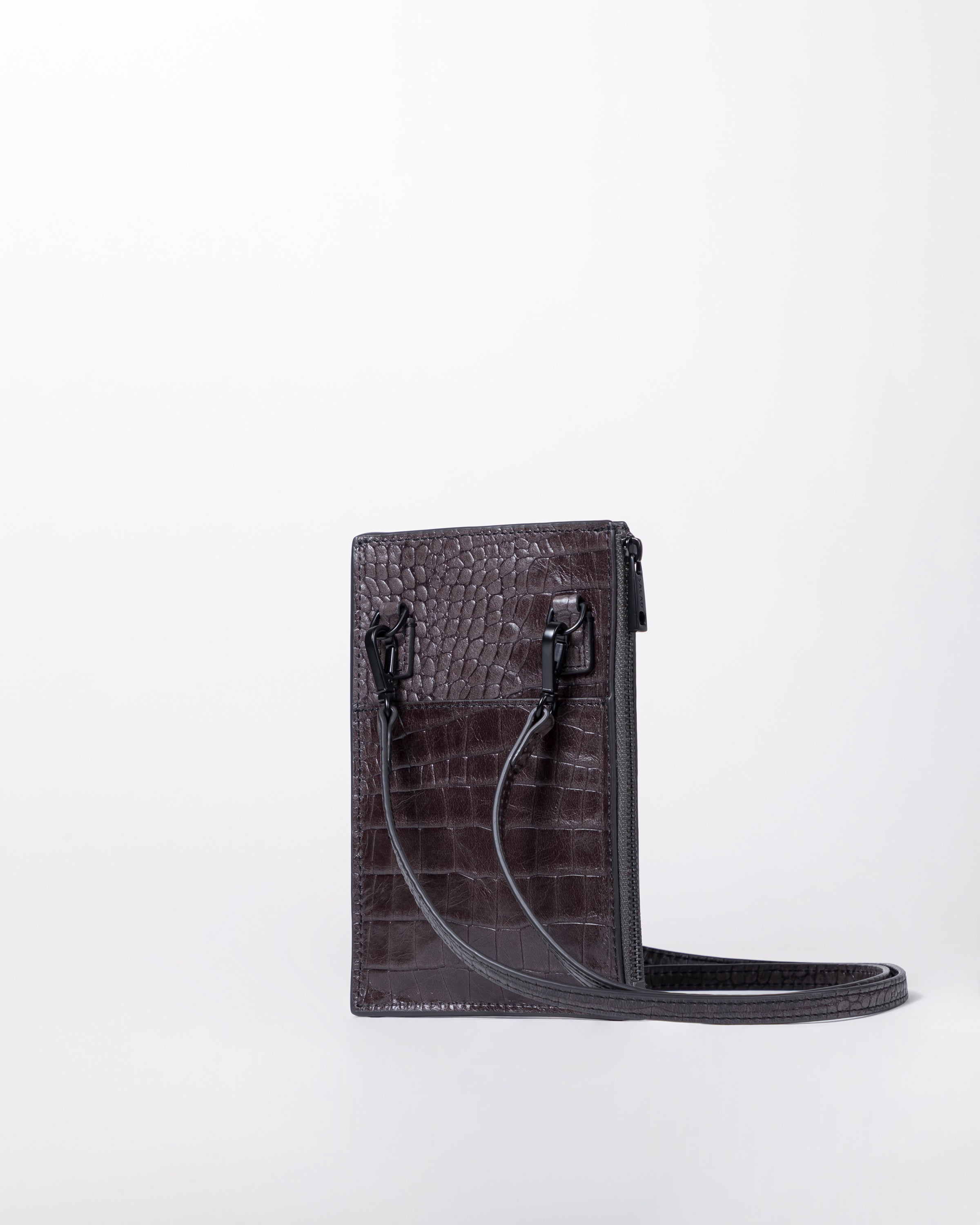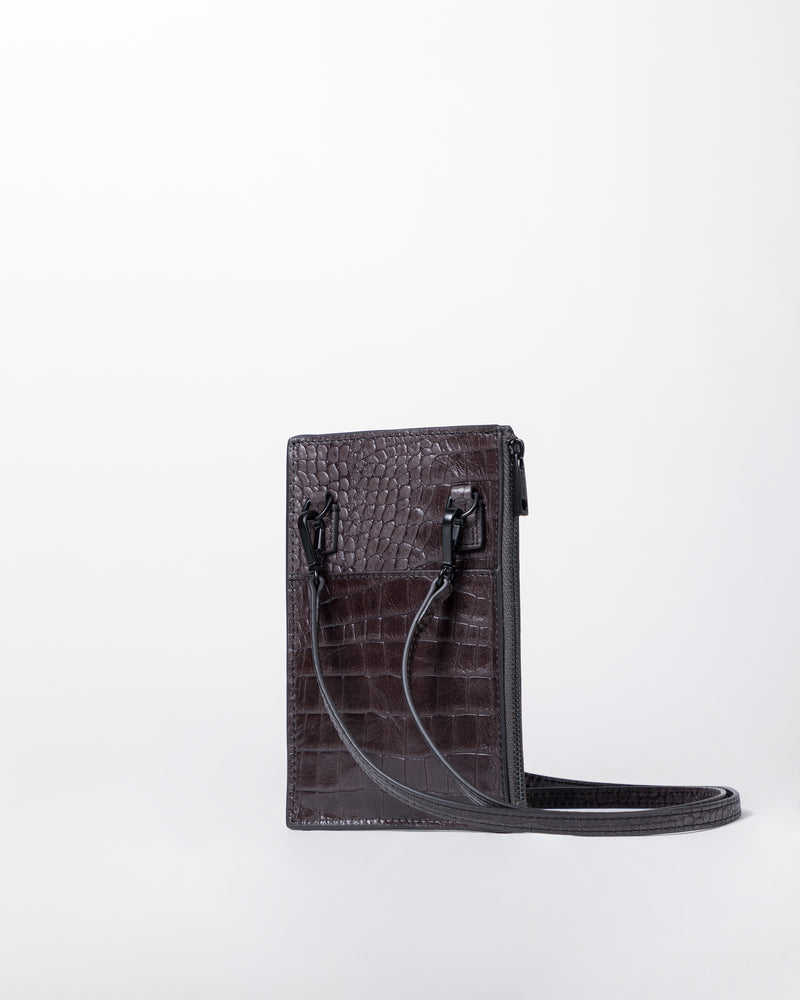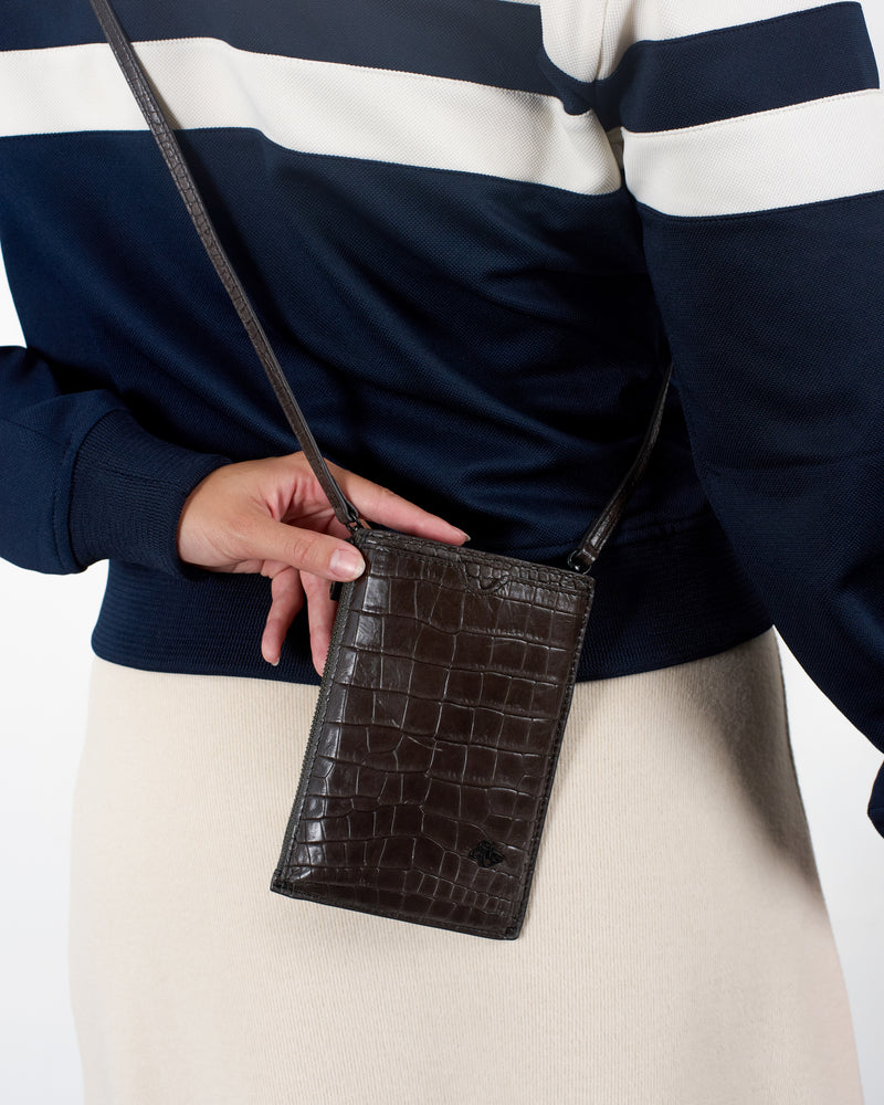 • Front slip pocket for mobile phone • Side zipper pocket for small items or cards • Back slip compartment • Detachable and adjustable long shoulder strap • Italian embossed crocodile leather, soft to the touch and lightweight