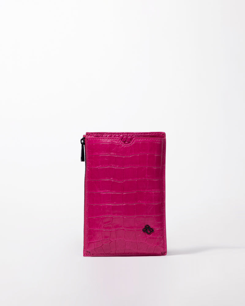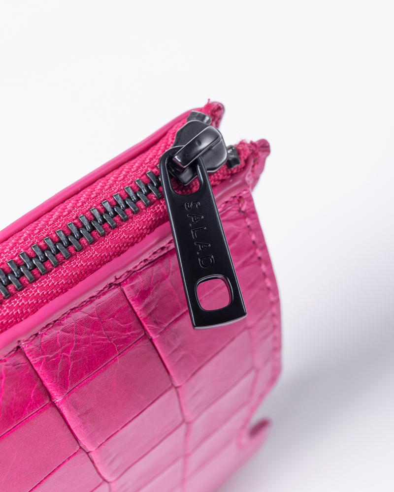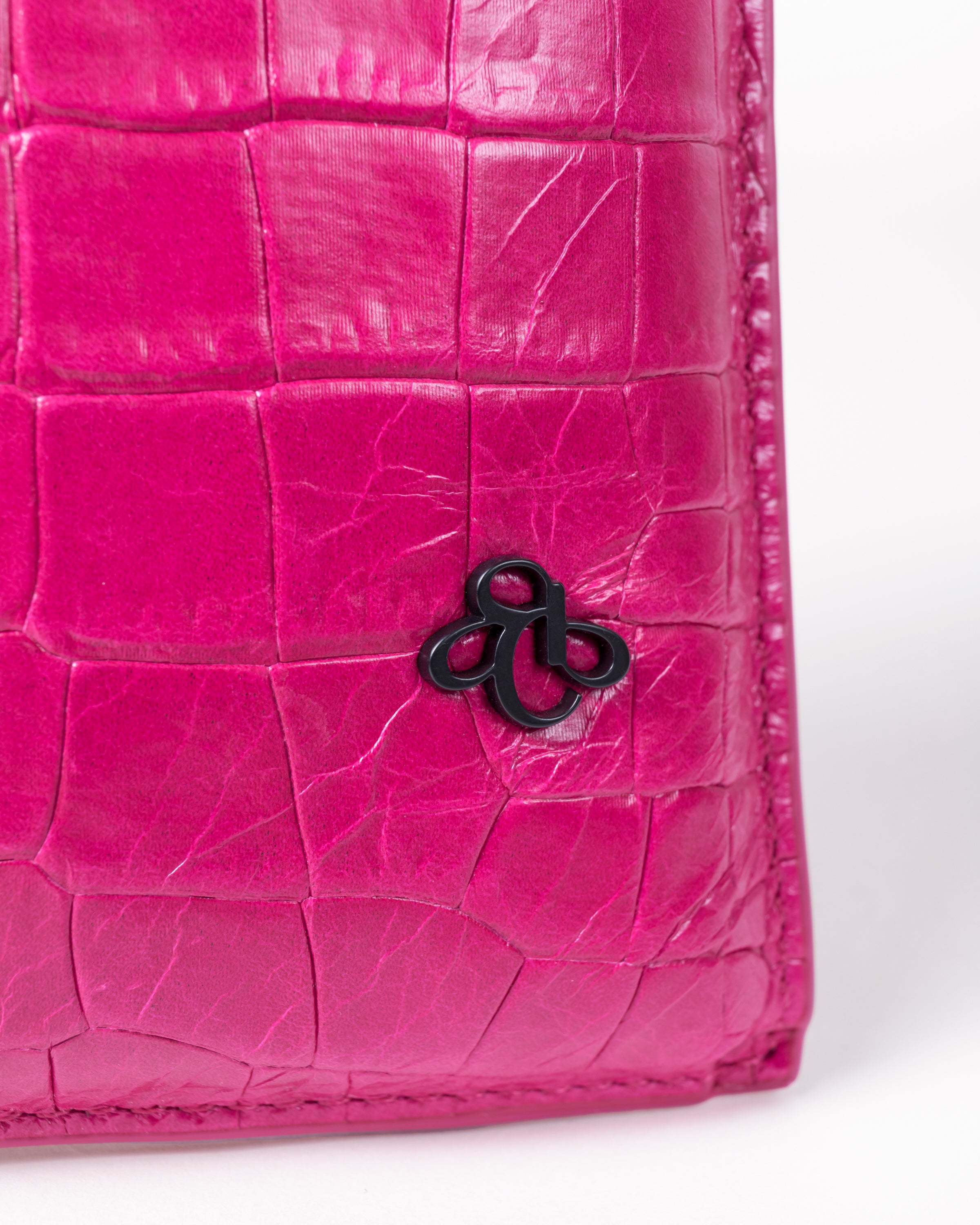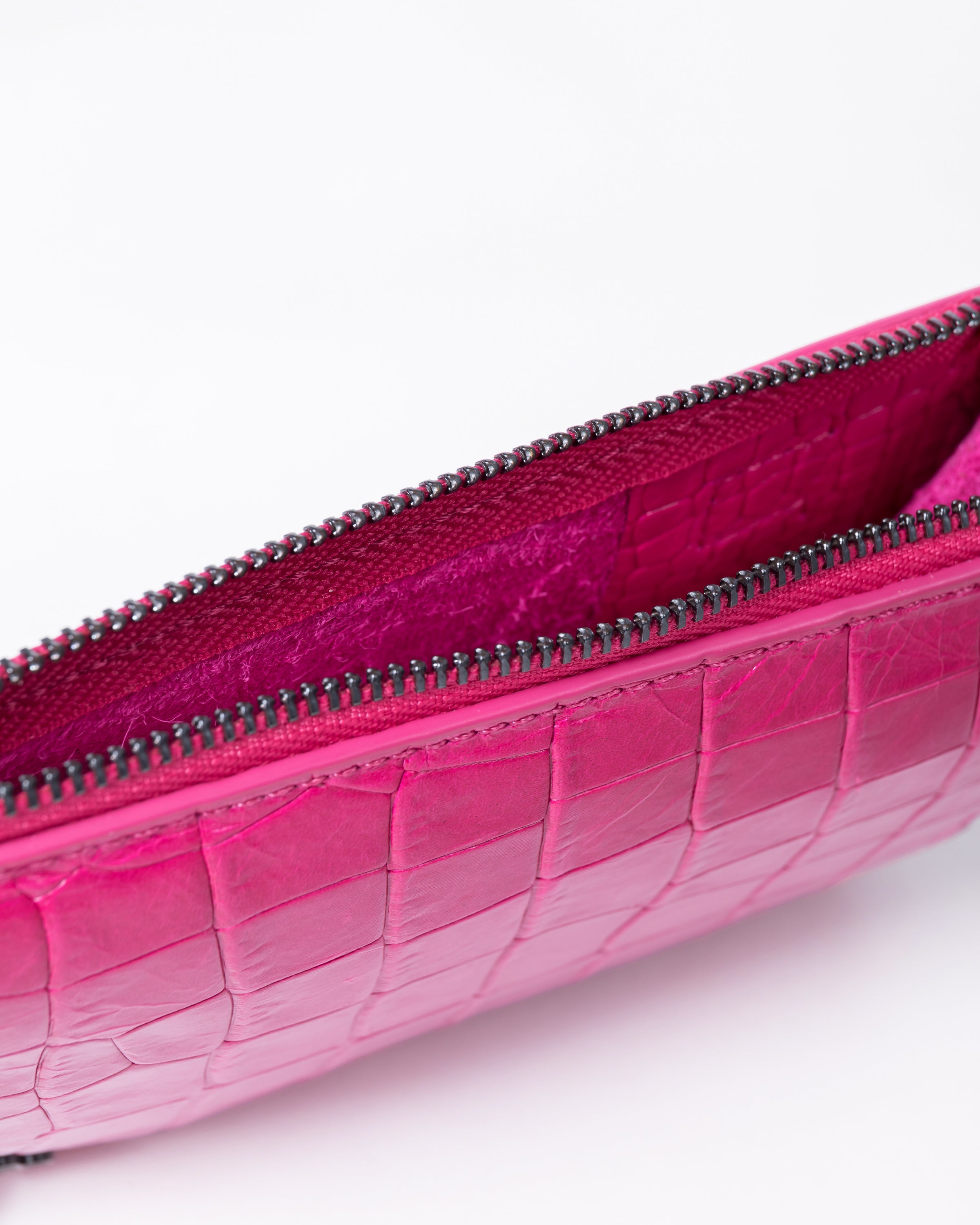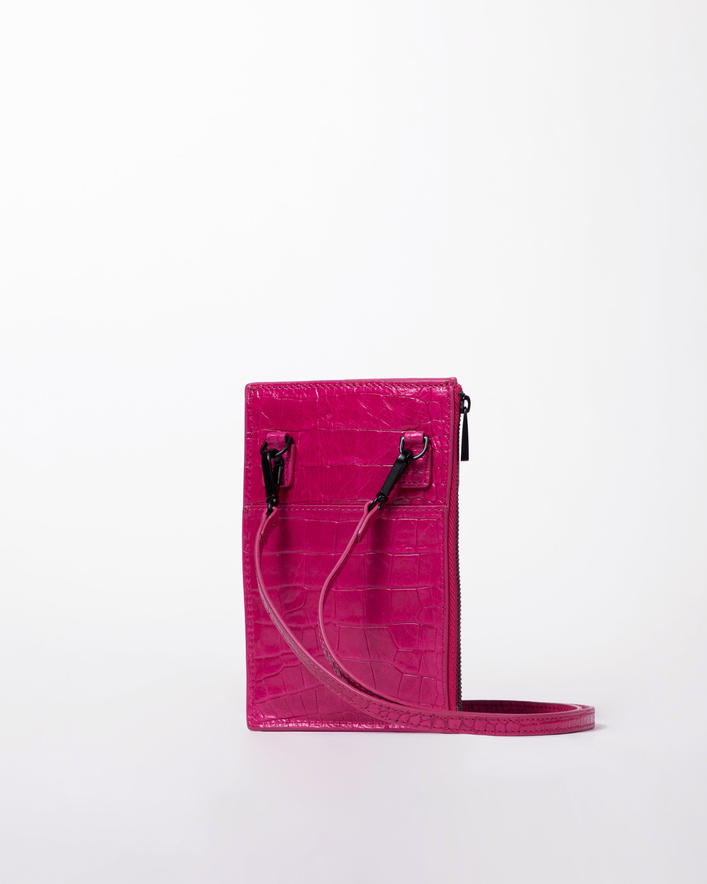 • Front slip pocket for cell phone • Side zipper pocket for small items or cards • Back panel with gusset • Detachable and adjustable long shoulder strap • Italian crocodile-embossed soft leather, soft to the touch and lightweight