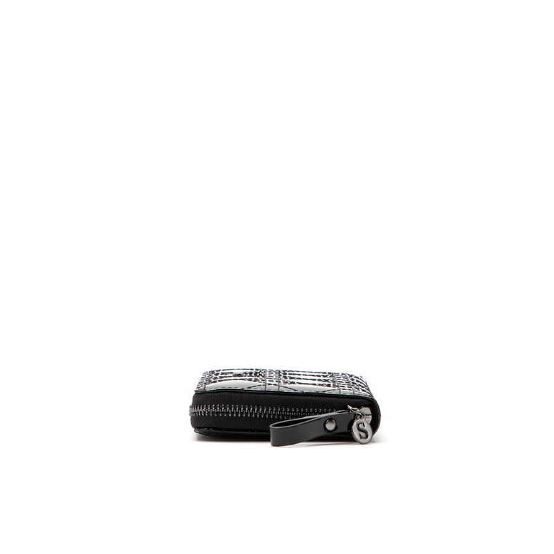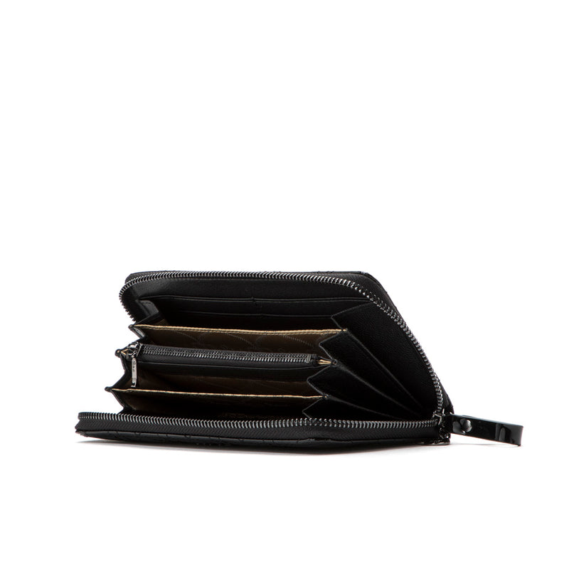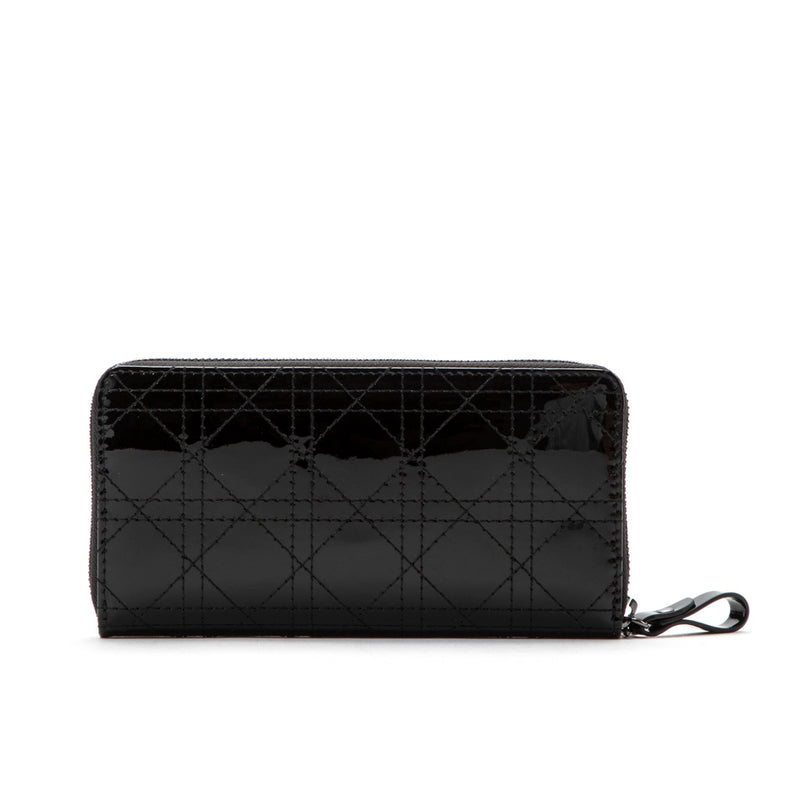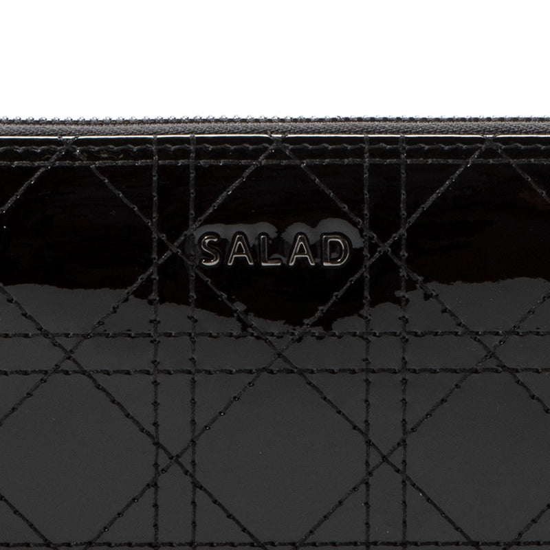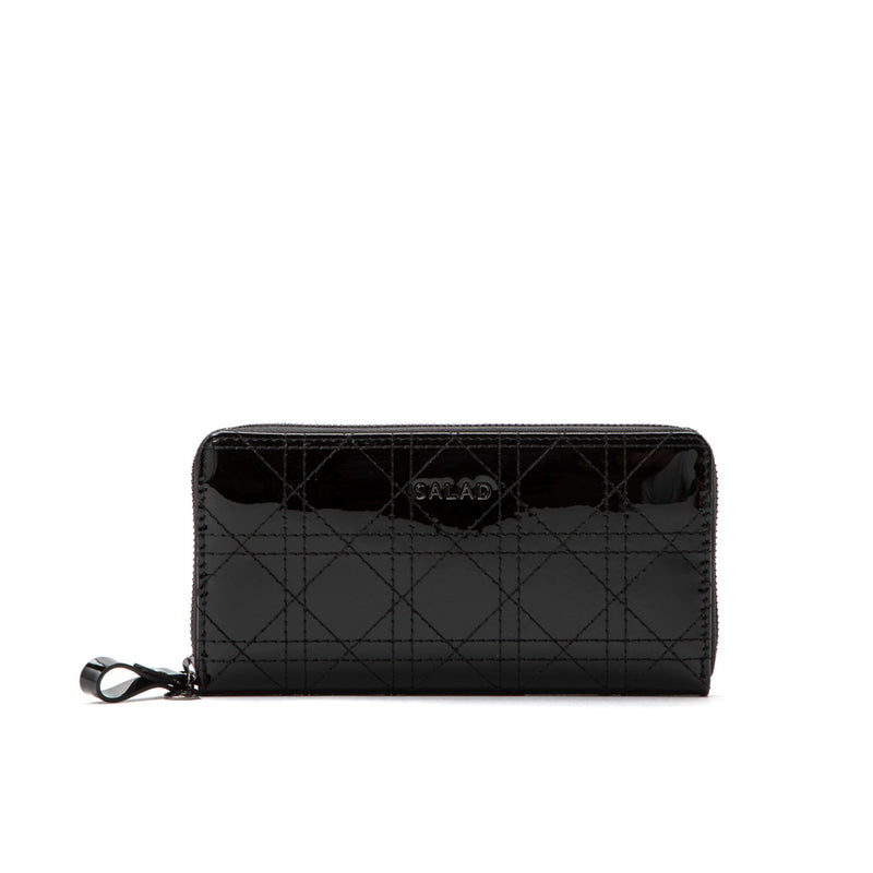 Quilted effect; inside four gusseted pockets for banknotes, a partition zippered coin pocket, twelve credit card slots; main material: cow patent leather, smooth surface with shiny interior materials: goatskin 19(L) x 2 (D) x 10 (H) cm