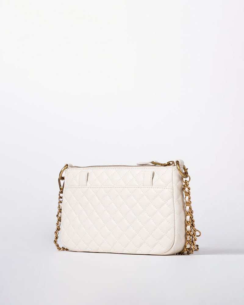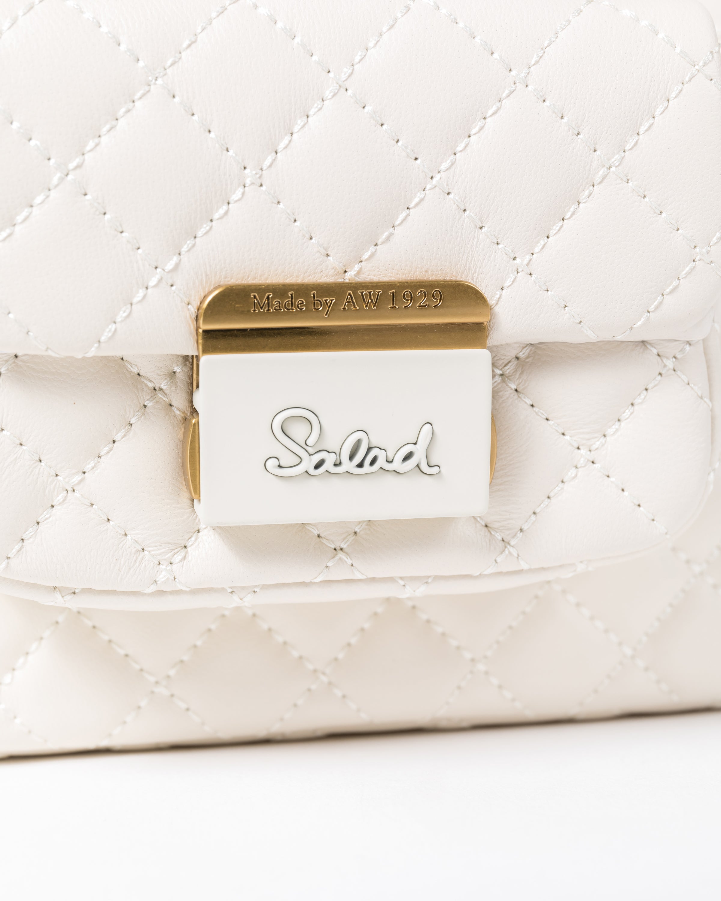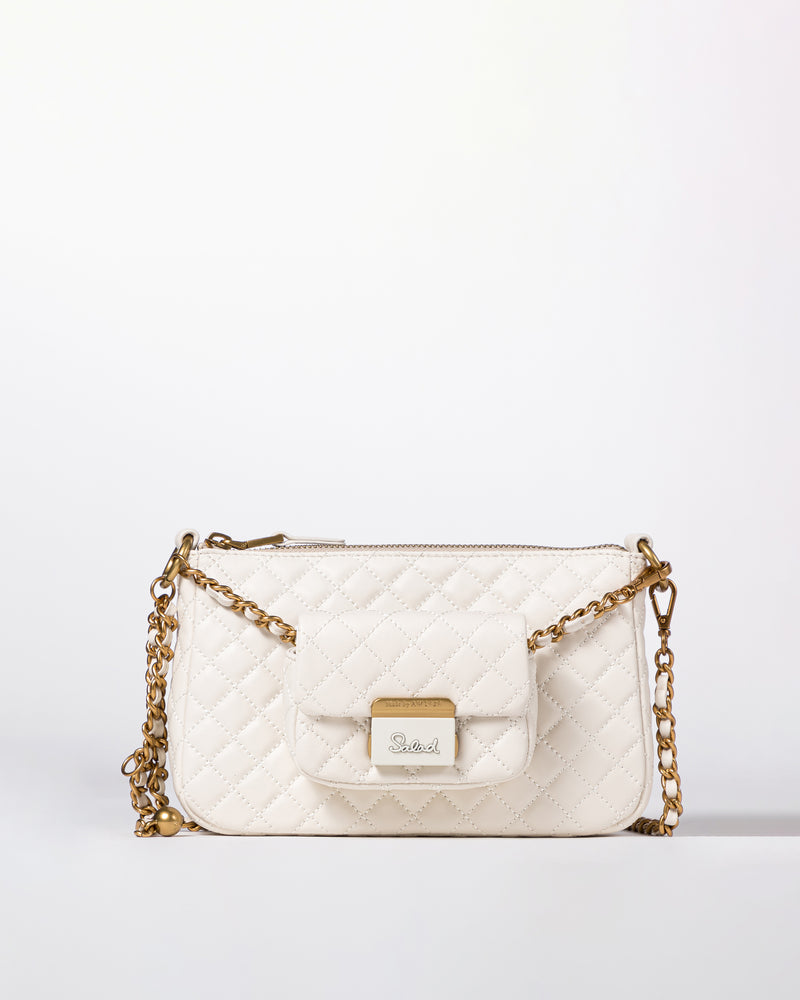 • 菱形絎縫皮革表面效果主袋帶拉鍊開合,可拆卸前幅小包採用推鎖式前翻蓋