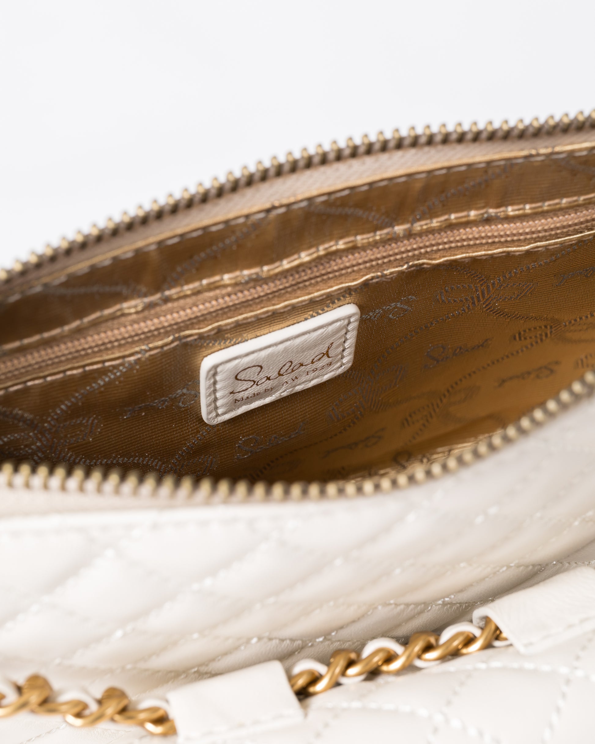 • 可調節鏈條綴飾皮革肩帶,帶有6個小環,可作 6 段長度調節