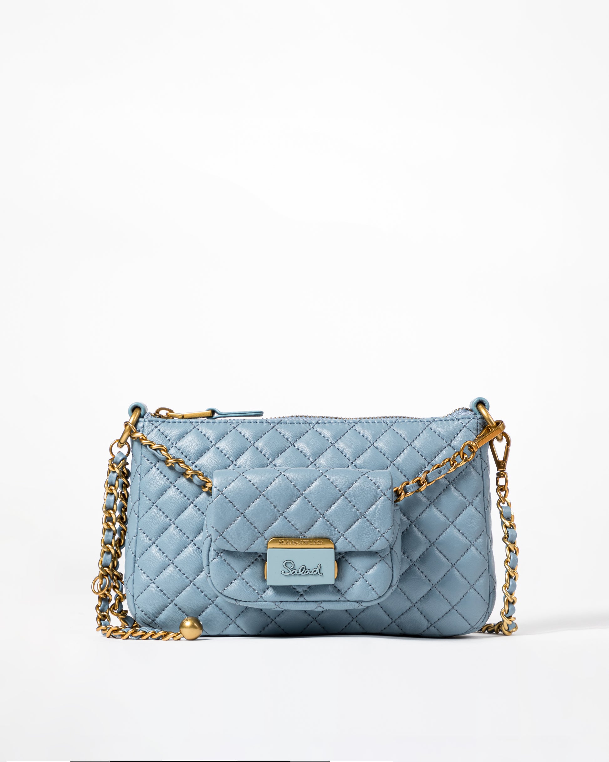 • 菱形絎縫皮革表面效果主袋帶拉鍊開合,可拆卸前幅小包採用推鎖式前翻蓋