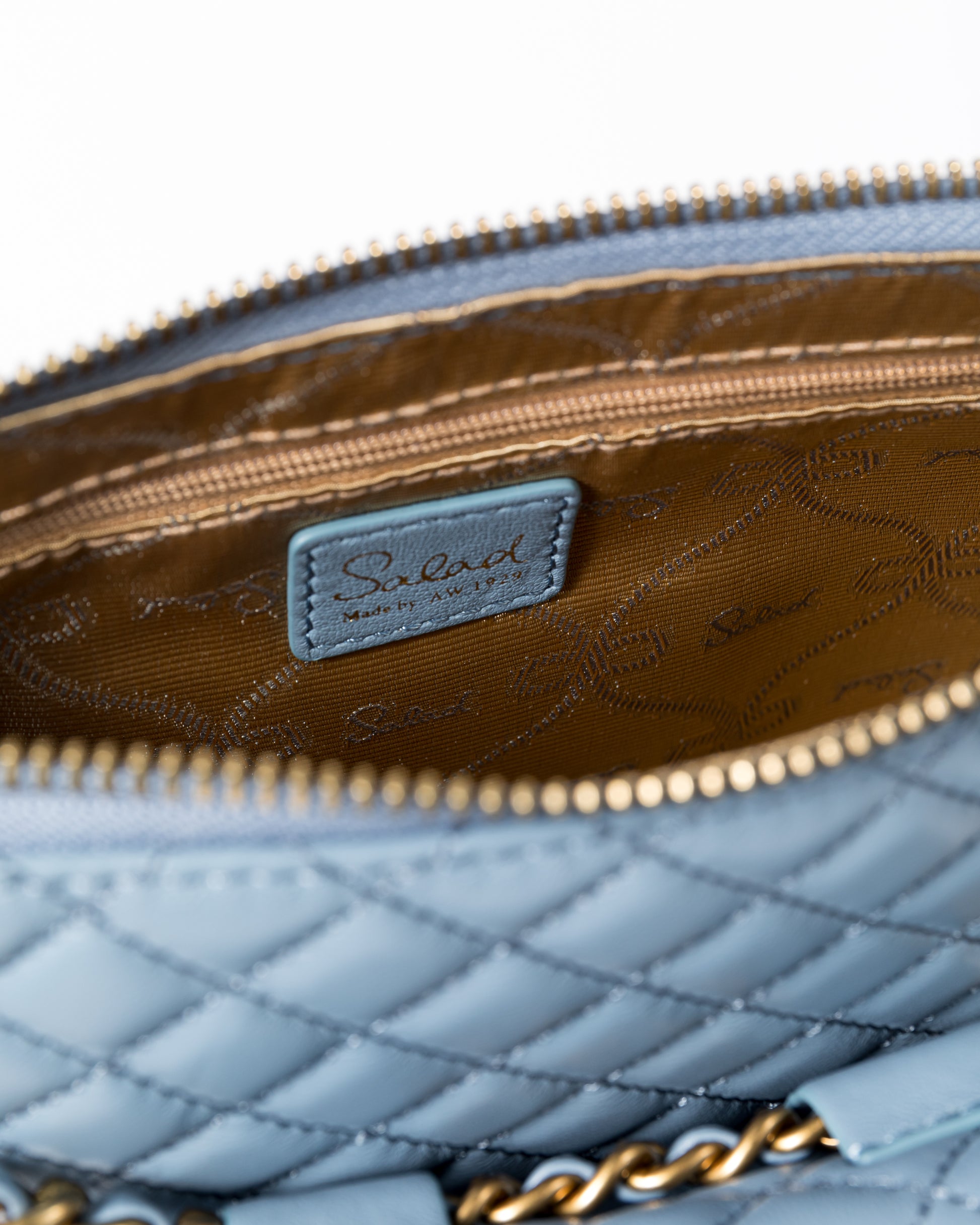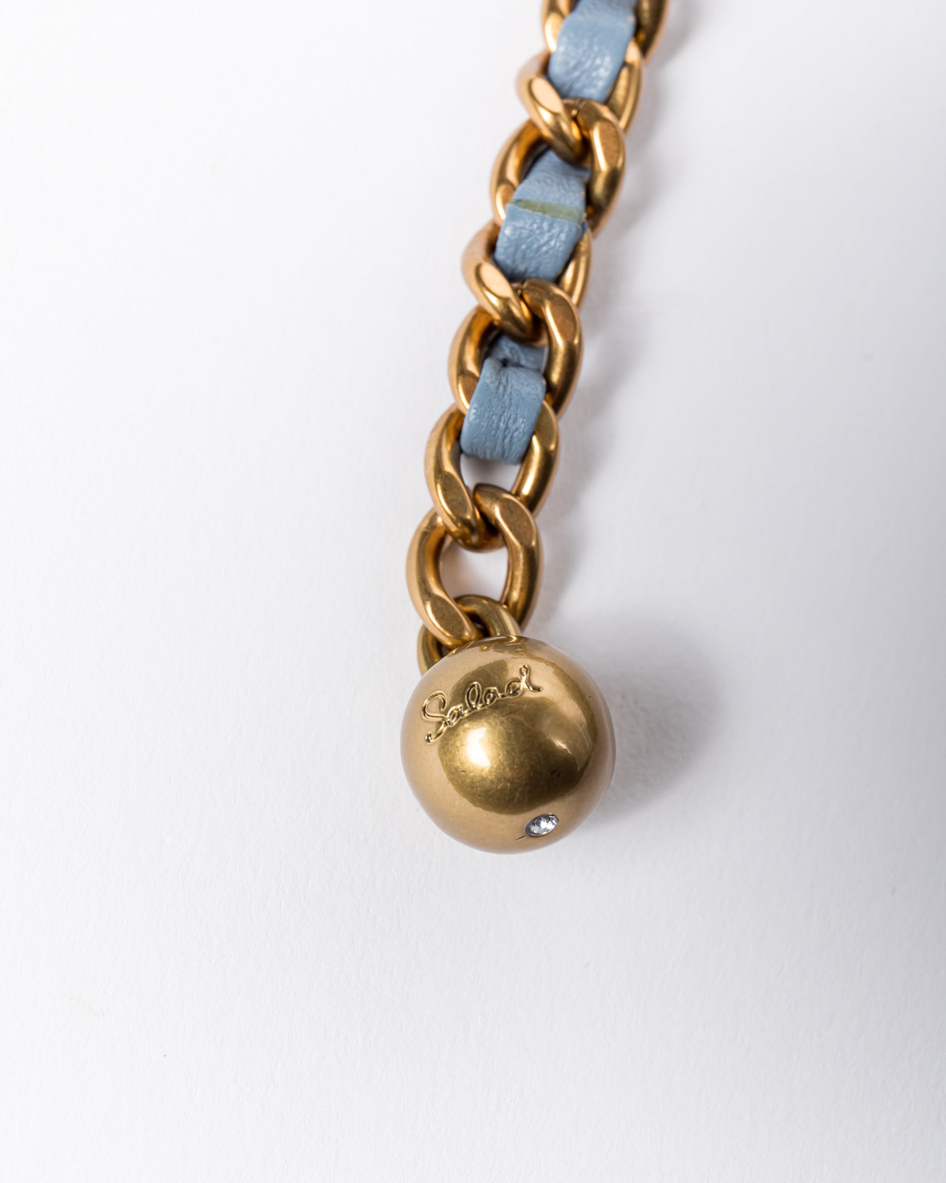• 可調節鏈條綴飾皮革肩帶,帶有6個小環,可作 6 段長度調節