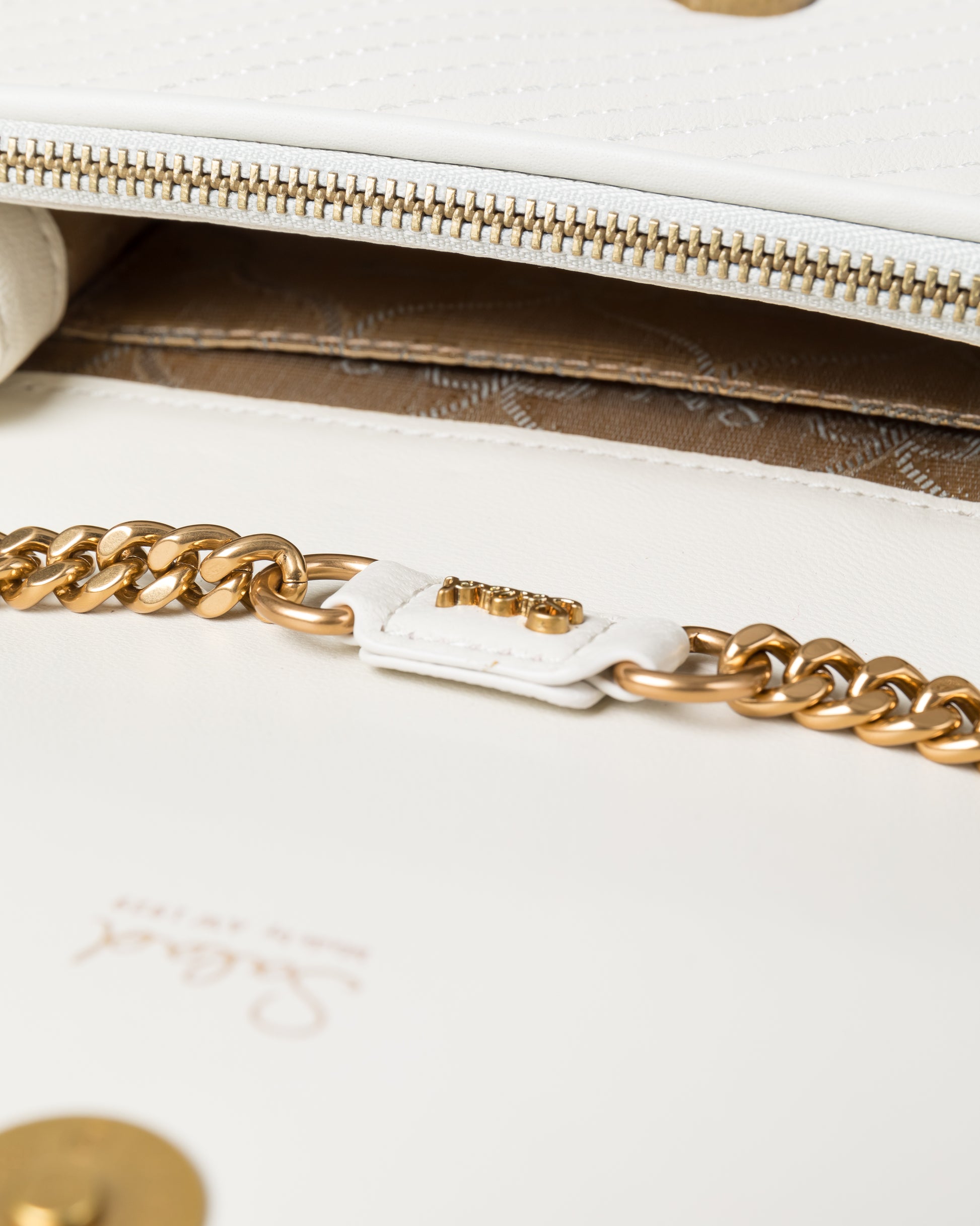 • 內有1個拉鍊袋及1個平貼插袋,背後有磁扣開合滑口袋 可調較式鏈飾皮革肩帶,無尾設計,使用時更方便順暢