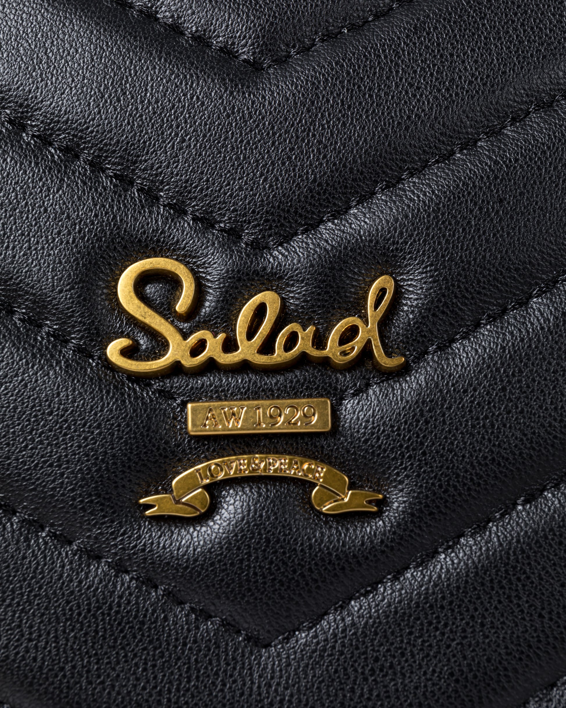 • 全袋飾有絎縫皮革效果,帶有磁性鈕扣的翻蓋,背後外插袋