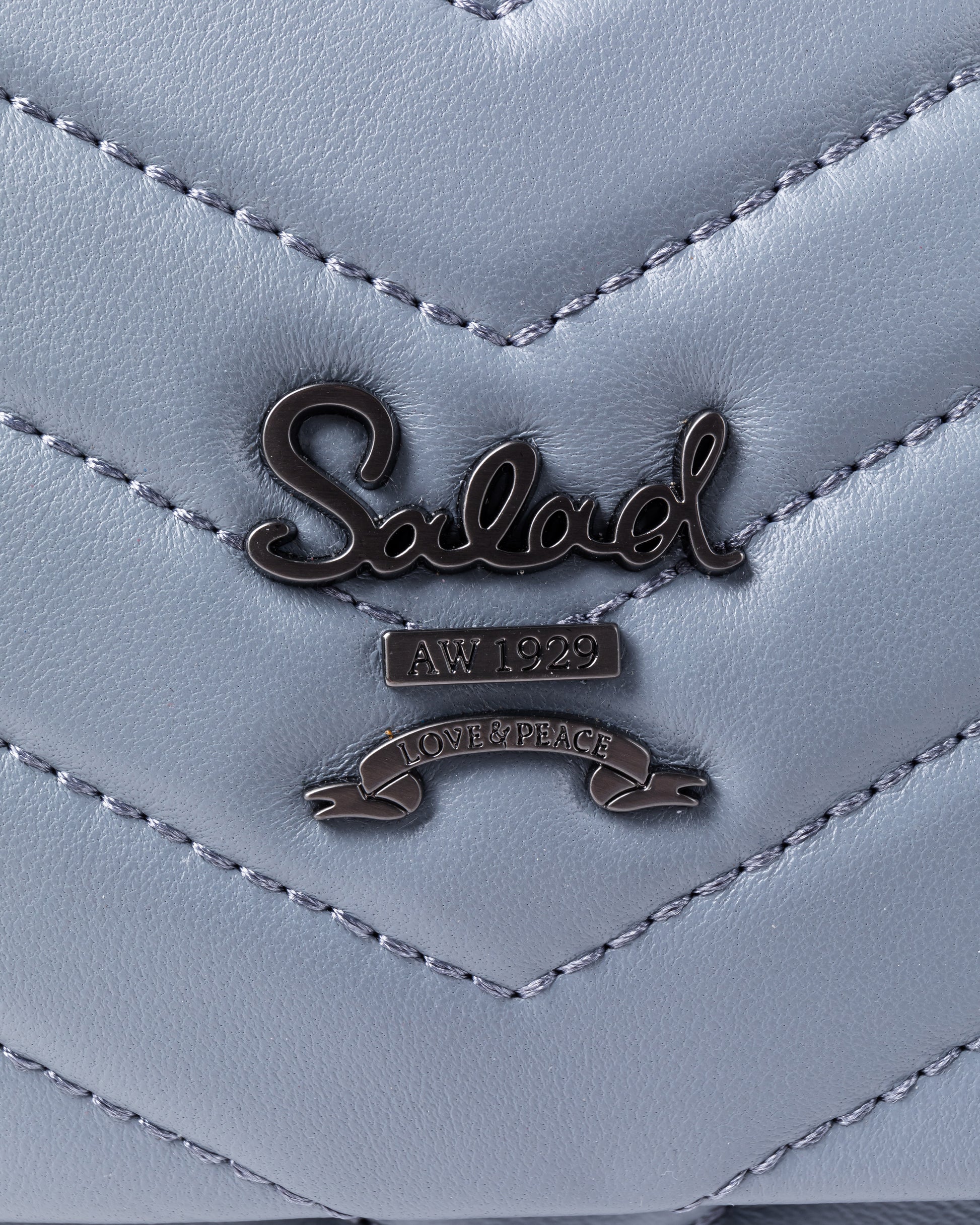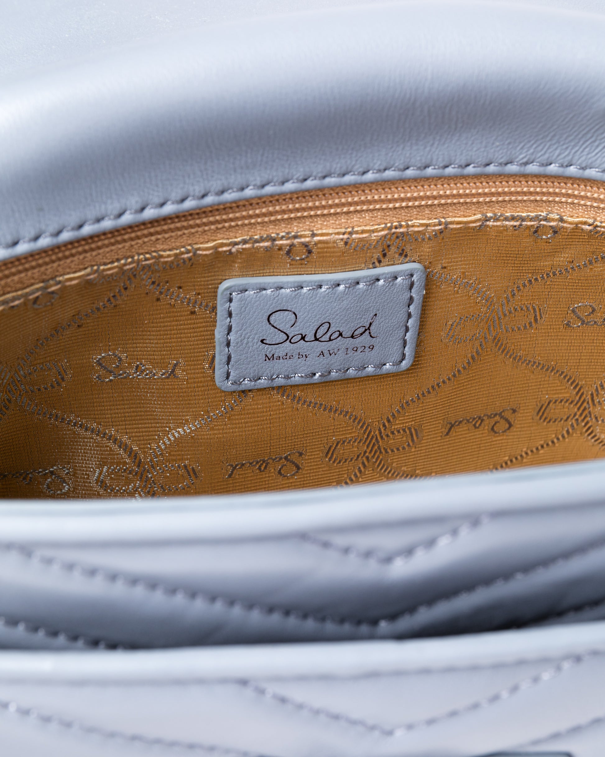 • 全袋飾有絎縫皮革效果,帶有磁性鈕扣的翻蓋,背後外插袋