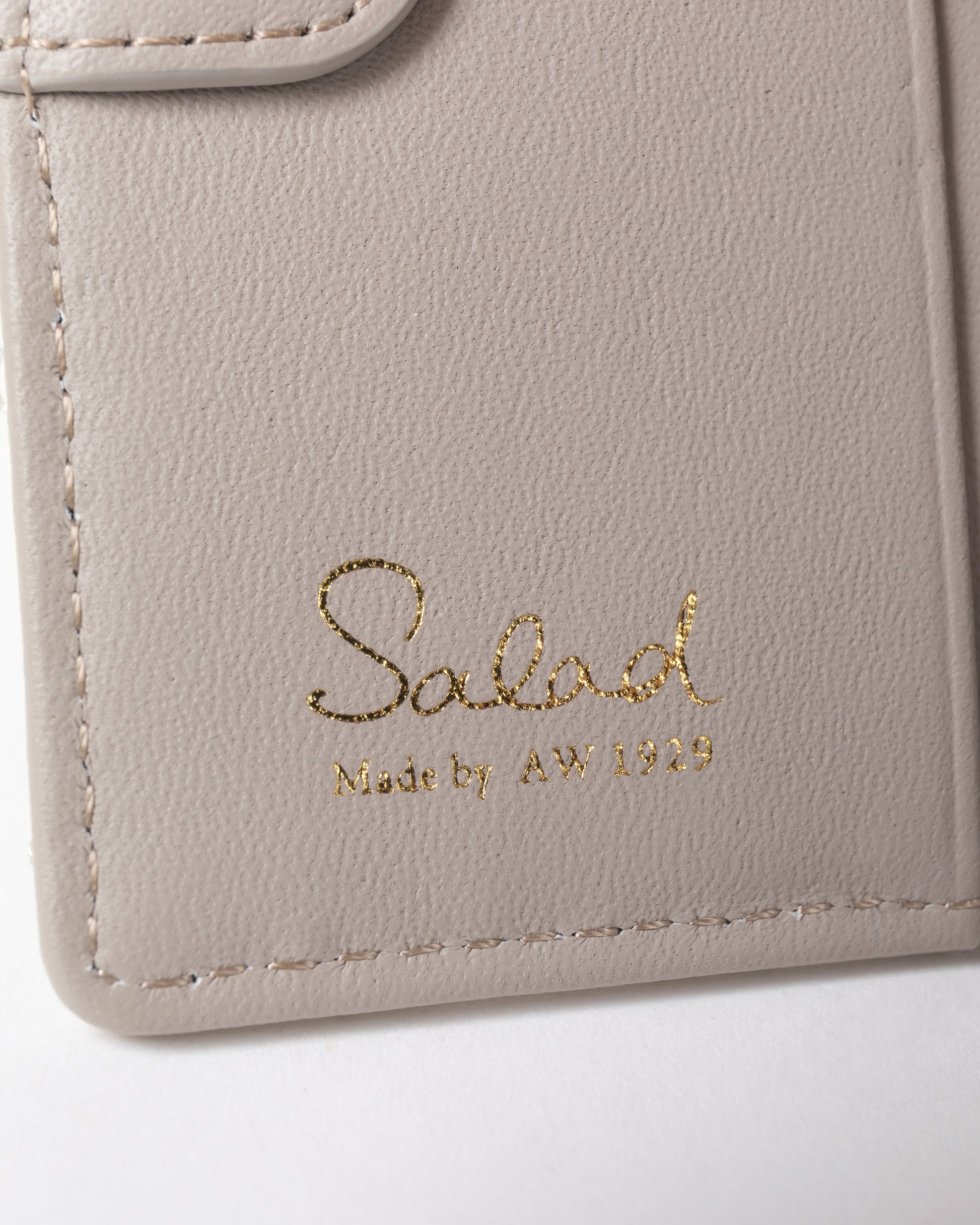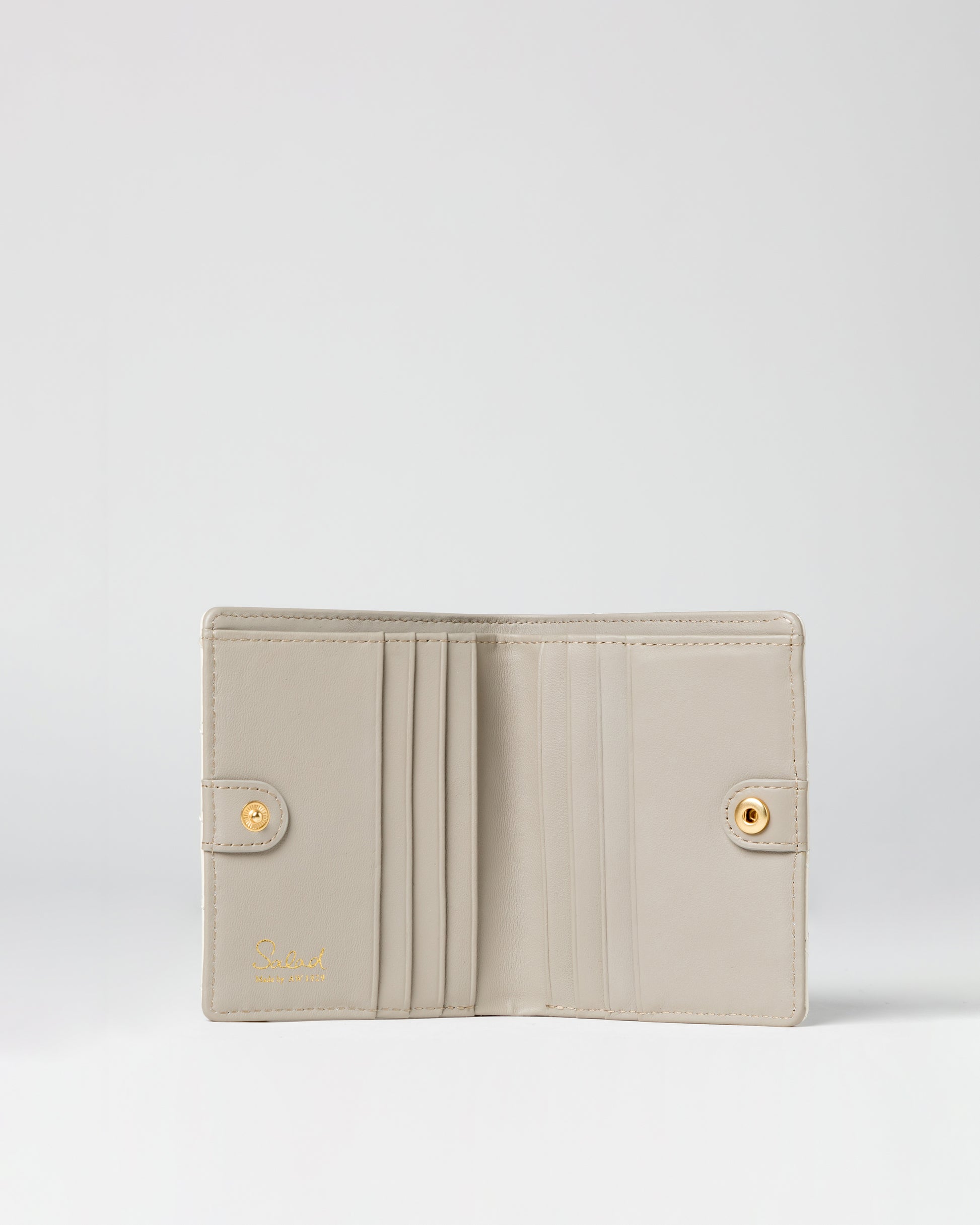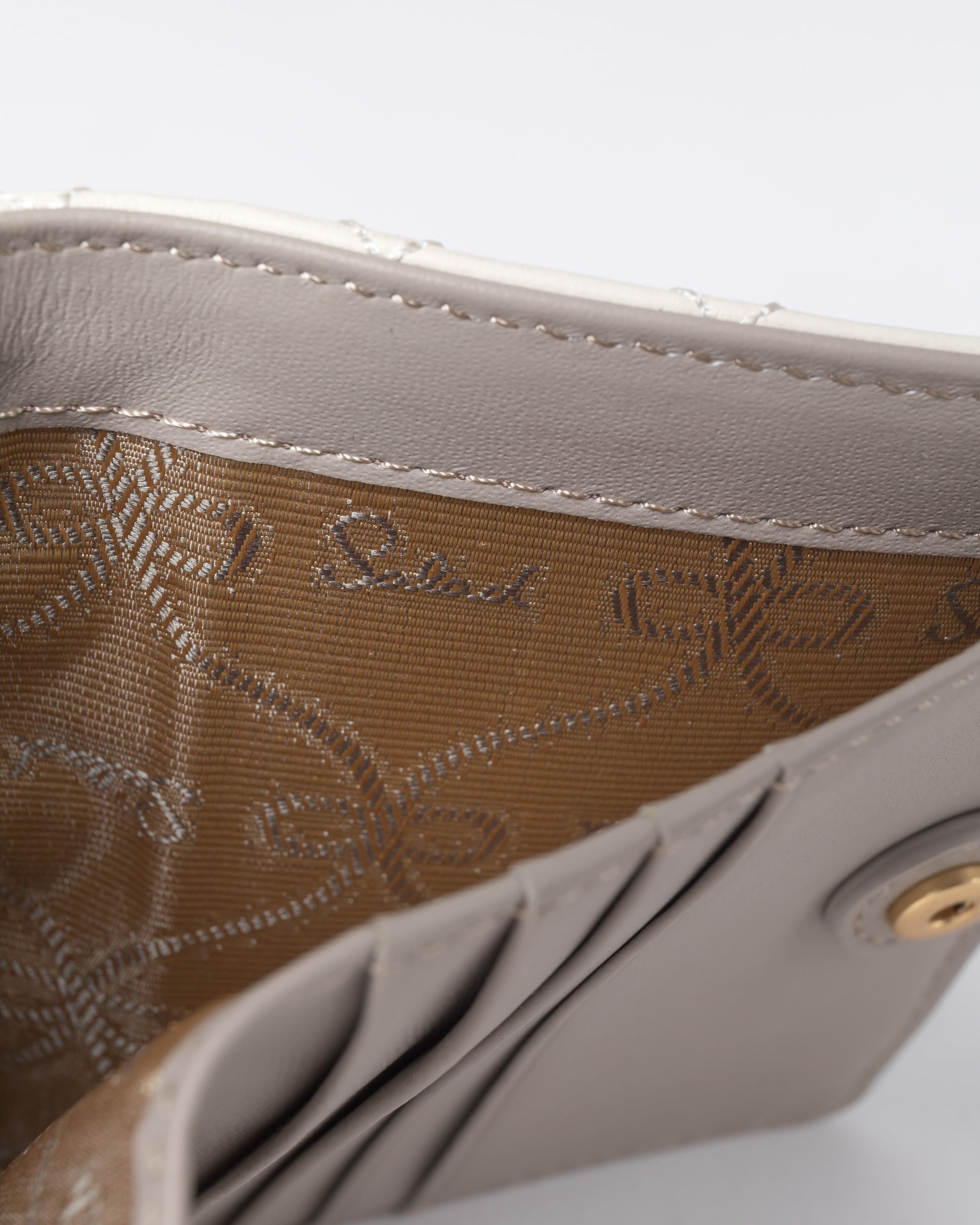 金屬鈕開合、內附一個鈔票隔層、八個信用卡夾層