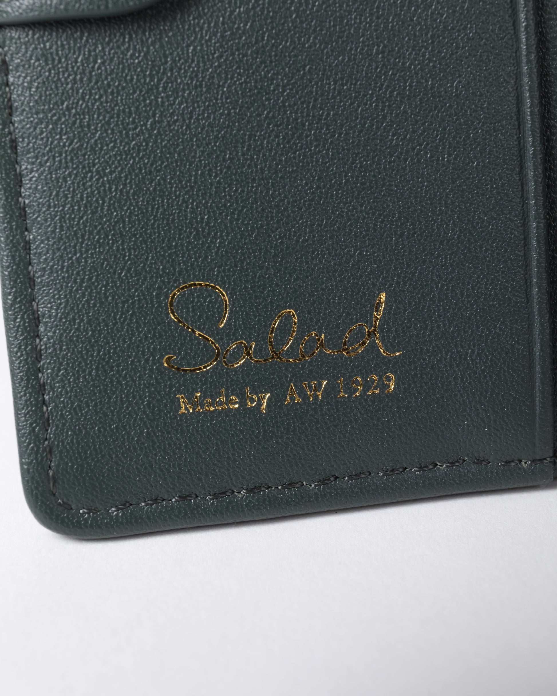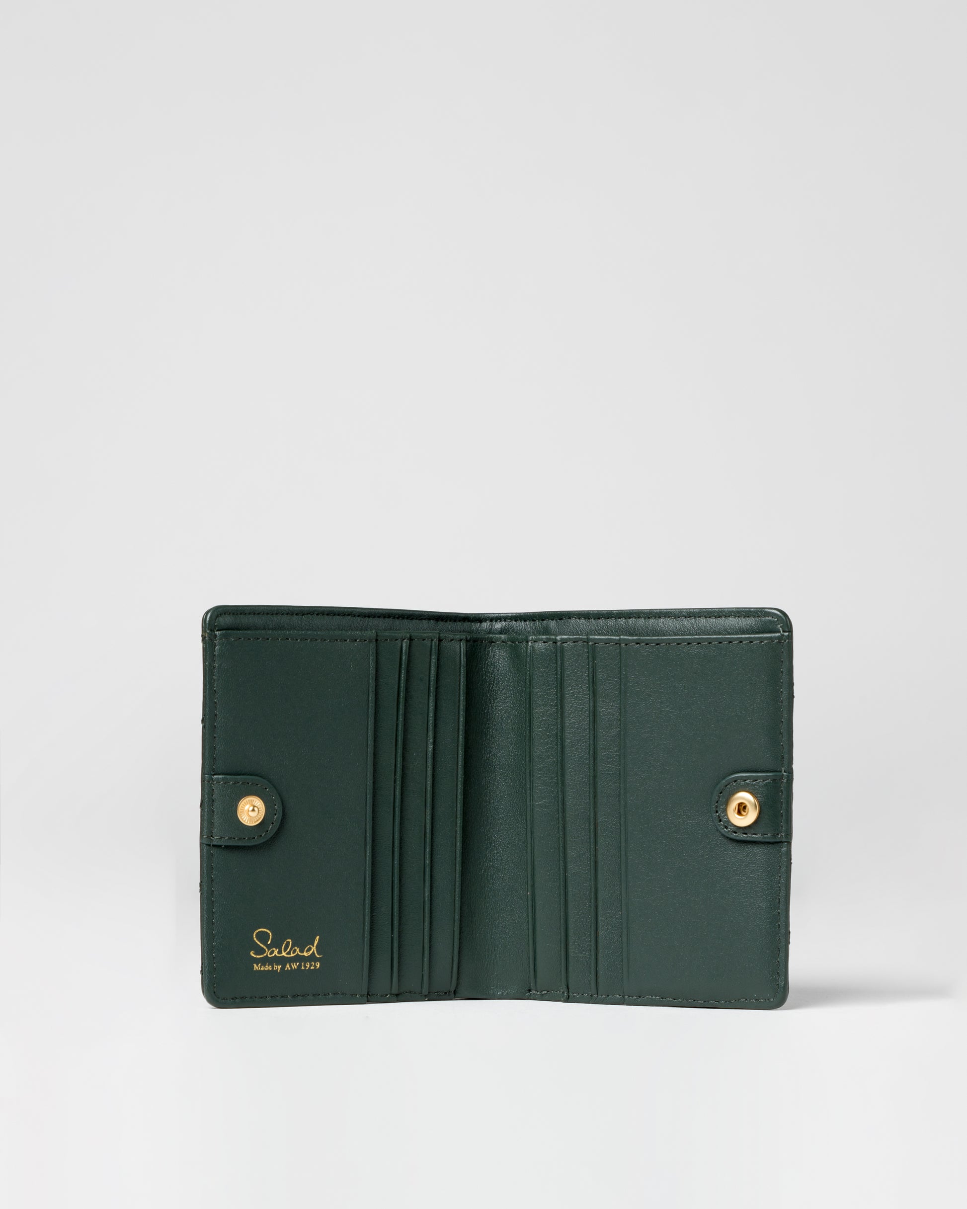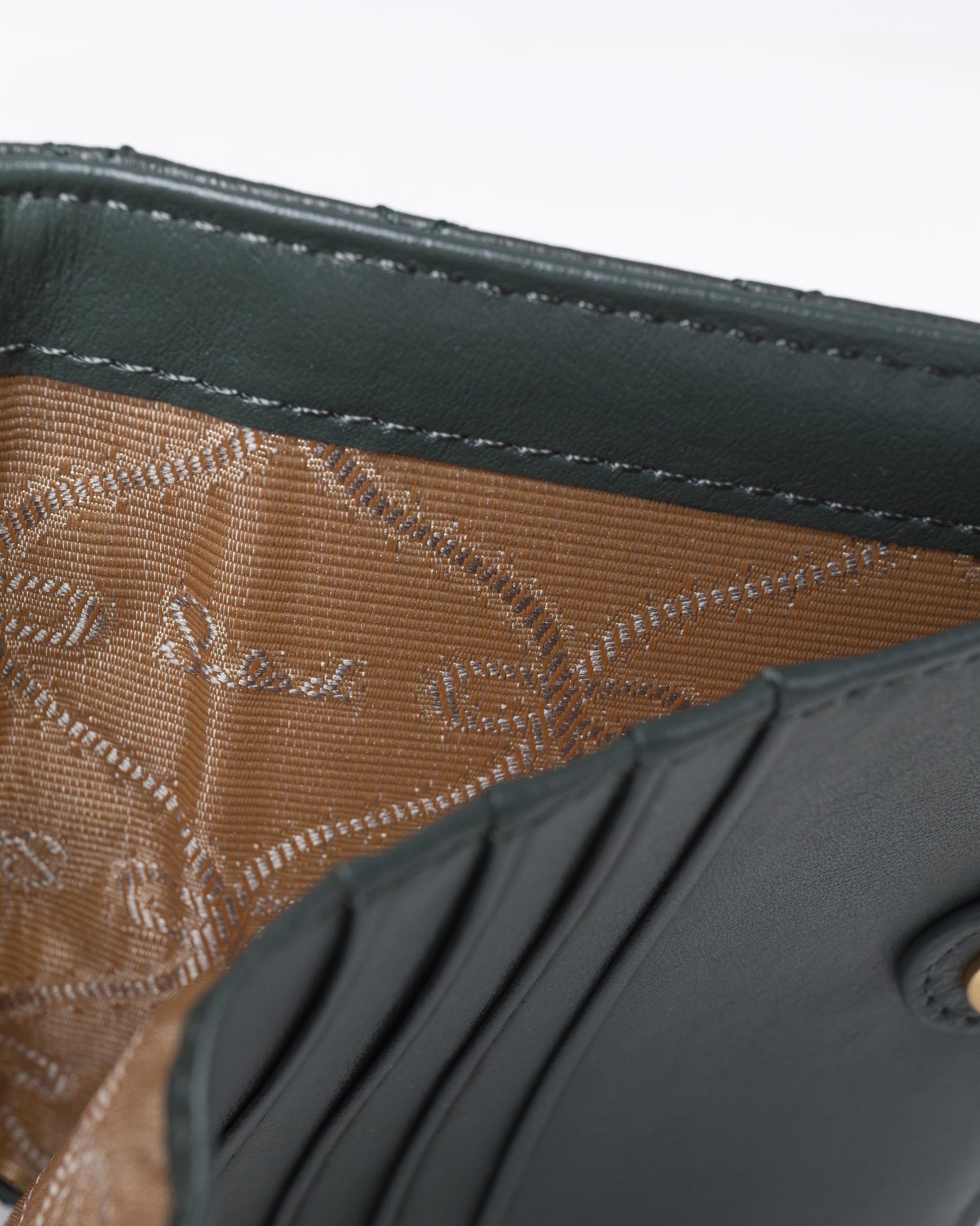 金屬鈕開合、內附一個鈔票隔層、八個信用卡夾層