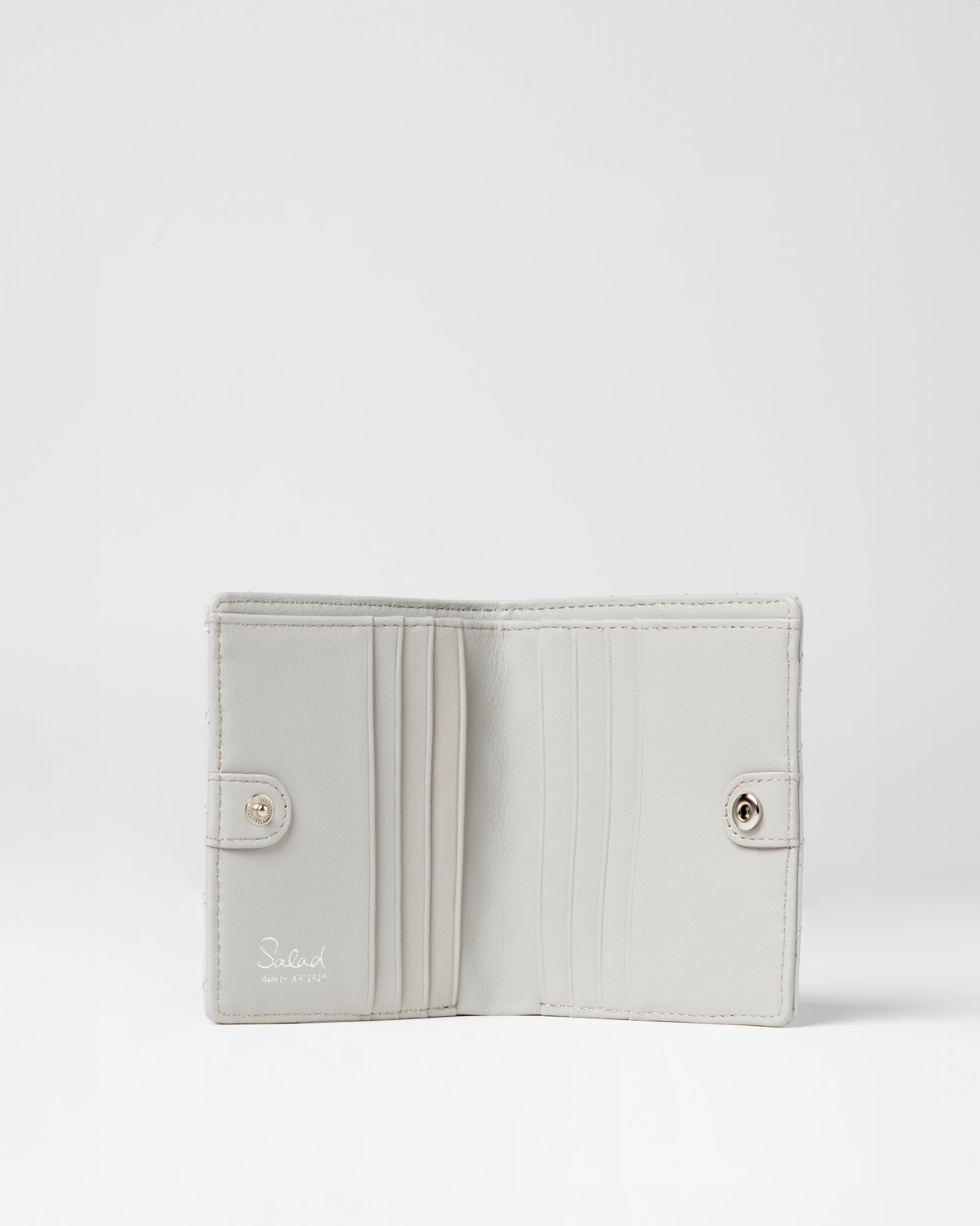金屬鈕開合、內附一個鈔票隔層、八個信用卡夾層