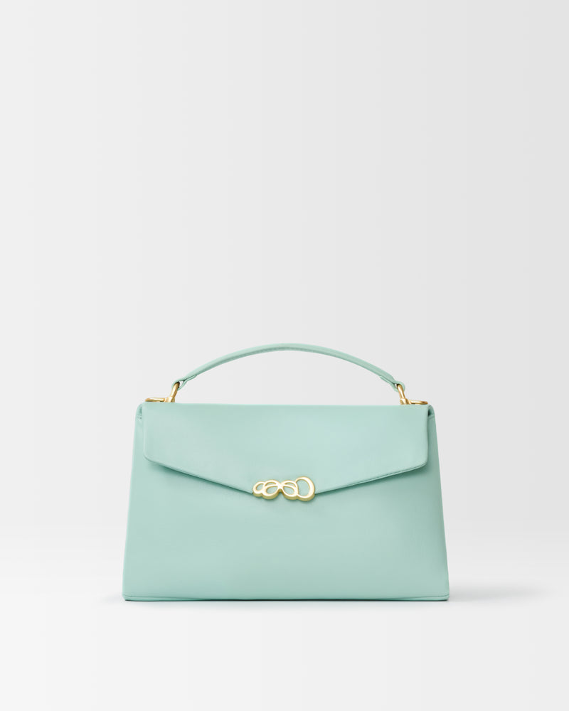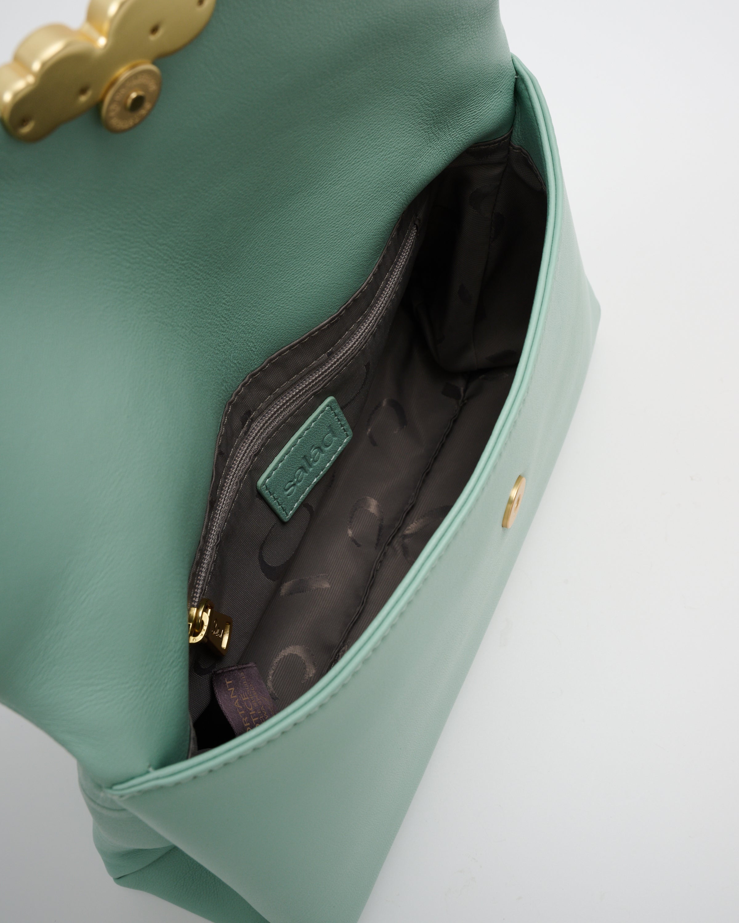 • 袋前幅裝飾有品牌金屬扣,增添時尚感