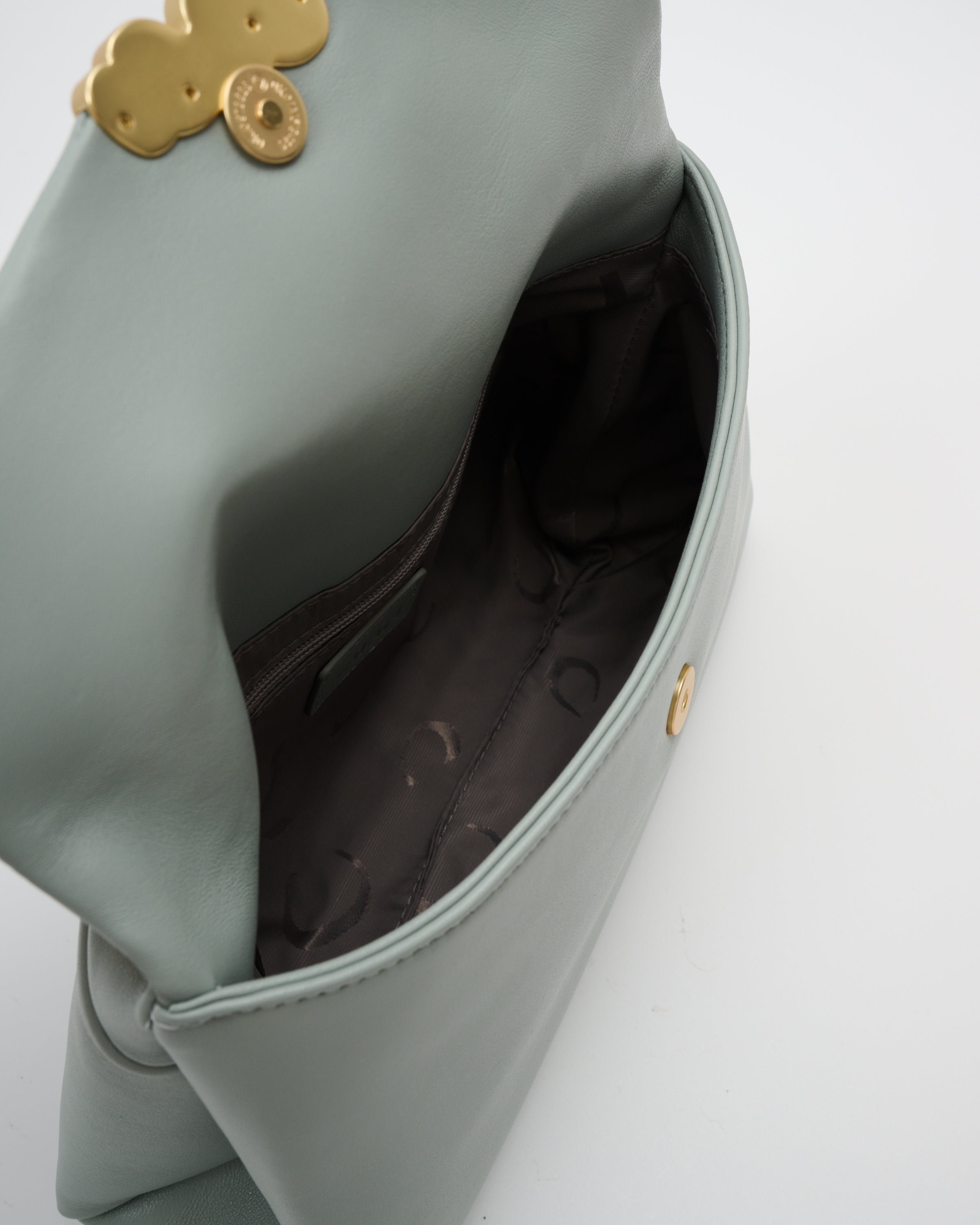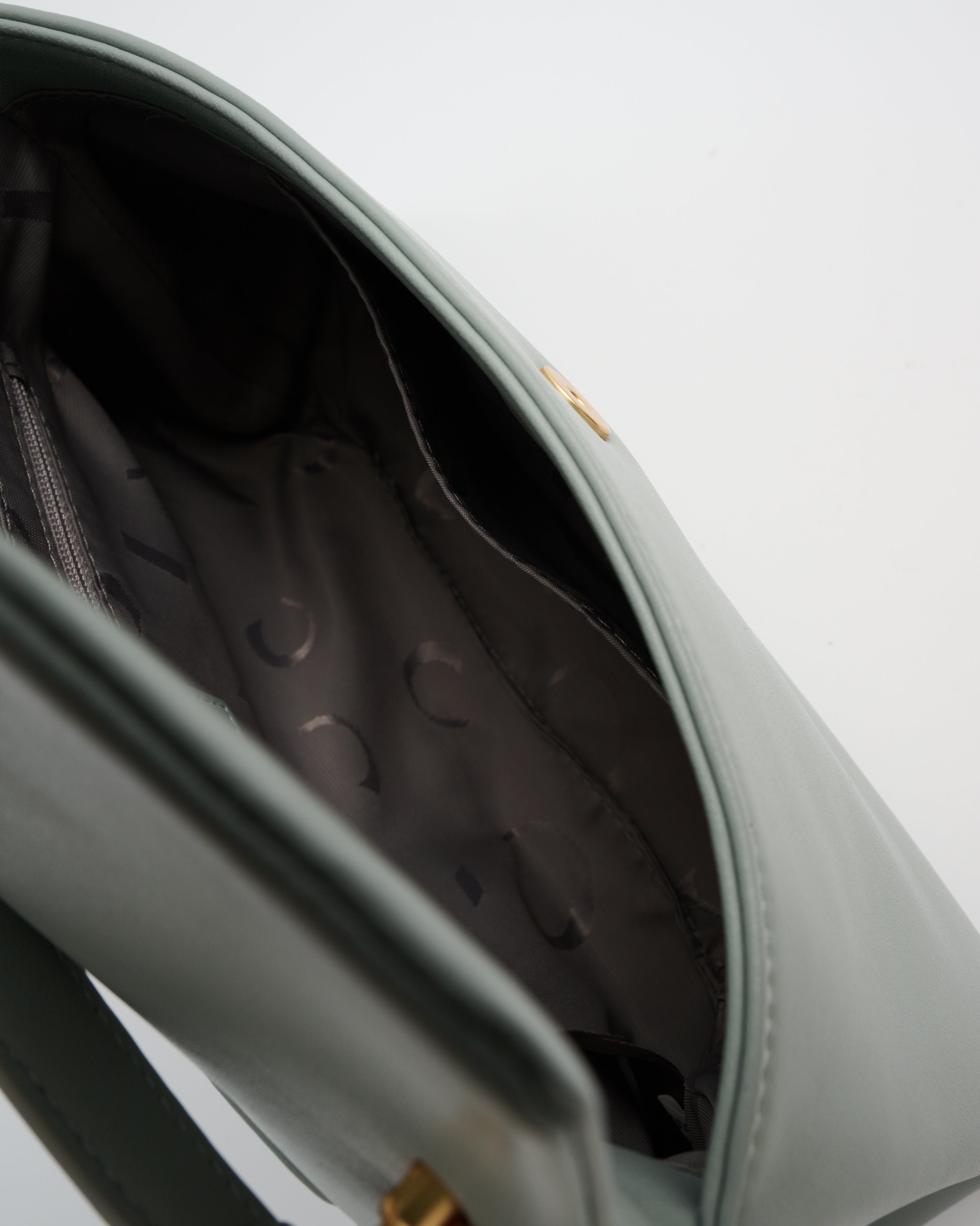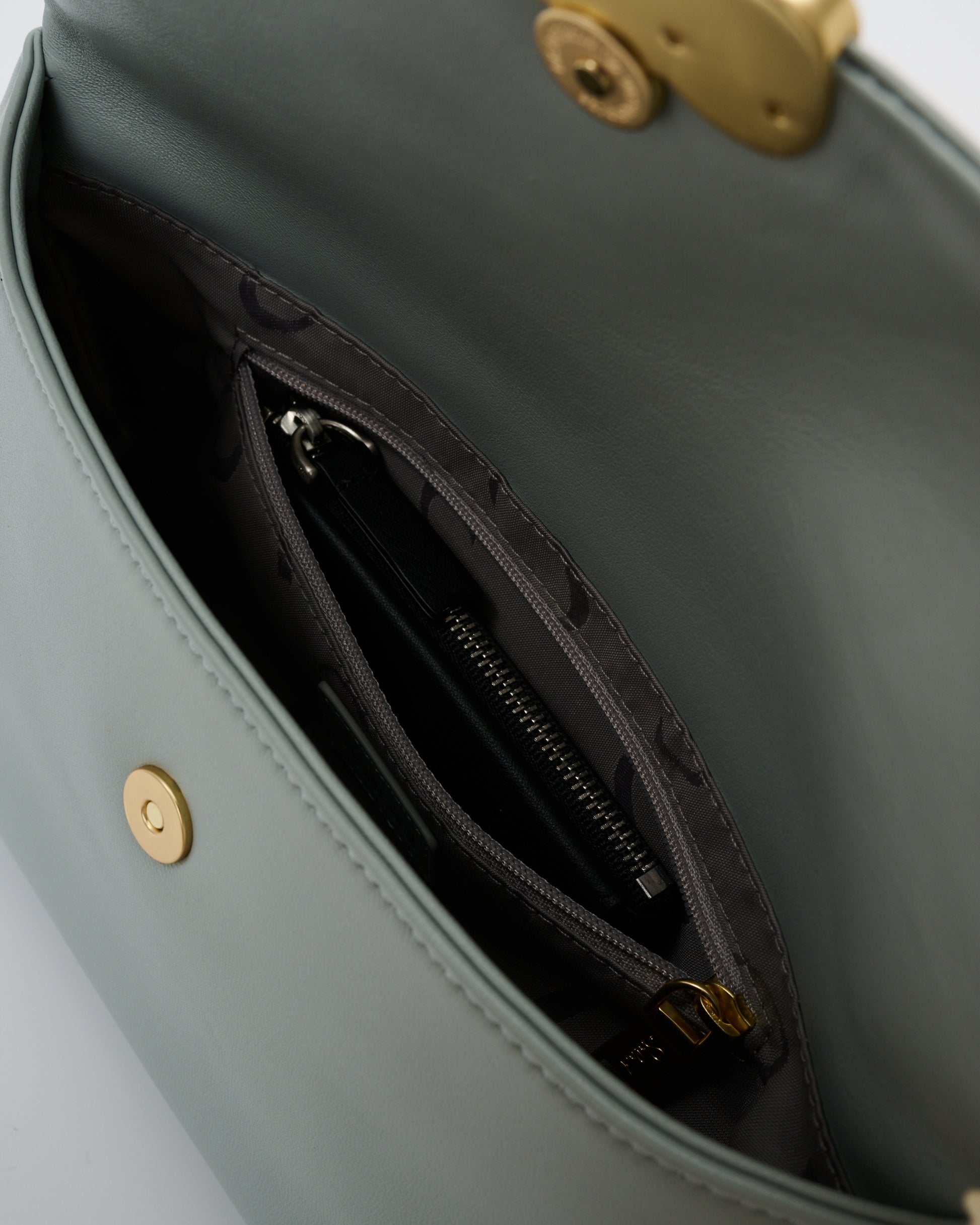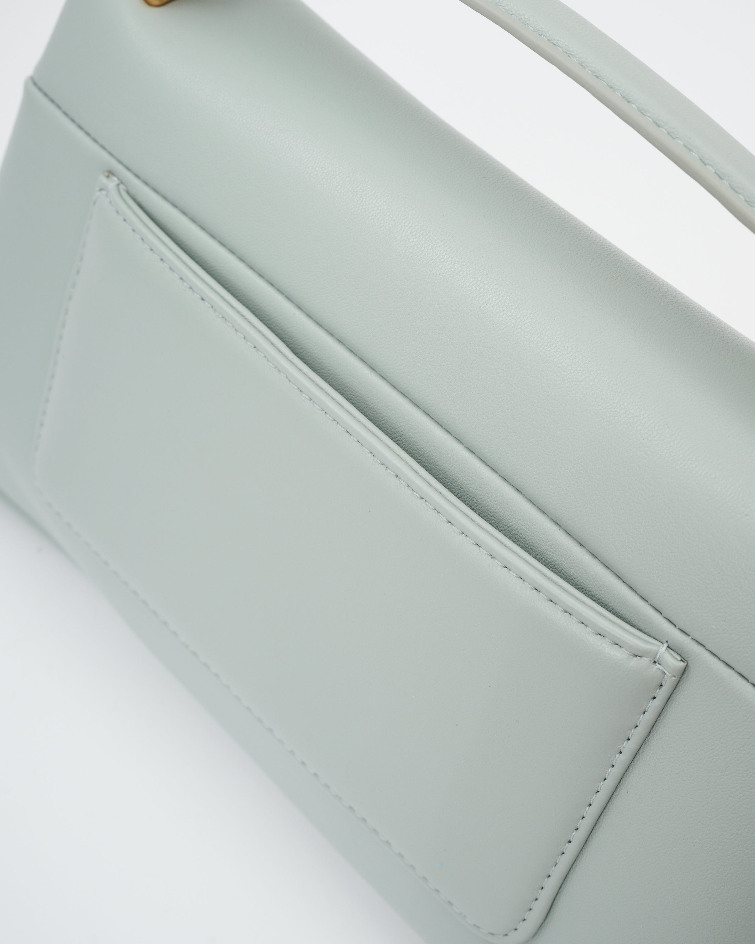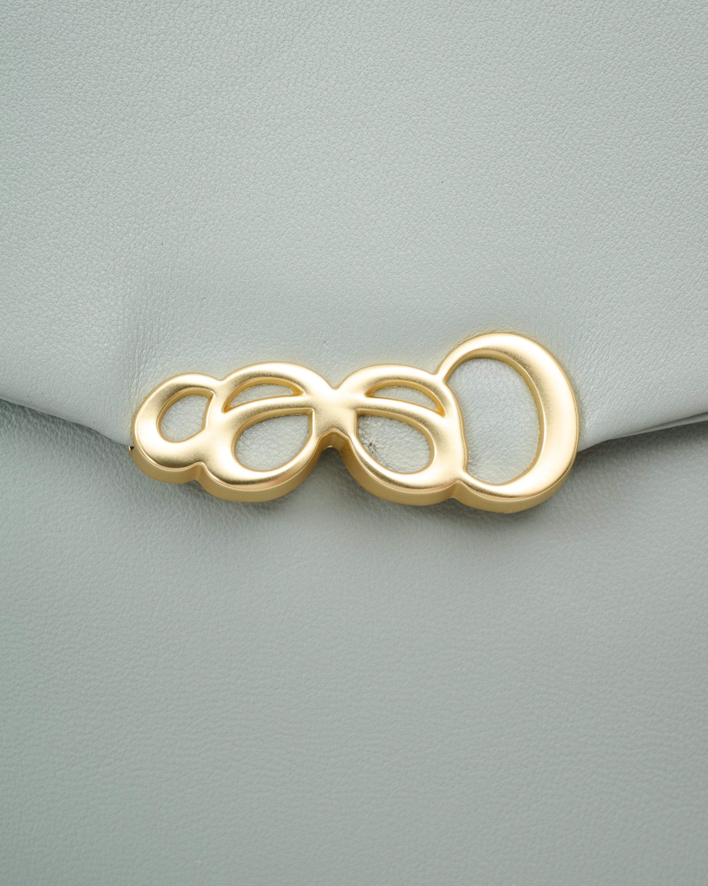 袋前幅裝飾有品牌金屬扣,增添時尚感