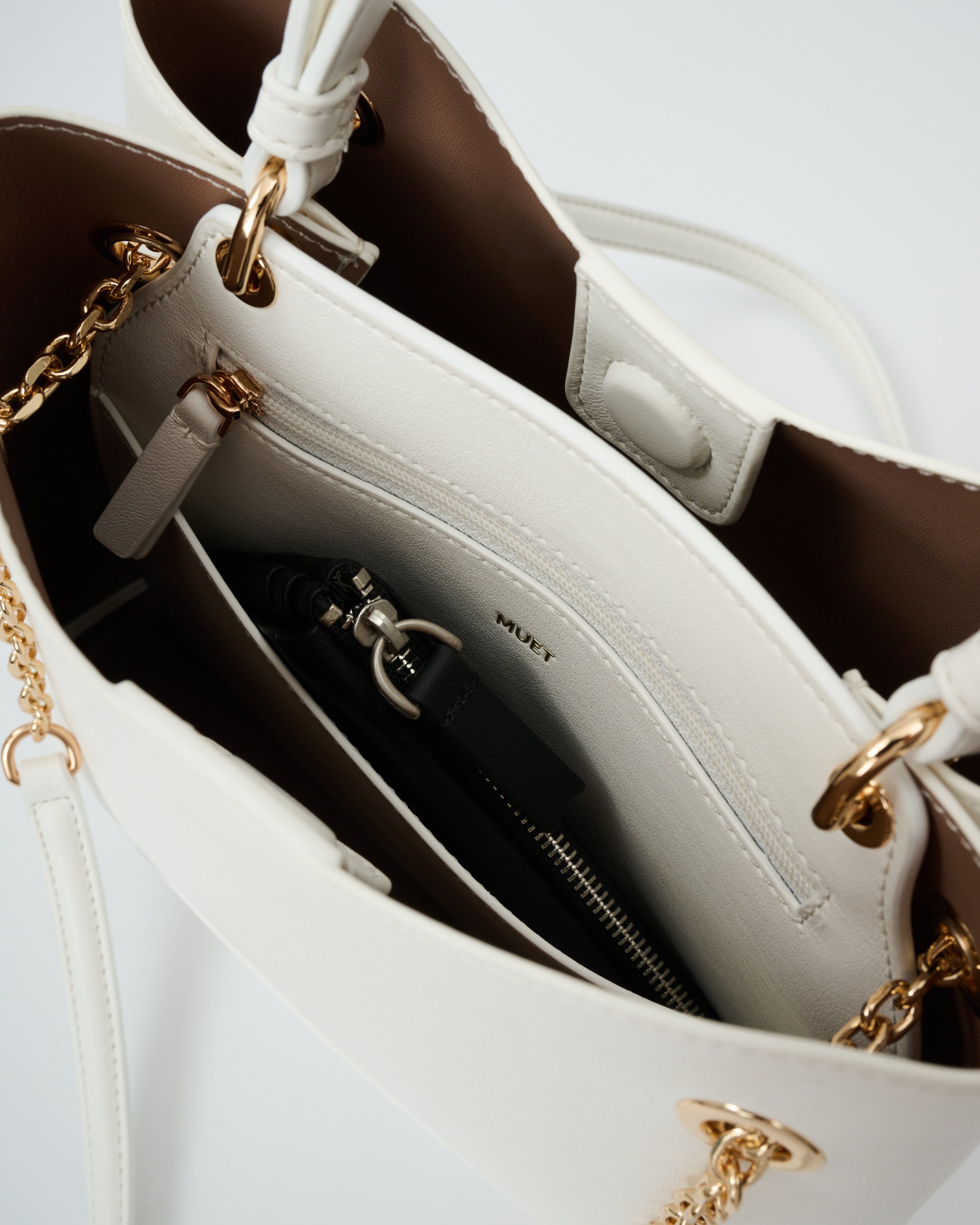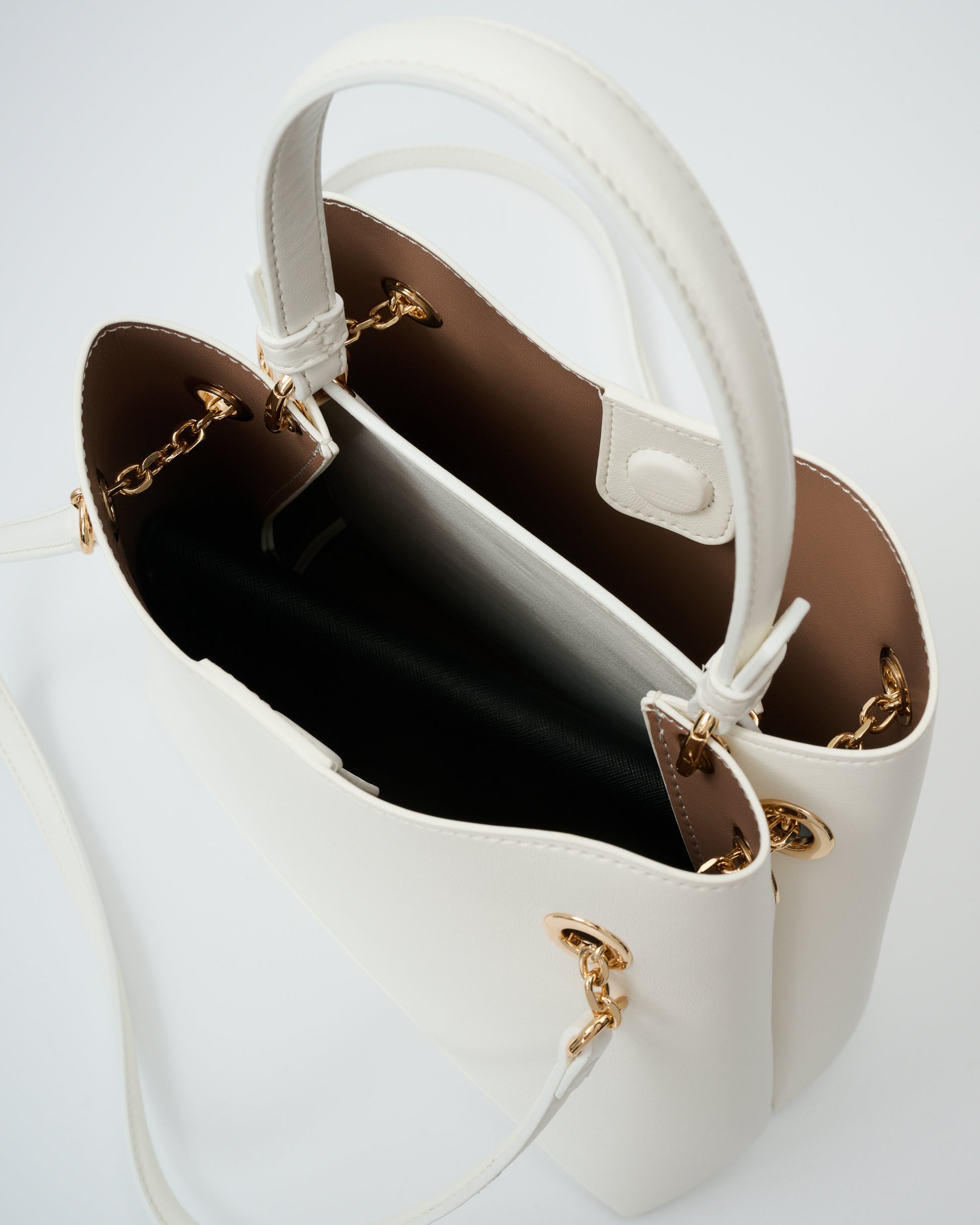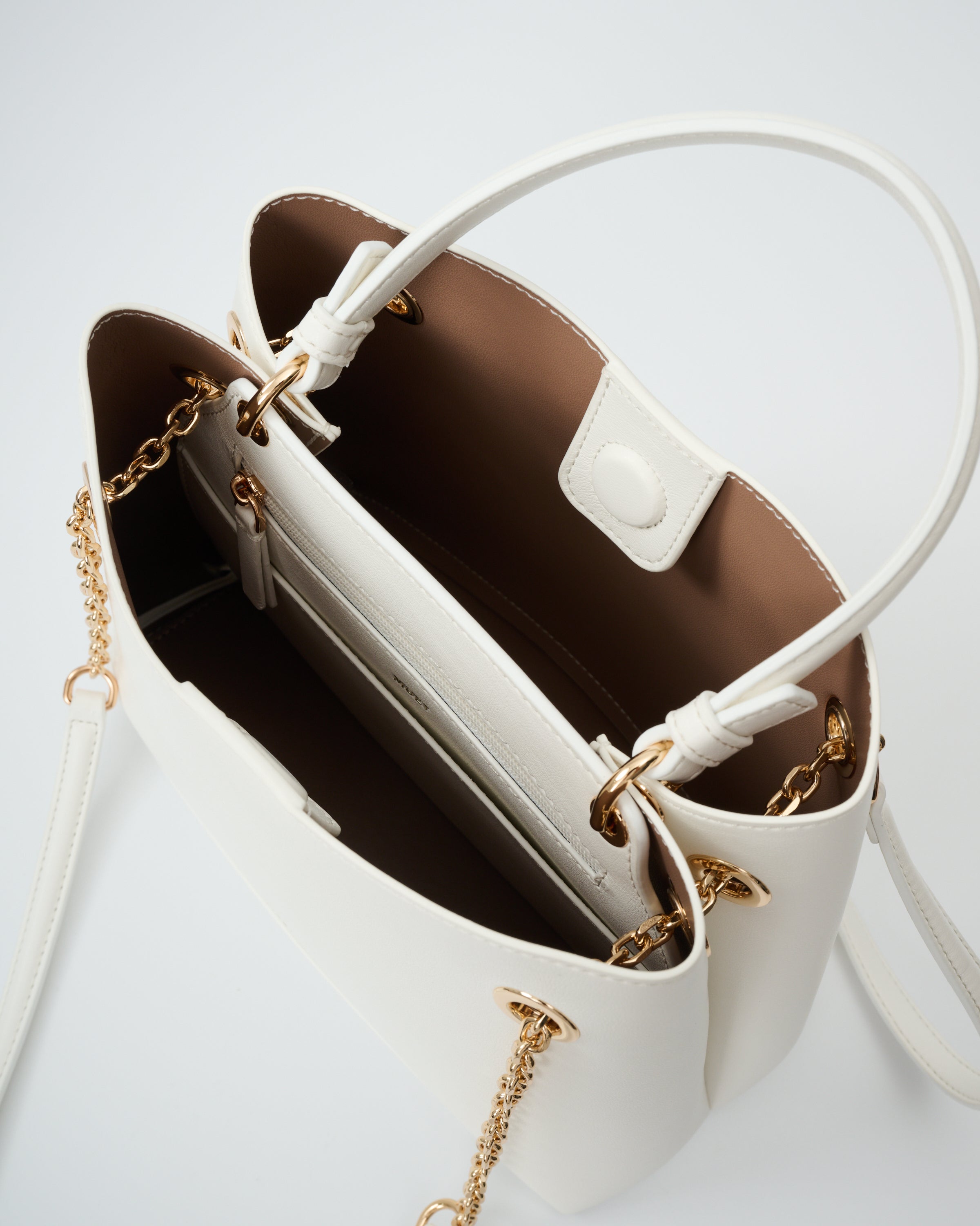 • 附有飾鏈皮革肩帶,增添時尚感