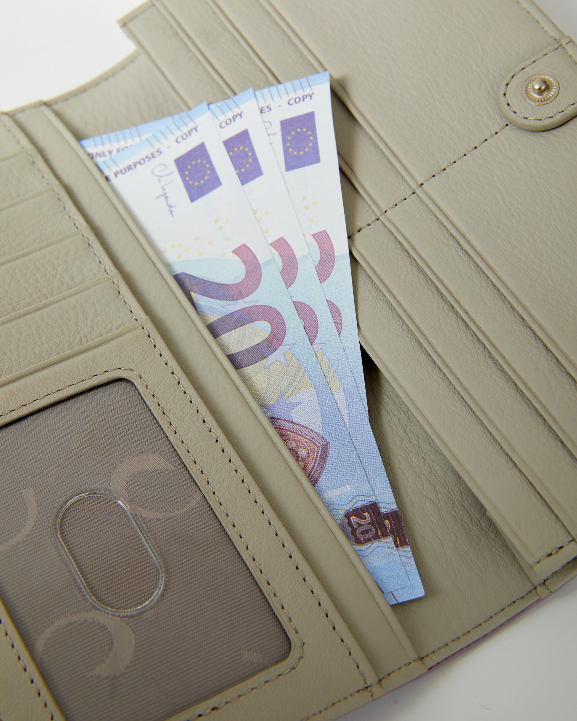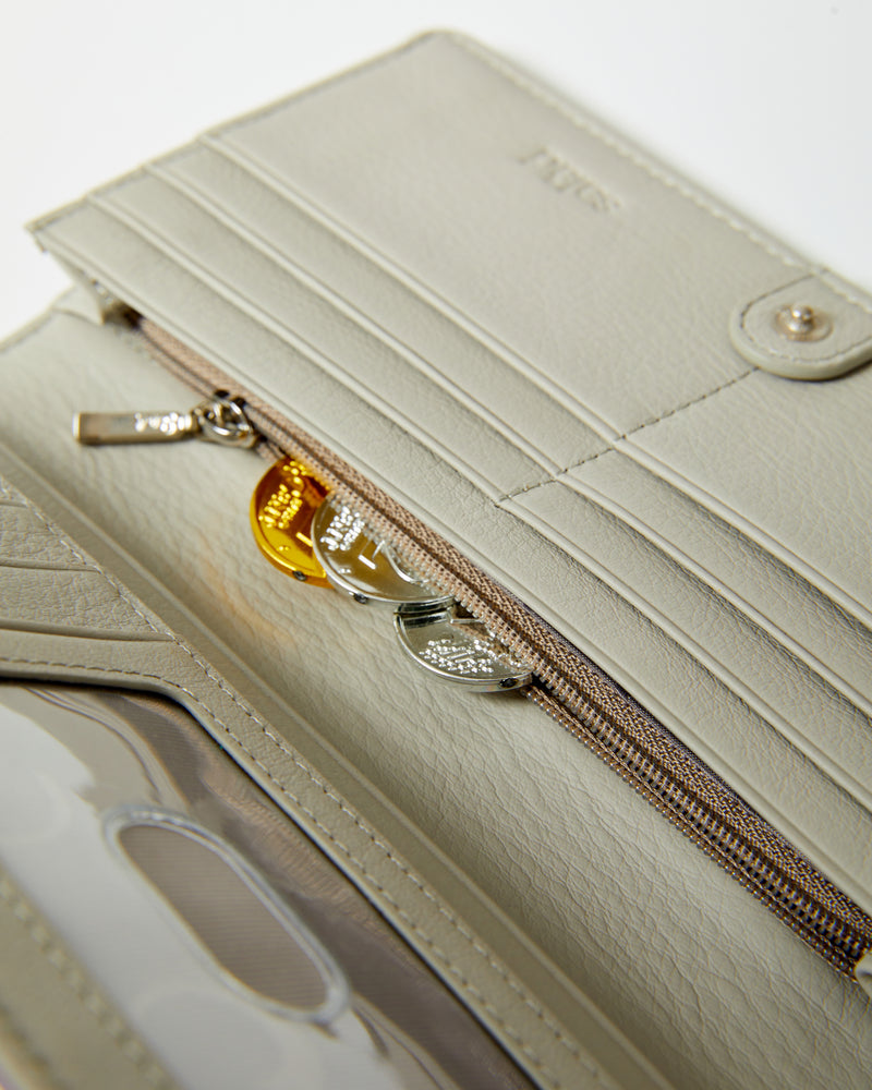 • 內格有四個直插卡套, 六個橫插卡套, 一個鈔票夾層, 三個鈔票插套, 一個透明相插套, 一個拉鍊內袋