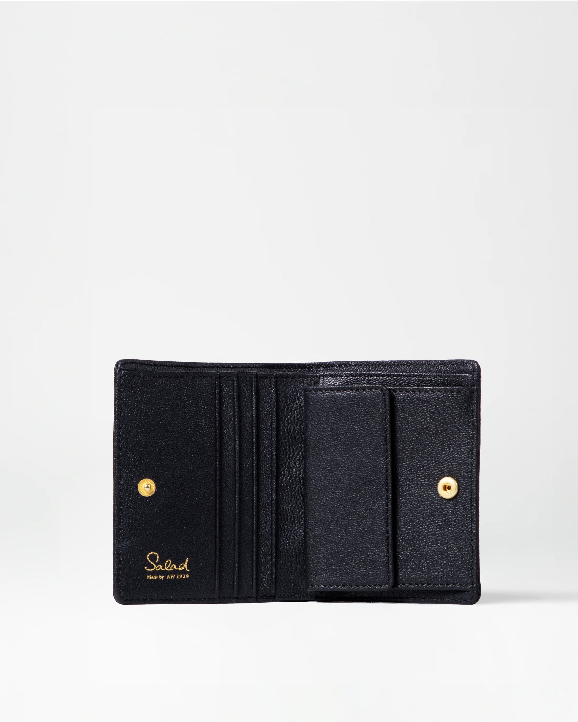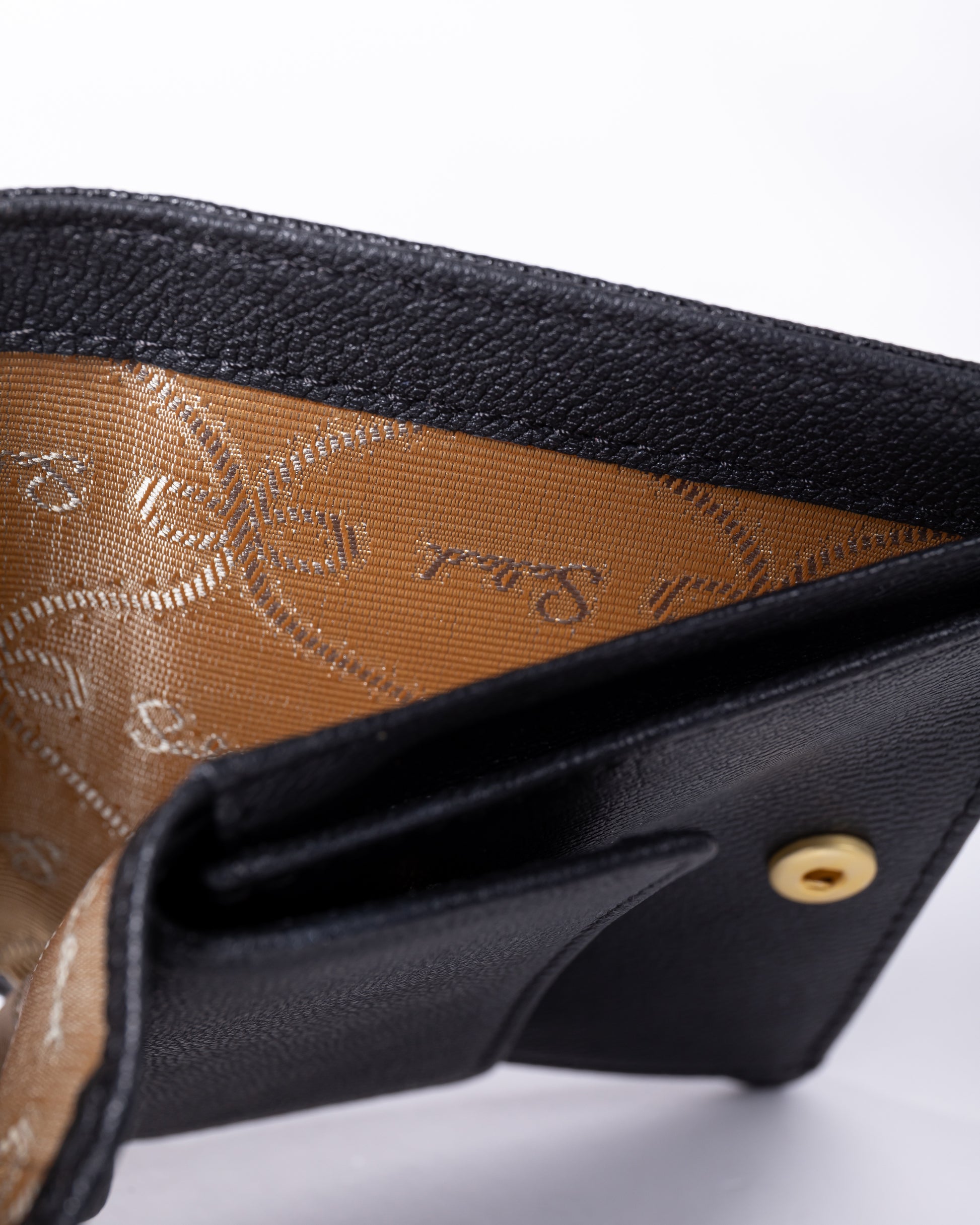 長期熱賣款式; 輕便、薄身銀包; 內層有一個鈔票隔層、按釦及角撐式零錢袋和四個信用卡夾層主料